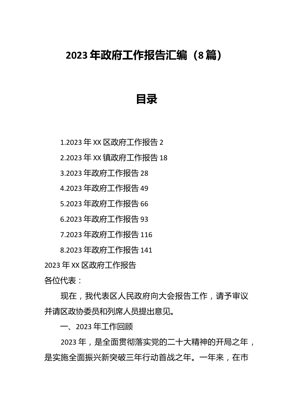 2023年政府工作报告汇编(8篇)目录1.2023年XX区政府工作报告22.2023年XX镇政府工作报告183.2023年政府工作报告284.2023年政府工作报告495.2023年政府工作报告666.2023年政府工作报告937.2023年政府工作报告1168.2023年政府工作报告1412023年XX区政府工作报告各位代表:现在,我代表区人民政府向大会报告工作,请予审议并请区政协委员和列席人员提出意见。一、2023年工作回顾2023年,是全面贯彻落实党的二十大精神的开局之年,是实施全面振兴新突破三年行动首战之年。一年来,在市委、市政府和区委的坚强领导下,在区人大、区政协的监督支持下,我们全面贯彻落实习近平总书记关于东北、辽宁、抚顺振兴发展的重要讲话和指示精神,特别是在新时代推动东北振兴座谈会上的重要讲话精神,紧紧围绕全面振兴新突破三年行动工作部署,顶住外部压力、克服内部困难,着力优结构、扩投资、提信心、防风险,推动经济实现质的有效提升和量的合理增长,经济运行全面企稳回升、整体明显向好,全面振兴新突破迈出坚实步伐。预计全年,地区生产总值增长5%,规模以上工业增加值增长2%,固定资产投资增长10%,社会消费品零售总额增长6%,一般公共预算区级收入增长5.5%,城镇居民人均可支配收入增长5.5%。一年来,我们主要做了以下七个方面的工作:(一)迎难而上抓统筹、稳增长,发展动能有效释放工业实力持续壮大。坚定不移落实“生态立区、产业强区、项目兴区”发展战略,全年新增规模以上工业企业7家,区域内瞪羚企业达11家,雏鹰企业25家,高新技术企业63家,科技型中小企业61家,各项数据均位列全市首位,科技创新能力不断增强。扎实推进结构调整“三篇大文章”,东科电解液、隆腾负极材料等项目稳步推进,新能源、高端精细化学品、化工新材料等新兴产业集群加快形成。高新区电解液及隔膜材料产业集群被认定为国家中小企业特色产业集群,并入选国家级绿色工业园区,东联安信、威尔达被认定为国家级绿色工厂,实现全市国家级绿色制造单位“零”的突破。农业发展逐步加快。坚决扛牢粮食安全政治责任,完成保护性耕作项目6547亩,投资4380万元完成高标准农田建设项目3.5万亩,粮食产量达6.5万吨。启动紫花现代农业产业园项目建设,先后注册了上年草莓、萝卜坎香瓜、铁背山葡萄、午久山野菜等特色农产品品牌,种植面积达2万亩以上,特色农产品知名度和市场竞争力不断提升,一乡一业的特色产业格局持续向好。服务业水平不断提升。千方百计提振消费,年货大集助农直播、购车节、美食节等系列活动火热开展,消费热度持续升温。培育壮大市场主体,抚顺石油化工、辽电运营等11户服务业企业实现升规。高质量完成第五次全国经济普查清查工作,与“四经普”相比,市场主体增长62.4%。成功举办冰雪旅游季活动,接续开展香瓜品鉴节、葡萄采摘节等特色农旅活动,全年旅游接待521万人次、收入达XX亿元,创历史新高。(二)全力以赴抓机遇、扩投资,项目建设提速增效项目建设提质提速。制定实施《XX全面振兴新突破项目建设实施方案》,明确目标,细化措施,狠抓落实,连续三年全市重点项目开复工仪式在我区举行。全年开复工亿元以上项目25个,完成投资XX亿元,同比增长33%,锦盛药业、祥顺气体等37个项目开工建设,达路旺、隆腾新材料等35个项目投产达效,特别是投资XX亿元的抚顺石化油蜡联产项目,实现当年建设当年投产,为打造世界级石蜡基地,实现全区经济社会高质量发展提供了坚强保障。招商引资质效双升。统筹利用区位优势、产业优势、资源优势,开展产业链招商、以商招商,仕通达新材料、绿城环保等12个项目签约落地,投资总额达百亿元以上。特别是近年来全省最大的民营投资产业项目,投资XX亿元的辽宁三木2×35万吨苯酚丙酮产业链项目已顺利举办奠基仪式,延链强链取得新突破。突出大央企、大民企招商洽谈,高新区承办新能源产业、石蜡深加工等发展合作交流会,全年实际利用外资XX万美元,居全市首位。向上争取成效显著。围绕新增中央投资及增发国债,包装项目46个,新增资金需求XX亿元。城市燃气管网改造、高新区高端精细化学品产业基地等10个项目累计争取专项资金3.3亿元,幸福河湖项目成为全市唯一列入国...