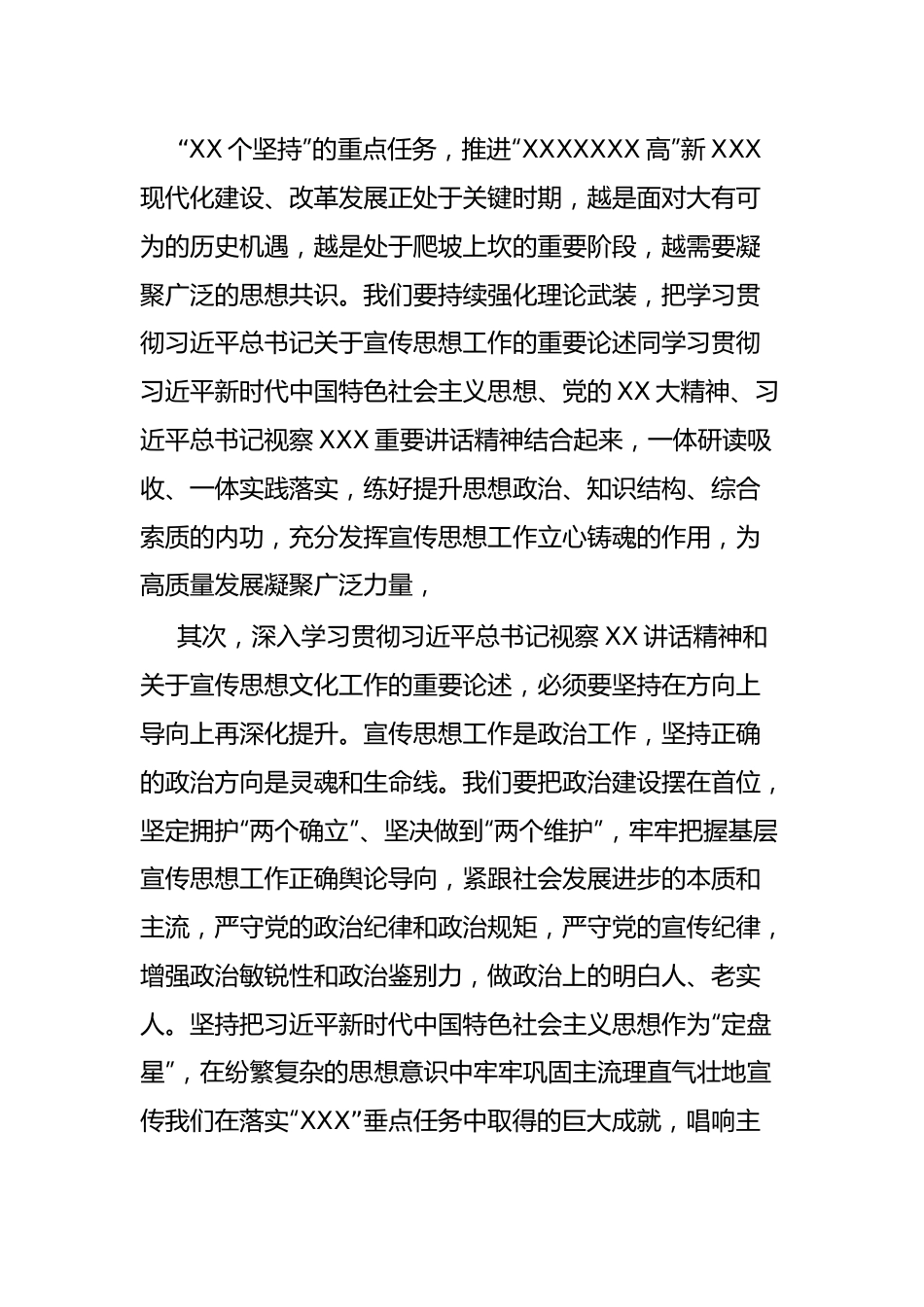 在2023年第三季度宣传思想文化工作推进会上的发言各位领导、同志们:聚焦第三季度宣传思想文化工作推进会的主题,向大家报告交流关于“如何在总书记视察XX讲话中找准工作坐标方位,全力以赴推进新时期基层宣传工作”的几点思考,近期,通过原原本本学、融会贯通学、联系实际学,深感习近平总书记视察XX重要讲话站和习近平总书记关于宣传思想工作的里要论述站位总揽全局、视野高远、内涵XXX富、思想精深,特别是对新思想新观点新论断作了精辟概括,为宣传思想工作举旗定向、立柱架梁,体现了恢宏的战略眼光、深邃的政治考量、强烈的历史担当,不仅是对XXX富实践、宝贵经验的深刻总结,更是指导新形势下党的宣传思想工作的纲领性文献,我们要紧密联系基层宣传思想工作实际,常学常新、学思践悟、知行合一,切实增强做好新形势下宣传思想工作的政治自觉、思想自觉和行动自觉。首先,深入学习贯彻习近平总书记视察XX讲话精神和关于宣传思想文化工作的里要论述,必须要坚持在思想上认识上再深化提升。习近平总书记在不同场合多次强调宣传思想工作的重要性,深刻指出意识形态工作是党的一项极端重要的工作。前不久,总书记亲临XXX视察,为我们发展和各项工作指明了方向、路径。当前,XX委XX届XX次全会明确了“XX个坚持”的重点任务,推进“XXXXXXX高”新XXX现代化建设、改革发展正处于关键时期,越是面对大有可为的历史机遇,越是处于爬坡上坎的重要阶段,越需要凝聚广泛的思想共识。我们要持续强化理论武装,把学习贯彻习近平总书记关于宣传思想工作的重要论述同学习贯彻习近平新时代中国特色社会主义思想、党的XX大精神、习近平总书记视察XXX重要讲话精神结合起来,一体研读吸收、一体实践落实,练好提升思想政治、知识结构、综合索质的内功,充分发挥宣传思想工作立心铸魂的作用,为高质量发展凝聚广泛力量,其次,深入学习贯彻习近平总书记视察XX讲话精神和关于宣传思想文化工作的重要论述,必须要坚持在方向上导向上再深化提升。宣传思想工作是政治工作,坚持正确的政治方向是灵魂和生命线。我们要把政治建设摆在首位,坚定拥护“两个确立”、坚决做到“两个维护”,牢牢把握基层宣传思想工作正确舆论导向,紧跟社会发展进步的本质和主流,严守党的政治纪律和政治规矩,严守党的宣传纪律,增强政治敏锐性和政治鉴别力,做政治上的明白人、老实人。坚持把习近平新时代中国特色社会主义思想作为“定盘星”,在纷繁复杂的思想意识中牢牢巩固主流理直气壮地宣传我们在落实“XXX”垂点任务中取得的巨大成就,唱响主旋律.提振精气神。同时,要突出问题导向,尤其是紧紧盯牢当前基层群众喜闻乐见的抖音、微信、微博等自媒体平台,抓住互联网新媒体舆情掌控这一工作难点重点,有针对性地完善舆情信息收集、报送机制,健全完善网络综合治理体系,把严防负面网络舆情的“网”织细织牢织密,推动外在“管网”向内在“治网”转变,让正能量的声音响彻网络、深入人心。最后,深入学习贯彻习近平总书记视察XX讲话精神和关于宣传思想文化工作的重要论述,必须要坚持在方法上举措上再深化提升。总书记对宣传思想工作应该坚持什么、反对什么,形势怎么看、任务怎么干,工作如何布置、问题如何处理,都部署非常全面、论述非常深刻、要求非常明确,作为基层宣传部长,我们要用情领会、用心思考、用力落实。要更加注重守正,把“守方向、守立场、守根脉、守底线”有机统一起来,稳妥有序推进“我们的中国梦一文化进万家”活动,大力开展全民阅读,持续深化“书香XXX”的文化底蕴,在思想意识中牢牢巩固主流。要更加注重创新,深刻领会总书记关于“以学促干”的最新指示,立足XXXXXXXXX资源优势和文化底蕴,深挖XXXXXX革命遗址背后的故事,塑造XXX教育的优势资源,探索延伸一批具有地域特色的宣传品牌,打好特色牌、优势仗,找准找实“最优解”。发言完毕,谢谢!不当之处,请大家批评指正。