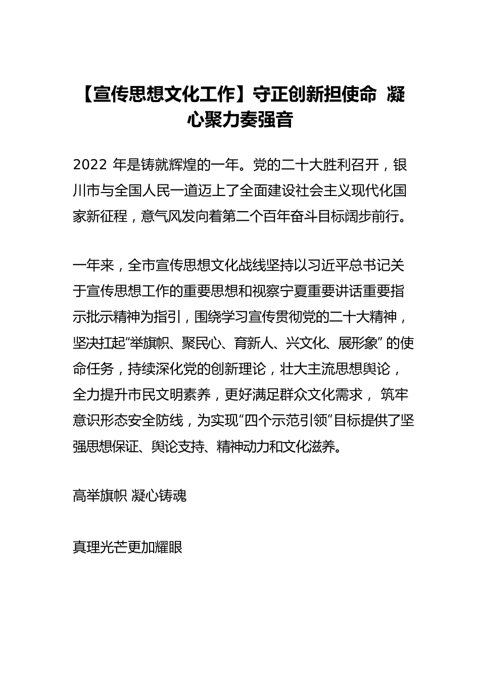 【宣传思想文化工作】守正创新担使命凝心聚力奏强音2022年是铸就辉煌的一年。党的二十大胜利召开,银川市与全国人民一道迈上了全面建设社会主义现代化国家新征程,意气风发向着第二个百年奋斗目标阔步前行。一年来,全市宣传思想文化战线坚持以习近平总书记关于宣传思想工作的重要思想和视察宁夏重要讲话重要指示批示精神为指引,围绕学习宣传贯彻党的二十大精神,坚决扛起“举旗帜、聚民心、育新人、兴文化、展形象”的使命任务,持续深化党的创新理论,壮大主流思想舆论,全力提升市民文明素养,更好满足群众文化需求,筑牢意识形态安全防线,为实现“四个示范引领”目标提供了坚强思想保证、舆论支持、精神动力和文化滋养。高举旗帜凝心铸魂真理光芒更加耀眼科学理论,闪耀真理的光芒;伟大思想,激发奋进的力量。一年来,全市宣传思想文化战线把学习宣传贯彻习近平新时代中国特色社会主义思想作为首要政治任务,与学习宣传贯彻党的二十大精神有机结合,广泛开展“大学习、大讨论、大宣传、大实践”活动,引导全市上下把思想和行动统一到党的二十大精神上,把智慧和力量凝聚到党的二十大确定的各项任务上。强化理论武装,凝聚奋进之力——抓牢“关键少数”,带动“绝大多数”,市委常委会(扩大)会议、理论学习中心组学习会接连召开,示范带动形成“头雁”效应,自上而下层层深入,促进学习质量全面提升。制定出台《关于认真学习宣传贯彻党的二十大精神的实施意见》,构建起“1+N”学习宣传贯彻体系,统筹新闻、理论、宣传教育、文艺宣传、网络宣传,全方位、多角度、高密度开展学习宣传阐释活动,深刻领悟“两个确立”的决定性意义,增强“四个意识”、坚定“四个自信”,提升信仰度、增强忠诚度,推动习近平新时代中国特色社会主义思想全民学习、全民武装、全民信仰、全民实践,不断夯实“两个维护”的思想根基。广泛宣传宣讲,增强价值认同——百姓炕头、小区廊亭、生产线上,一次次生动实践、一次次创新探索,切实推动党的二十大精神在基层落地生根、开花结果。在社区、农村,深入挖掘基层优质宣讲资源,吸收各级宣讲骨干、道德模范、优秀青年代表、“草根名嘴”等组建宣讲分队,用浅显易懂的语言把党的二十大精神讲到群众心坎里。在机关、学校,对党的二十大提出的新思想新论断、作出的新部署新要求进行系统解读和深入阐释,从理论和实践相结合、历史与现实相贯通的角度,充分联系党情、国情、世情,围绕“时代与使命”“梦想与机遇”“奋斗与担当”,勉励广大青年做有理想、有本领、有担当的有用之才、栋梁之才。各行业领域发挥优势,积极整合优质资源组建宣讲队,在本行业本领域开展宣传宣讲。银川团市委“云团课”、金凤区上海西路街道馨和苑社区“廊亭宣讲会”、市公交公司“车厢课堂”等特色做法在全市宣传推广。党的二十大报告指出:“意识形态工作是为国家立心、为民族立魂的工作。”全市宣传思想文化战线坚持马克思主义在意识形态领域指导地位的根本制度,加强新闻、学校、网络、文化等阵地建设,坚决维护意识形态安全底线,牢牢掌握意识形态工作的领导权、管理权、话语权,切实推动意识形态工作责任制落到实处,意识形态领域保持向上向好态势。壮大主流奏响强音奋进力量更加昂扬2022年是极不平凡的一年,全市宣传思想文化战线立体呈现十年来的巨变与跨越,为统筹疫情防控和经济社会发展营造良好氛围,让思想伟力激荡银川,让党心民心极大凝聚。强化正面宣传,提振加快发展精气神——围绕中心、服务大局,创新开设“建设创新发展引领市”“聚力三新产业打造两都五基地”等专题专栏,集中开展主题宣传、典型宣传、成就宣传,主流舆论声音传播得更加强劲有力。积极回应社会关切,跟踪做好交通疏堵“6+N”、解决18万户群众拆迁房办证难等“十心实事”宣传报道,及时对疫情防控等群众关心关注的问题进行回应,营造了共同抗疫、团结奋斗、共克时艰的浓♘氛围。稳步推进媒体深度融合,提升县级融媒体中心建设水平,获批全国地市级融媒体中心试点。借船出海塑精品,展示大美银川新形象——党的二十大代表杨彦锋走上央视《新闻联播》“党代表通道”接受采访,《奋进新征程...