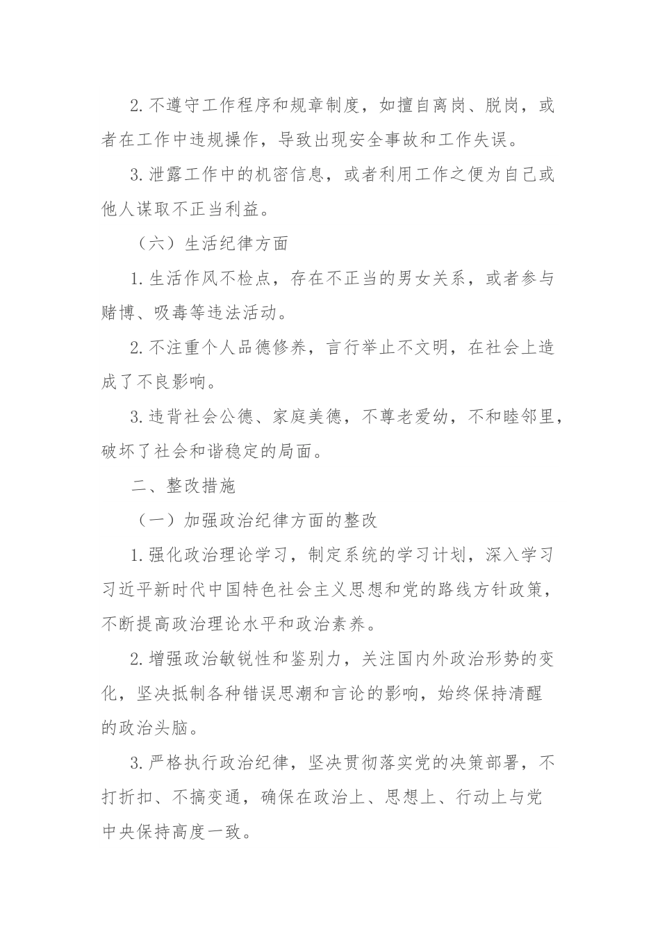 党纪学习教育民主生活会“六大纪律”对照检查材料(存在的问题及整改措施)党的六大纪律包括政治纪律、组织纪律、廉洁纪律、群众纪律、工作纪律和生活纪律,是全体党员必须遵守的行为准则。经过认真查摆,个人存在如下问题,并制定了整改措施。一、存在的问题(一)政治纪律方面1.政治理论学习不够深入,对党的最新理论成果和方针政策缺乏系统的学习和理解,导致在工作中不能准确把握政治方向,贯彻落实党的决策部署不够坚决有力。2.对一些敏感政治问题缺乏敏锐性和鉴别力,容易受到错误思潮和言论的影响,甚至在一定程度上传播和扩散不良信息。3.执行政治纪律不够严格,在一些重大原则问题上立场不够坚定,存在打折扣、搞变通的现象。(二)组织纪律方面1.不严格执行党的组织制度,如不按时参加党组织活动,不认真履行党组织交办的任务,不按规定缴纳党费等。2.不遵守党的民主集中制原则,在党组织讨论决策时,不充分发表意见,或者独断专行,不尊重集体决策的结果。3.不按规定报告个人有关事项,如个人的婚姻变化、财产状况、子女就业等情况,存在隐瞒不报或不如实报告的现象。(三)廉洁纪律方面1.利用职务之便为自己或他人谋取私利,如收受礼品礼金、违规经商办企业、插手工程项目等。2.违反廉洁从政的规定,超标准配备办公设备、乘坐交通工具,或者在公务活动中铺张浪费、公款吃喝等。3.不严格遵守廉洁自律的各项规定,如违规占用公共资源、违规兼职取酬等。(四)群众纪律方面1.对群众的诉求和意见重视不够,敷衍塞责,推诿扯皮,导致群众的问题长期得不到解决,损害了群众的利益。2.在工作中存在形式主义、官僚主义的问题,不深入基层了解实际情况,制定的政策和措施不符合群众的需求和实际情况。3.对待群众态度冷漠,服务意识淡薄,存在门难进、脸难看、事难办的现象,严重影响了党和政府在群众中的形象。(五)工作纪律方面1.工作责任心不强,敷衍了事,工作效率低下,不能按时完成工作任务,影响了工作的整体进度和质量。2.不遵守工作程序和规章制度,如擅自离岗、脱岗,或者在工作中违规操作,导致出现安全事故和工作失误。3.泄露工作中的机密信息,或者利用工作之便为自己或他人谋取不正当利益。(六)生活纪律方面1.生活作风不检点,存在不正当的男女关系,或者参与赌博、吸毒等违法活动。2.不注重个人品德修养,言行举止不文明,在社会上造成了不良影响。3.违背社会公德、家庭美德,不尊老爱幼,不和睦邻里,破坏了社会和谐稳定的局面。二、整改措施(一)加强政治纪律方面的整改1.强化政治理论学习,制定系统的学习计划,深入学习习近平新时代中国特色社会主义思想和党的路线方针政策,不断提高政治理论水平和政治素养。2.增强政治敏锐性和鉴别力,关注国内外政治形势的变化,坚决抵制各种错误思潮和言论的影响,始终保持清醒的政治头脑。3.严格执行政治纪律,坚决贯彻落实党的决策部署,不打折扣、不搞变通,确保在政治上、思想上、行动上与党中央保持高度一致。(二)加强组织纪律方面的整改1.严格遵守党的组织制度,按时参加党组织活动,认真履行党组织交办的任务,按时足额缴纳党费,增强组织观念和纪律意识。2.坚持党的民主集中制原则,在党组织讨论决策时,充分发表意见,尊重集体决策的结果,自觉维护党组织的团结统一。3.如实报告个人有关事项,按照规定及时、准确地向党组织报告个人的婚姻变化、财产状况、子女就业等情况,自觉接受组织的监督。(三)加强廉洁纪律方面的整改1.加强廉洁自律教育,深入学习党纪国法和廉洁从政的各项规定,增强廉洁意识和法制观念,筑牢拒腐防变的思想防线。2.严格遵守廉洁从政的规定,自觉抵制各种诱惑,不利用职务之便为自己或他人谋取私利,不接受礼品礼金和各种形式的贿赂。3.加强对自身廉洁行为的监督,定期进行自我检查和反思,发现问题及时纠正,确保廉洁从政。(四)加强群众纪律方面的整改1.增强群众观念,密切联系群众,主动倾听群众的诉求和意见,积极为群众办实事、解难题,切实维护群众的利益。2.坚决克服形式主义、官僚主义,深入基层调查研究,了解实际情况,制定符合群众需求和实际情况的政策和措施,提高工...