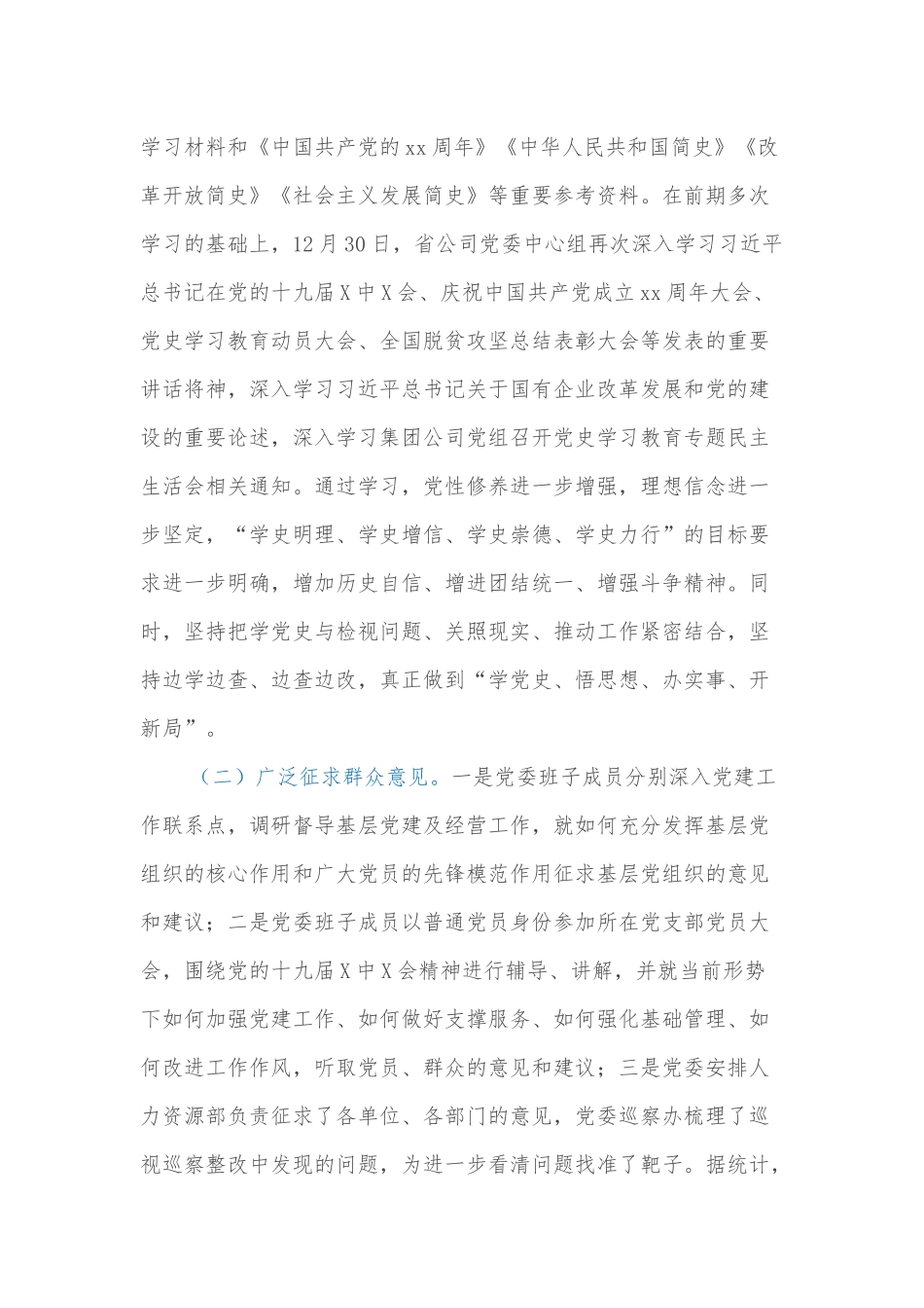 央企党委班子2022年专题民主生活会对照检查材料(五个带头)按照中央和集团公司党组关于认真开好2022年度党史学习教育专题民主生活会的通知要求,中央在xx企业党委严格按照中央部属和地方党委、集团公司党组安排,集中学习党的十九届X中X会精神、习近平总书记在庆祝建党xx周年大会上的重要讲话精神及最新指示批示精神,认真梳理2022年度党员领导干部民主生活会整改落实情况,并形成整改报告。在此基础上,围绕本次专题民主生活会主题,广泛征求意见建议,全面开展谈心谈话。通过群众提、自己找、上级点、互相帮、集体议等方式,认真查摆问题、深入剖析根源,制定整改措施。现对照检查如下:一、2022年度民主生活会准备情况中央在xx企业党委认真学习贯彻召开2022年度党史学习教育专题民主生活会相关要求,扎实开展专题学习研讨,广泛征求意见,认真查摆突出问题,为召开专题民主生活会奠定了坚实基础。(一)扎实开展学习。中央在xx企业党委以习近平新时代中国特色社会主义思想为指导,持续深入学习贯彻习近平总书记重要讲话和指示批示精神、党的十九大和十九届历次全会精神。原汁原味学习习近平《论中国共产党历史》《毛泽东、邓小平、江泽民、胡锦涛关于中国共产党历史论述摘编》《中国共产党简史》等指定学习材料和《中国共产党的xx周年》《中华人民共和国简史》《改革开放简史》《社会主义发展简史》等重要参考资料。在前期多次学习的基础上,12月30日,省公司党委中心组再次深入学习习近平总书记在党的十九届X中X会、庆祝中国共产党成立xx周年大会、党史学习教育动员大会、全国脱贫攻坚总结表彰大会等发表的重要讲话将神,深入学习习近平总书记关于国有企业改革发展和党的建设的重要论述,深入学习集团公司党组召开党史学习教育专题民主生活会相关通知。通过学习,党性修养进一步增强,理想信念进一步坚定,“学史明理、学史增信、学史崇德、学史力行”的目标要求进一步明确,增加历史自信、增进团结统一、增强斗争精神。同时,坚持把学党史与检视问题、关照现实、推动工作紧密结合,坚持边学边查、边查边改,真正做到“学党史、悟思想、办实事、开新局”。(二)广泛征求群众意见。一是党委班子成员分别深入党建工作联系点,调研督导基层党建及经营工作,就如何充分发挥基层党组织的核心作用和广大党员的先锋模范作用征求基层党组织的意见和建议;二是党委班子成员以普通党员身份参加所在党支部党员大会,围绕党的十九届X中X会精神进行辅导、讲解,并就当前形势下如何加强党建工作、如何做好支撑服务、如何强化基础管理、如何改进工作作风,听取党员、群众的意见和建议;三是党委安排人力资源部负责征求了各单位、各部门的意见,党委巡察办梳理了巡视巡察整改中发现的问题,为进一步看清问题找准了靶子。据统计,共收到各类意见和建议114条,经归纳整理为103条。通过征求意见和建议,进一步为专题民主生活会聚焦了找问题方向、明确了改问题的抓手,同时也在省市两级管理层进一步涵养了“红脸出汗”的浓厚政治氛围。(三)深入开展谈心谈话。一是领导班子开展“三必谈”,党委书记、总经理xxx同志同班子每个成员、班子成员之间、班子成员与分管单位(部门)主要负责同志多次谈心;二是党委班子成员深入联系点单位开展谈心谈话;三是党委班子成员接受党员和群众约谈,先后与所属支部普通党员及群众和本部员工进行谈心谈话,认真听取意见建议。(四)认真撰写对照检查材料。一是xxx同志负责主持起草领导班子对照检查材料,对照关于开好2022年度党史学习教育专题民主生活会中五个方面,逐条听取班子成员意见,并集体深入剖析根源、认清实质,提出整改的具体措施,在征求各方面意见的基础上对材料进行修改;二是每位班子成员结合学习研讨心得、个人实际、交心谈心情况和前期征集的意见建议,自己动手撰写对照检查材料,检视党性锻炼的不足,逐一提出整改措施;三是xxx同志认真审阅每一位班子成员的对照检查材料,提出具体的修改意见。通过认真撰写对照检查材料,领导班子及成员进一步找准查实了存在的问题,明确了整改和努力方向,增强了开展批评与自我批评的针对性。结合前期工作...