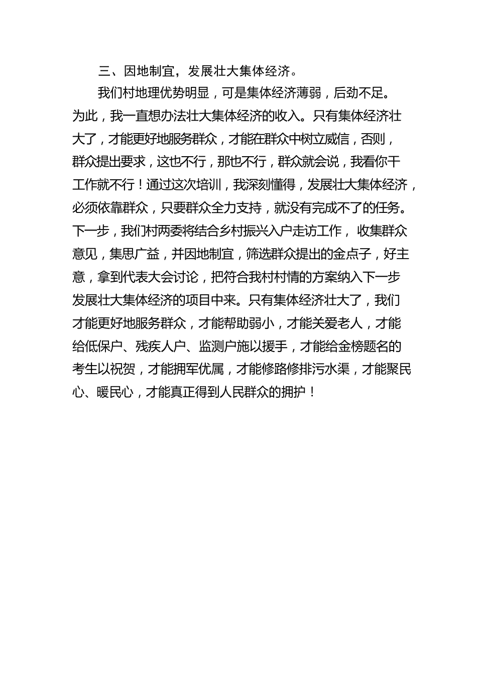 XX村支书参加全国村党组织书记和村委会主任视频培训会的心得体会2023年X月24日至28日,我有幸参加了全国村党组织书记和村委会主任视频培训会,通过这五天的培训,对我触动很大。这五天的培训会议,不仅听到了中央组织部领导和和中央党校教授专家等的授课,还听到了来自全国东中西不同地区优秀村党组织书记的演讲交流。教授专家的授课为我们今后的工作提供了大量的理论知识,并为我们回村工作指明了方向。来自全国15位优秀村党组织书记的演讲交流发言,给我们的工作增强了信心,鼓足了干劲。下面,我从三个方面简述这次培训的心得体会:一、抓好班子,带好队伍,增强村党组织的战斗堡垒作用。我始终坚信,只有带好两委班子,才能顺利有序地开展各项工作。作为村党组织书记,必须遇到困难率先上,遇到荣誉让他人。就像李连成书记说的,以“吃亏”的精神把群众紧紧凝聚在一起。李连成书记为了团结好群众,将自己家的400平米小楼推了,把宅基地让给村民的事迹深深打动了我,这得有多大勇气和决心才能做出这么大的牺牲?是誓言。因为他是一名中国共产党员,“随时准备为党和人民牺牲一切”!只有全心全意为人民服务的精神,才能真正团结带领好两委班子,将村党组织建设成攻无不克的战斗堡垒!我们今年将要评选的两名优秀党员是在人居环境治理中,起先锋模范带头作用的两位普通共产党员,他们在村人居环境治理工作中,带头不讲条件地拆除自家旱厕,为我们后面的人居环境整治工作提供了强有力的支持!二、党建引领,提升乡村治理水平。加强组织建设,合理工作分工,各司其职,互相扶持。严把党员发展质量关,将优秀,并愿意扎根农村,热爱农村的青年发展为党员和村级后备干部。我村目前因辞职,缺一位支部委员,经过严格筛选,将一名年轻优秀的共产党员发展为后备干部,我们目前正在计划召开党员大会,推选这位年轻人进入村两委班子。通过这次培训我深刻理解了“村规民约”在进行乡村治理工作中的重要性。我下一步工作,就是要通过村民议事会,认真商量,拟定符合本村的“村规民约”,最后交由村民代表大会审议表决。我们书记今年还有一项重要工作,就是将全村村民入户走访一遍,我要借着这项工作开展的同时,倾听群众提出的各项意见和建议,正如中央组织部领导给我们授课时说的“脚上有多少泥,心中就有多少情”。群众喜欢什么,我们就干什么,群众要我们怎么干,我们就怎么干!通过这次培训,心中也有了底气,和勇气,对于攻坚克难的工作,心中也不再有畏难情绪,就像教授们说的“没有落后的群众,只有落后的干部”。在乡村治理工作中,我将继续迎难而上,坚决把群众思想从一开始的冷眼旁观,不支持,“表面工作”等想法,变成为这项工作“点个赞”!让群众真正的从这项工作中感受到幸福感获得感。三、因地制宜,发展壮大集体经济。我们村地理优势明显,可是集体经济薄弱,后劲不足。为此,我一直想办法壮大集体经济的收入。只有集体经济壮大了,才能更好地服务群众,才能在群众中树立威信,否则,群众提出要求,这也不行,那也不行,群众就会说,我看你干工作就不行!通过这次培训,我深刻懂得,发展壮大集体经济,必须依靠群众,只要群众全力支持,就没有完成不了的任务。下一步,我们村两委将结合乡村振兴入户走访工作,收集群众意见,集思广益,并因地制宜,筛选群众提出的金点子,好主意,拿到代表大会讨论,把符合我村村情的方案纳入下一步发展壮大集体经济的项目中来。只有集体经济壮大了,我们才能更好地服务群众,才能帮助弱小,才能关爱老人,才能给低保户、残疾人户、监测户施以援手,才能给金榜题名的考生以祝贺,才能拥军优属,才能修路修排污水渠,才能聚民心、暖民心,才能真正得到人民群众的拥护!