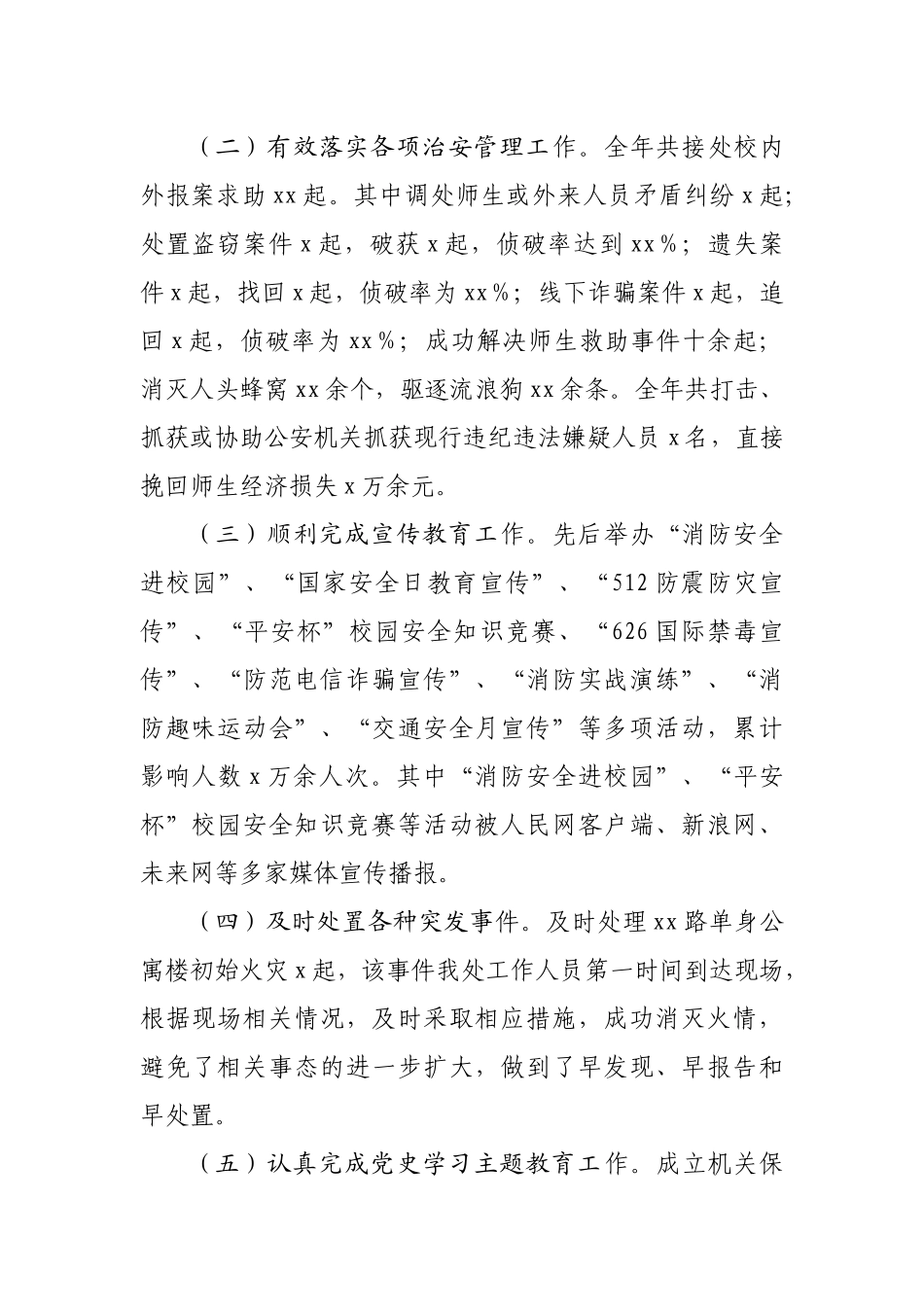 大学各部门2021年述职报告汇编10篇(高校)目录1.保卫处(党委政治保卫部)2021年述职报告.............12.发展规划处(高教研究所)2021年度述职报告.........63.计划财务处2021年度目标任务完成情况报告...........104.教务处2021年度目标考核自评报告...........................155.科研处2021年工作总结...............................................206.离退休人员管理处2021年目标任务完成述职报告..........................................................................................247.人事处2021年工作述职报告.......................................288.审计处2021年目标任务完成情况工作报告...............329.图书馆2021年述职报告...............................................3610.校工会(扶贫工作办公室)2021年度目标任务完成情况自评报告..............................................................40保卫处(党委政治保卫部)2021年述职报告一、目标任务完成情况(一)无重大事故隐患和责任事故。全年我校未发生重、特大火灾事故;无校内重、特大交通安全事故;无重特大刑事和治安案件;无重大影响的群体性事件;校园治安环境稳定有序。(二)有效落实各项治安管理工作。全年共接处校内外报案求助xx起。其中调处师生或外来人员矛盾纠纷x起;处置盗窃案件x起,破获x起,侦破率达到xx%;遗失案件x起,找回x起,侦破率为xx%;线下诈骗案件x起,追回x起,侦破率为xx%;成功解决师生救助事件十余起;消灭人头蜂窝xx余个,驱逐流浪狗xx余条。全年共打击、抓获或协助公安机关抓获现行违纪违法嫌疑人员x名,直接挽回师生经济损失x万余元。(三)顺利完成宣传教育工作。先后举办“消防安全进校园”、“国家安全日教育宣传”、“512防震防灾宣传”、“平安杯”校园安全知识竞赛、“626国际禁毒宣传”、“防范电信诈骗宣传”、“消防实战演练”、“消防趣味运动会”、“交通安全月宣传”等多项活动,累计影响人数x万余人次。其中“消防安全进校园”、“平安杯”校园安全知识竞赛等活动被人民网客户端、新浪网、未来网等多家媒体宣传播报。(四)及时处置各种突发事件。及时处理xx路单身公寓楼初始火灾x起,该事件我处工作人员第一时间到达现场,根据现场相关情况,及时采取相应措施,成功消灭火情,避免了相关事态的进一步扩大,做到了早发现、早报告和早处置。(五)认真完成党史学习主题教育工作。成立机关保卫处党支部学习教育领导小组,“我为群众办实事”x项承诺任务全部严标准完成。(六)顺利完成疫情防控工作目标任务。灵活调整各校区、家属区大门开关时间,尽最大努力满足师生需求;严格禁止外来车辆进入,全年劝阻外来车辆入校过千辆,加强对出入人员进行体温检测和查验健xx码,确保人员流动安全有序,台账清晰规范;并严格监管各项户外活动和摆摊设点。保卫干部多次放弃节假日,克服高温、暴雨、严寒与疲惫,按照学生返校报道、疫苗接种、隔离区域人员防范核酸采集时间提前上岗、布置场地、延后撤岗,全力做好现场秩序维护和周边交通疏导,每场次全体保卫干部xx余人全员到岗靠前指挥,加派保安xxx余人加强秩序维护。全年共累计出动安保力量xxxx余人次,顺利完成多项疫情防控工作任务。二、开展的主要工作(一)治安管理工作1、校园技防效果显著。针对xxx号家属院、xx号院监控设备原器件及线路老化,近乎瘫痪现状,部门克服连日来大风阴雨天气,攻坚克难及时完成对xxx号家属院、xx号院监控系统升级改造工作,共新建增设xxx个各类探头,解决了当前亟需解决的安全管理问题。2、加强校园治安巡逻和值班。值班室由保卫干部轮流xx小时值班,负责接待报案、处置案件,不间断检查保安各岗位执勤情况;采取重点要害部位和重要节点蹲点执勤守候的巡逻巡查工作方式,进一步提高“见警率”,有效震慑不法分子。(二)消防安全工作加强xxx名义务消防员、安全信息员的培训和联络。完成xx校区、xx校区、xx校区、xxx号家属院等处xx座微型消防站检修维保工作;完成xxx号家属院七号楼四、五单元电井封堵工作;完成xxxx具各类灭火器换粉试压...