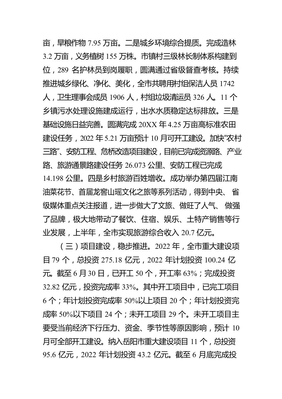 XX市发展和改革局局长在XX市十八届人大常委会上关于2022年上半年国民经济和社会发展计划执行情况的报告主任、各位副主任、各位委员:受市人民政府委托,我就上半年全市国民经济和社会发展计划执行情况报告如下,请予审议。一、关于2022年上半年计划执行情况今年来,面对经济下行压力、疫情等影响,在市委、市政府的坚强领导下,坚持全面系统、精准精细、较真碰硬的工作方法,围绕年度国民经济和社会发展计划任务,按照高质量发展要求,统筹推进稳增长、促改革、调结构、惠民生、防风险工作,全力推动“三区四市五个新格局”战略,促进XX经济社会健康稳定发展。1-6月,全市实现地区生产总值145.92亿元,同比增长4.7%,规模工业增加值同比增长6.1%,均居岳阳六县(市)第四位;城乡居民人均可支配收入18539元、12054元,同比增长5.7%、6.8%,分别居岳阳六县(市)第一、三位;社会消费品零售总额50.17亿元,同比增长1.7%,居岳阳六县(市)第二位;固定资产投资总额101亿元,同比增长11.8%,居岳阳六县(市)第一位;完成公共财政预算收入8.56亿元,同比增长13.2%,地方税收收入3.98亿元,同比增长30.8%,均居岳阳六县(市)第一位。(一)产业转型,来势较好。牢固树立“产业兴市、产业旺市、产业强市”的发展理念,以“五好”♘区创建为抓手,努力实现产业转型发展。6月18日,举办2022年度重大产业项目集中签约、开竣工仪式,共有48个项目集中签约、开工、竣工,总投资283.5亿元,预计年可创税收12亿元。1-6月,新签约产业项目28个,总投资202.5亿元,其中投资30亿元以上项目4个,10亿元以上项目2个,5亿元以上项目1个,亿元以上项目12个。一是绿色精细化工产业♘。25个签约项目总投资达122亿元,年可创产值134亿元,创税4.8亿元。已开工建设12个,年内预计可竣工投产11个。即将开工的包括投资10亿元双阳高科等8个项目已完成选址,其他手续正在办理中。二是中非工贸产业♘。已入驻企业7家,中栊木业、百林国际(贸易企业)已投产,其他5家企业正在安装设备。中非二期建设已完成了土地征拆,土地平整即将完成。三是浮标(钓具)产业。新竣工♘投产项目5个,总投资2.2亿元,预计年可创税1030万元。投资2亿元的电商物流仓储♘已竣工。投资3亿元的岳阳交建投快递物流项目规划市、县、镇、村四级物流配送网络♘项目,预计10月份可开工建设。(二)乡村振兴,成效斐然。一是粮食种植稳产增效。年初确定的全年完成粮食生产84.4万亩,其中早稻27万亩、集中育秧20.1万亩,粮食总产量35.1万吨以上目标任务。现已完成早稻27.3万亩、集中育秧20.2万亩,中稻18.5万亩,旱粮作物7.95万亩。二是城乡环境综合提质。完成造林3.2万亩,义务植树155万株。市镇村三级林长制体系构建到位,289名护林员到岗履职,圆满通过省级督查考核。持续推进城乡绿化、净化、美化,全市共聘用村组保洁人员1742人,卫生理事会成员1906人,村组垃圾清运员326人。11个乡镇污水处理设施建成运行,出水水质稳定达标排放。三是基础设施日益完善。圆满完成20XX年4.25万亩高标准农田建设任务,2022年5.21万亩预计10月可开工建设。加快“农村三路”、安防工程、危桥改造项目建设,目前已完成资源路、产业路、旅游通景路建设任务26.073公里、安防工程已完成14.198公里。四是乡村旅游百姓增收。成功举办第四届江南油菜花节、首届龙窖山瑶文化之旅等系列活动,得到中央、省级媒体重点关注报道,进一步做大了文旅、做旺了人气、做强了品牌,极大地带动了餐饮、住宿、娱乐、土特产销售等行业发展,上半年,全市实现旅游综合收入20.7亿元。(三)项目建设,稳步推进。2022年,全市重大建设项目79个,总投资275.18亿元,2022年计划投资100.24亿元。截至6月30日,已开工50个,开工率63%;完成投资32.82亿元,投资完成率33%。其中开工项目中,已完工项目6个;年计划投资完成率50%以上项目20个;年计划投资完成率50%以下项目24个;未开工项目29个。未开工项目主要受当前经济下行压力、资金、季节性等原因影响,预计10月可全部开工建设。纳入岳阳市重大建设项目11个,总投资95.6亿元,2022年计划投资43.2亿元。截至6月底完成投资28.02亿元...