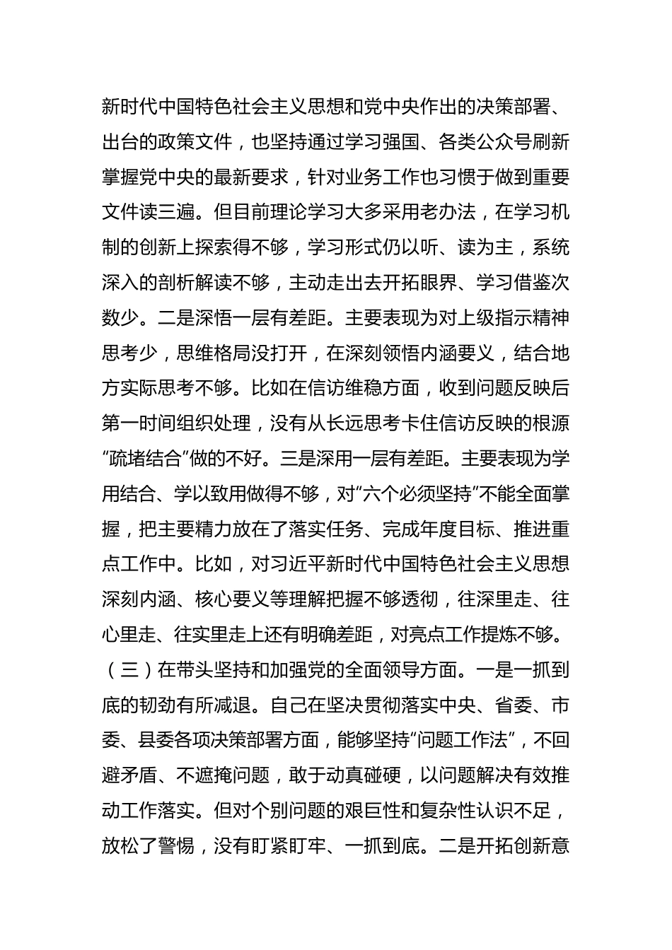 党员领导干部民主生活会对照检查材料(全文2909字)按照X文件要求,现将个人对照检查情况报告如下。一、上一年度民主生活会查摆问题整改情况上年度民主生活会中,通过自己找、大家评、相互帮,共查找出自己X个方面X个具体问题,在整改落实过程中,我始终把问题整改作为一项重大的政治任务,以高度负责的态度、雷厉风行的作风、务实高效的措施,持续发力,毫不含糊抓实问题整改。截至目前,除需长期坚持的事项以外,其余问题已全部整改到位。二、对照六个方面查找的主要问题(一)在带头深刻领悟“两个确立”的决定性意义,增强“四个意识”、坚定“四个自信”、做到“两个维护”方面。我始终坚持严格遵守党的政治纪律和政治规矩,提高政治判断力政治领悟力、政治执行力,自觉在思想上政治上行动上同以习近平同志为核心的党中央保持高度一致,坚定执行党的政治路线,对党忠诚、为党分忧、为党尽职。但仍有不足,一是个人专业化能力还需加强。对中央和省市县重大决策研究不够透彻、理解不够系统,在实际工作中缺乏构建制度体系的思考,对于将制度体系优势转化为治理效能的意识不强、办法不多,有时存在本位主义和实用主义思想,总觉得发展任务重,应该腾出更多的时间和精力来抓项目,存在选择性落实的情况,但离习近平总书记要求的“成为领导构建新发展格局的行家里手”目标仍有差距,知识体系还需进一步健全。二是新形势下对分管领域意识形态工作掌握不够。自己已经认识到了意识形态工作的极端重要性,在信访维稳、安全生产、生态保护等具体工作中,注重加强舆情监测,遇到问题第一时间发声进行舆论引导。但意识形态工作手段仍然比较单一,发现的也不够及时,说明没有完全跟上新时代、新媒体、全媒体的脚步,宣传范围不够全面。(二)在带头用习近平新时代中国特色社会主义思想凝心铸魂。一是深学一层有差距。自己认真学习了习近平新时代中国特色社会主义思想和党中央作出的决策部署、出台的政策文件,也坚持通过学习强国、各类公众号刷新掌握党中央的最新要求,针对业务工作也习惯于做到重要文件读三遍。但目前理论学习大多采用老办法,在学习机制的创新上探索得不够,学习形式仍以听、读为主,系统深入的剖析解读不够,主动走出去开拓眼界、学习借鉴次数少。二是深悟一层有差距。主要表现为对上级指示精神思考少,思维格局没打开,在深刻领悟内涵要义,结合地方实际思考不够。比如在信访维稳方面,收到问题反映后第一时间组织处理,没有从长远思考卡住信访反映的根源“疏堵结合”做的不好。三是深用一层有差距。主要表现为学用结合、学以致用做得不够,对“六个必须坚持”不能全面掌握,把主要精力放在了落实任务、完成年度目标、推进重点工作中。比如,对习近平新时代中国特色社会主义思想深刻内涵、核心要义等理解把握不够透彻,往深里走、往心里走、往实里走上还有明确差距,对亮点工作提炼不够。(三)在带头坚持和加强党的全面领导方面。一是一抓到底的韧劲有所减退。自己在坚决贯彻落实中央、省委、市委、县委各项决策部署方面,能够坚持“问题工作法”,不回避矛盾、不遮掩问题,敢于动真碰硬,以问题解决有效推动工作落实。但对个别问题的艰巨性和复杂性认识不足,放松了警惕,没有盯紧盯牢、一抓到底。二是开拓创新意识不够。有时认为只要工作中坚持原则,遵照上级部署要求,不出差错,按部就班完成上级安排的任务就可以,锐意进取、永不懈怠的精神状态和敢闯敢干、一往无前的奋斗姿态发挥的不够充分。(四)在带头坚持以人民为中心的发展思想,推动改革发展稳定方面。一是联系群众不够密切。对分管部门人员联系较多,但与群众沟通交流少,主动深入挂联帮扶群众调查研究的时间少,了解群众心声的次数还不够。二是抓落实措施办法还不够有力。在面对实际工作中出现的新情况新问题,个别时候沿用老思路、老办法、旧经验推进,新思路、新办法、新政策、新趋势研究不透彻,所提解决办法与上级高质量工作要求不匹配。(五)在带头发扬斗争精神,防范化解风险挑战方面。一是工作思路不够开阔、创新不够,满足于现状的现象还偶尔存在。二是有些工作停留在文件、会议层面,针对性...