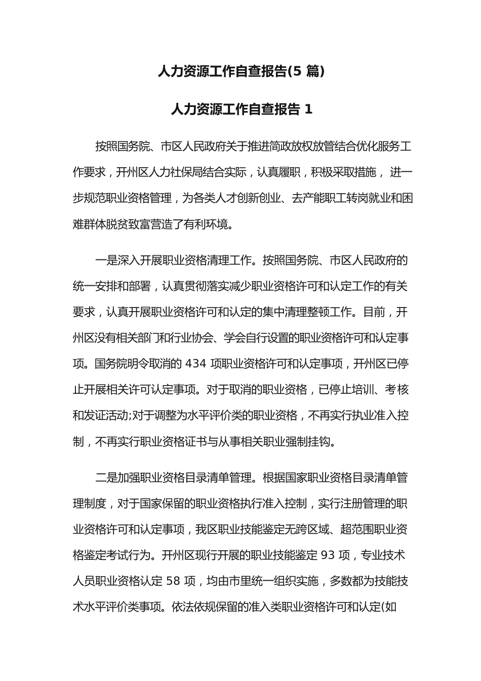 人力资源工作自查报告(5篇)人力资源工作自查报告1按照国务院、市区人民政府关于推进简政放权放管结合优化服务工作要求,开州区人力社保局结合实际,认真履职,积极采取措施,进一步规范职业资格管理,为各类人才创新创业、去产能职工转岗就业和困难群体脱贫致富营造了有利环境。一是深入开展职业资格清理工作。按照国务院、市区人民政府的统一安排和部署,认真贯彻落实减少职业资格许可和认定工作的有关要求,认真开展职业资格许可和认定的集中清理整顿工作。目前,开州区没有相关部门和行业协会、学会自行设置的职业资格许可和认定事项。国务院明令取消的434项职业资格许可和认定事项,开州区已停止开展相关许可认定事项。对于取消的职业资格,已停止培训、考核和发证活动;对于调整为水平评价类的职业资格,不再实行执业准入控制,不再实行职业资格证书与从事相关职业强制挂钩。二是加强职业资格目录清单管理。根据国家职业资格目录清单管理制度,对于国家保留的职业资格执行准入控制,实行注册管理的职业资格许可和认定事项,我区职业技能鉴定无跨区域、超范围职业资格鉴定考试行为。开州区现行开展的职业技能鉴定93项,专业技术人员职业资格认定58项,均由市里统一组织实施,多数都为技能技术水平评价类事项。依法依规保留的准入类职业资格许可和认定(如技术类:医师医护执业、教师资格等;技能:焊工、电工、特种作业等)都是涉及公共安全和公民人身安全,全部都在国家人社部公布的职业资格目录清单范围内。三是强化职业资格实施监管。完善职业资格考试和鉴定制度,凡涉及培训人员鉴定的,我们严格按照《重庆市人民政府关于加强职业培训促进就业的实施意见》文件执行,严格落实“考培分离”、“考鉴分离”,切实解决“挂证”“助考”“考培挂钩”的问题。通过创新鉴定方式,改进鉴定手段,鼓励企业完善多元化人才评价制度,减免劳动者初次职业技能鉴定费用,减轻企业和劳动者负担。四是加强职业技能鉴定质量管理。更新设备,减少鉴定人员工作程序。随着新设备上线,可以同时解决鉴定证上主页面的人员基本信息、照片、印章等内容,实现了节省时间、减少工序、提档升级的目标;严格把关,确保鉴定工作落到实处。严格按照重庆市职业技能鉴定考务管理办法,严把技能鉴定工作从申报到证书核发每个环节,确保鉴定工作规范有序。一季度,先后组织了扶贫雨露培训和家服行业职业技能鉴定503人,其中:中式烹调师285人,家政服务员218人;保育员347人;专项能力考核母婴护理(月嫂)19人,其它日常职业技能鉴定274人。人力资源工作自查报告2按照中共市区纪委市区纪委监察局关于印发《区整治工程建设、政府采购、公共资源交易、医疗卫生、社会保障等重点领域腐化问题的工作方案》的通知精神。我局高度重视,局党委召开专题会议研究部署,制定专项整治方案、落实具体行动措施、成立督查工作领导小组、明确相关责任,迅速对直属经办机构办理企业和失地农民社会保险、社保资产和社保基金管理等方面存在违纪违规操作、收送红包礼金、损害群众利益等问题展开拉网式排查,共查出问题5条,对相关人员进行了严肃处理,对涉及业务规范问题落实了整改措施,建立完善社会保障领域廉政风险防控长效机制。根据要求,现将区人社局系统开展社保领域损害群众利益不正之风专项整治工作自查报告如下。一、社保领域基本情况近几年来,我区社保工作按照上级业务部门工作部署,通过积极落实特殊群体社会保障、着力解决企业历史遗留问题和加大全社会扩面征缴力度等工作措施,社保基金储存额度和参保人数逐年增长。目前,全区共有参保企业403家,参保职工达35071人。其中,原国有集体改制企业148家,下岗职工参保27499人(含2976人断保和7473人退休);全区被征地农民参加基本养老保险38041人(已参保和锁定人员),其中,老征地9040人,足额缴费4217人,政府财政承担缓缴或挂账4823人;新征地29003人,政府全部采取缓缴或挂账方式落实重点群体社会保障。二、查纠出的问题一是有网外业务办理现象。因改制企业下岗职工、部分被征地农民在办理参保时,只收取了个人承担部分的养老保险费,政府财政承担部分未到帐,导致上述人员在...