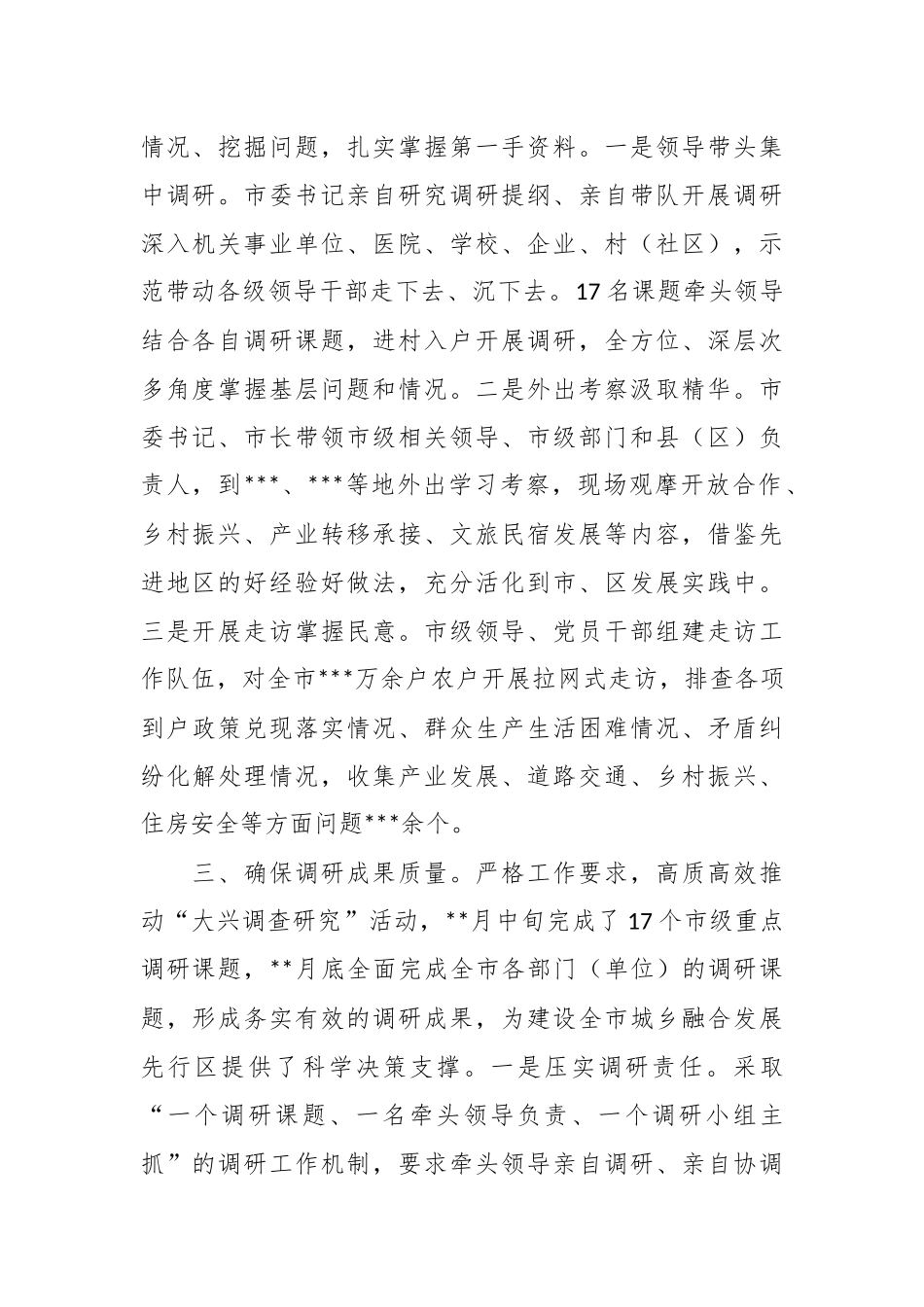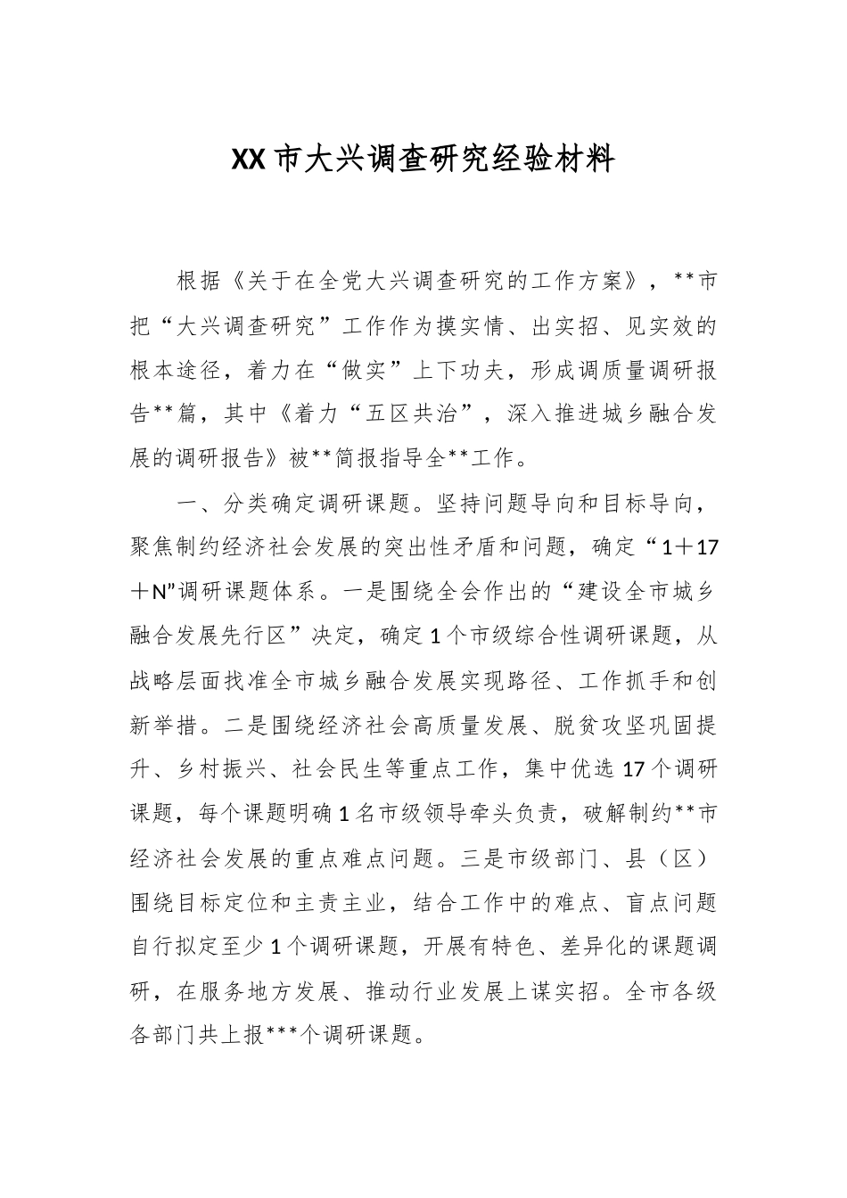 XX市大兴调查研究经验材料根据《关于在全党大兴调查研究的工作方案》,**市把“大兴调查研究”工作作为摸实情、出实招、见实效的根本途径,着力在“做实”上下功夫,形成调质量调研报告**篇,其中《着力“五区共治”,深入推进城乡融合发展的调研报告》被**简报指导全**工作。一、分类确定调研课题。坚持问题导向和目标导向,聚焦制约经济社会发展的突出性矛盾和问题,确定“1+17+N”调研课题体系。一是围绕全会作出的“建设全市城乡融合发展先行区”决定,确定1个市级综合性调研课题,从战略层面找准全市城乡融合发展实现路径、工作抓手和创新举措。二是围绕经济社会高质量发展、脱贫攻坚巩固提升、乡村振兴、社会民生等重点工作,集中优选17个调研课题,每个课题明确1名市级领导牵头负责,破解制约**市经济社会发展的重点难点问题。三是市级部门、县(区)围绕目标定位和主责主业,结合工作中的难点、盲点问题自行拟定至少1个调研课题,开展有特色、差异化的课题调研,在服务地方发展、推动行业发展上谋实招。全市各级各部门共上报***个调研课题。二、灵活调研方式方法。层层组织动员干部下沉一线采取定向调研、开门调研、蹲点调研等方式,全面深入了解情况、挖掘问题,扎实掌握第一手资料。一是领导带头集中调研。市委书记亲自研究调研提纲、亲自带队开展调研深入机关事业单位、医院、学校、企业、村(社区),示范带动各级领导干部走下去、沉下去。17名课题牵头领导结合各自调研课题,进村入户开展调研,全方位、深层次多角度掌握基层问题和情况。二是外出考察汲取精华。市委书记、市长带领市级相关领导、市级部门和县(区)负责人,到***、***等地外出学习考察,现场观摩开放合作、乡村振兴、产业转移承接、文旅民宿发展等内容,借鉴先进地区的好经验好做法,充分活化到市、区发展实践中。三是开展走访掌握民意。市级领导、党员干部组建走访工作队伍,对全市***万余户农户开展拉网式走访,排查各项到户政策兑现落实情况、群众生产生活困难情况、矛盾纠纷化解处理情况,收集产业发展、道路交通、乡村振兴、住房安全等方面问题***余个。三、确保调研成果质量。严格工作要求,高质高效推动“大兴调查研究”活动,**月中旬完成了17个市级重点调研课题,**月底全面完成全市各部门(单位)的调研课题,形成务实有效的调研成果,为建设全市城乡融合发展先行区提供了科学决策支撑。一是压实调研责任。采取“一个调研课题、一名牵头领导负责、一个调研小组主抓”的调研工作机制,要求牵头领导亲自调研、亲自协调亲自撰写,调研小组定时召开会议落实分工、掌握进度,确保按时完成调研报告起草任务。二是督导调研进度。各课题调研组按照时间节点上报调研提纲、调研总结和调研成果。对17个市级重点调研课题落实1名专人负责跟踪督导,提醒加快进度。定期到县(区)及市级各部门(单位)督导调研活动推进情况,指导调研选题、实地调研、报告撰写等工作,持续传导压力、推动任务落实。三是严格把关质量。紧盯课题质量这个关键环节,由市委政研室初审,对应付了事、流于形式、照搬照抄的坚决“回炉”;市委中心组终审,召开调研成果汇报会,专题听取各调研课题小组调研活动开展情况及调研报告起草情况,市委书记逐一点评。四、成果转化提升实效。调研成果汇报会后,结合学习贯彻落实省委***全会精神、市委***全会精神,进一步丰富完善调研报告。加强调研成果的转化运用,对每个课题调研报告进行系统梳理和归纳研究,将报告中的优秀成果充分采纳吸收到市委**全会文件中去。将报告汇编成册,作为全会重要参阅资料,并在一定范围内印发,供各级各部门学习掌握。对调研报告中提出的意见建议,逐项研究转化为可操作、可落实、可持续的政策举措、工作方案、实施意见。
