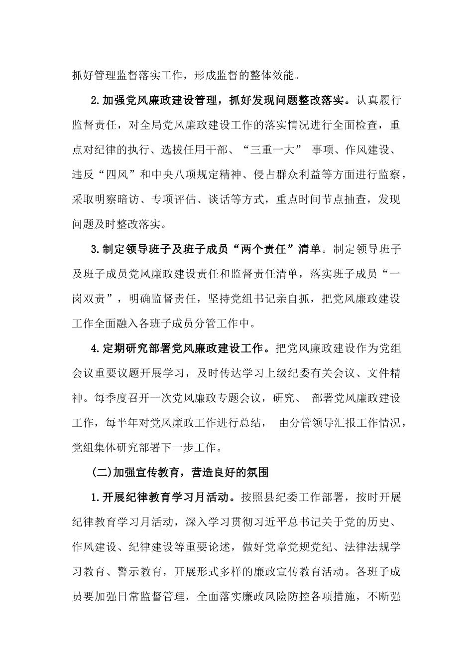 2025年(五篇)党风廉政建设工作计划范文稿【范文一】为持续做好党风廉政建设和反腐败工作,持之以恒地贯彻落实中央八项规定和省委、市委、县委规定,不断加强我局党员干部作风建设,提升全局人员工作效能,积极提高人社干部队伍素质,不断转变工作作风,抓责任、全机制、重教育、强监督,进一步把党风廉政建设工作提高到一个新水平,特制定本工作计划。一、总体要求以习近平新时代中国特色社会主义思想为指导,全面认真贯彻落实党的二十大精神及二十届二中、三中全会精神、二十届中央纪委四次全会精神,坚持正确政治方向,严守政治纪律,严格按照依规治党的要求,认真落实中央和省委、市委、县委有关党风廉政建设和反腐败工作决策部署,强化“两个责任”,深化标本兼治,持之以恒落实中央八项规定精神,为和平县经济社会发展营造风清气正的政治环境。二、工作任务(一)加强组织领导,层层传导责任压力1.建立健全党风廉政建设领导机制。加强党风廉政建设工作,促进党风廉政建设工作和反腐倡廉工作同部署同推进,实行“一岗双责”责任制度、领导班子责任主体清单制度及权责清单制度,领导班子严格按照党风廉政建设工作条例,明确工作职责,分管部门抓好管理监督落实工作,形成监督的整体效能。2.加强党风廉政建设管理,抓好发现问题整改落实。认真履行监督责任,对全局党风廉政建设工作的落实情况进行全面检查,重点对纪律的执行、选拔任用干部、“三重一大”事项、作风建设、违反“四风”和中央八项规定精神、侵占群众利益等方面进行监察,采取明察暗访、专项评估、谈话等方式,重点时间节点抽查,发现问题及时整改落实。3.制定领导班子及班子成员“两个责任”清单。制定领导班子及班子成员党风廉政建设责任和监督责任清单,落实班子成员“一岗双责”,明确监督责任,坚持党组书记亲自抓,把党风廉政建设工作全面融入各班子成员分管工作中。4.定期研究部署党风廉政建设工作。把党风廉政建设作为党组会议重要议题开展学习,及时传达学习上级纪委有关会议、文件精神。每季度召开一次党风廉政专题会议,研究、部署党风廉政建设工作,每半年对党风廉政工作进行总结,由分管领导汇报工作情况,党组集体研究部署下一步工作。(二)加强宣传教育,营造良好的氛围1.开展纪律教育学习月活动。按照县纪委工作部署,按时开展纪律教育学习月活动,深入学习贯彻习近平总书记关于党的历史、作风建设、纪律建设等重要论述,做好党章党规党纪、法律法规学习教育、警示教育,开展形式多样的廉政宣传教育活动。各班子成员要加强日常监督管理,全面落实廉政风险防控各项措施,不断强化日常监督和专项检查,始终保持反腐倡廉的高压态势。2.巩固党史学习教育成果。常态化开展党史学习教育,组织党员干部持续深入学习党史学习教育和习近平总书记系列重要讲话精神,提高党员领导干部的政治站位,切实做到学史明理、学史增信、学史崇德、学史力行,不断延伸和扩大学党史、悟思想、办实事、开新局的实际成效。3.认真开展谈心谈话活动。结合主题教育活动、民主生活会工作安排,党组书记与各班子成员、班子成员与班子成员之间、班子成员与分管股室负责人之间每季度开展至少一次谈心谈话活动,谈话人与谈话对象要敞开心扉、互相提醒帮助,积极提出加强领导班子建设、提高机关执行力等方面的意见建议。办公室要每季度汇总谈话提醒数据,按时上报县纪委。4.持续加强意识形态工作。各班子成员要强化意识形态责任落实,每季度对意识形态领域问题研判分析,加强意识形态工作的建设和管理,牢牢掌握意识形态工作的领导权、主动权,确保意识形态安全。5.严肃党内政治生活。党支部坚持“三会一课”制度,按期召开支委会、党员大会、党小组会,开展党日活动,讲党课,传达贯彻落实上级决策和会议精神,严肃党内政治生活。党员要尊崇党章,严格执行新形势下党内政治生活的若干准则,自觉用好批评与自我批评,开展积极健康的思想斗争,切实提高党内政治生活质量。6.加强廉政文化建设。党支部定期组织开展廉政教育活动,充分发挥红色教育资源作用,利用典型案例通报、廉政警示教育片等,提升领导干部廉洁意识,增强党员干部严守...
