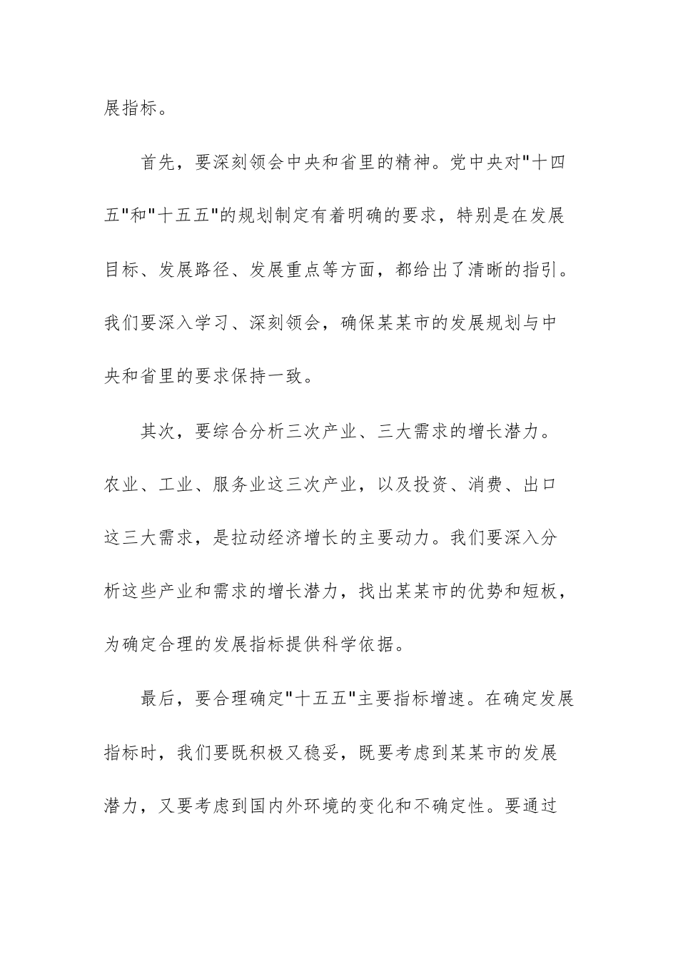 市委专题会议研究部署"十四五"规划收官和"十五五"规划编制工作上的讲话文稿同志们:今天,我们在这里召开市委专题会议,主要任务是深入研究"十四五"规划收官和"十五五"规划编制的有关工作。这既是落实中央和省里相关要求的重要举措,也是推动某某市经济社会持续健康发展的必然要求。下面,我结合某某市的实际,就"十五五"发展的几个重大问题,谈几点意见。一、科学确定"十五五"发展指标,锚定战略目标"十五五"时期,是某某市与全国同步基本实现社会主义现代化的关键阶段。我们必须锚定这个目标,紧扣高质量发展这个首要任务,科学合理地确定"十五五"时期的主要发展指标。首先,要深刻领会中央和省里的精神。党中央对"十四五"和"十五五"的规划制定有着明确的要求,特别是在发展目标、发展路径、发展重点等方面,都给出了清晰的指引。我们要深入学习、深刻领会,确保某某市的发展规划与中央和省里的要求保持一致。其次,要综合分析三次产业、三大需求的增长潜力。农业、工业、服务业这三次产业,以及投资、消费、出口这三大需求,是拉动经济增长的主要动力。我们要深入分析这些产业和需求的增长潜力,找出某某市的优势和短板,为确定合理的发展指标提供科学依据。最后,要合理确定"十五五"主要指标增速。在确定发展指标时,我们要既积极又稳妥,既要考虑到某某市的发展潜力,又要考虑到国内外环境的变化和不确定性。要通过科学的方法,合理确定各项指标的增速,确保某某市的发展既快又稳。在"十五五"规划编制中,我们要特别注重以下几点:一是经济增长要保持合理速度。经济增长是高质量发展的基础,没有一定的增长速度,就谈不上高质量发展。我们要在确保经济增长速度的同时,更加注重提高经济增长的质量和效益。二是产业结构要持续优化。要推动传统产业转型升级,大力发展新兴产业,加快构建现代产业体系。同时,要大力发展现代服务业,提高服务业的比重和水平。三是创新驱动要成为核心动力。要深入实施创新驱动发展战略,加强科技创新和人才培养,推动产学研深度融合,提高自主创新能力。四是绿色发展要成为鲜明底色。要坚持绿色发展理念,加强生态环境保护和治理,推动形成绿色发展方式和生活方式。二、做好重大项目接续,确保更多项目纳入国家大盘子重大项目是经济社会发展的"牛鼻子",是推动高质量发展的重要支撑。在"十五五"规划编制中,我们要结合系列国家重大战略和省委发展战略实施,加快重大工程项目的谋划、遴选和对接争取工作,确保更多项目纳入国家"十五五"大盘子。一是要准确把握国家重大战略和省委发展战略的机遇。当前,国家正在实施一系列重大战略,如"一带一路"建设、长江经济带发展、西部大开发等。同时,省委也提出了一系列发展战略,如"滇中崛起""沿边开放"等。我们要准确把握这些机遇,结合某某市的实际,谋划一批重大工程项目。二是要加强项目谋划和遴选工作。要围绕某某市的重点产业、重点领域和重点区域,谋划一批具有全局性、战略性、前瞻性的重大工程项目。同时,要加强项目的遴选工作,确保项目的科学性、可行性和有效性。三是要加强项目的对接和争取工作。要加强与上级部门的沟通协调,及时了解国家政策和投资导向,积极争取国家和省里的支持。同时,要加强与金融机构的合作,拓宽融资渠道,为项目建设提供有力的资金保障。在重大项目接续方面,我们要注重以下几点:一是要加强项目储备。要建立完善的项目储备库,对谋划好的项目进行动态管理和跟踪服务。同时,要加强项目的滚动更新和储备工作,确保项目源源不断、接续有力。二是要加强项目推进。要建立完善的项目推进机制,明确责任单位和责任人,加强项目的调度和督查检查。同时,要加强项目的协调和服务工作,及时解决项目建设中遇到的问题和困难。三是要加强项目监管。要加强项目的质量监管和安全监管工作,确保项目的质量和安全。同时,要加强项目的资金监管和审计监督工作,确保项目的资金安全和合规使用。三、扩大内需畅通经济循环,促进要素高效流通扩大内需畅通经济循环是推动高质量发展的重要途径。在"十五五"规划编制中,我们要以积极开放姿态做全国统一大市场建设的参与者、促进者,研究破...