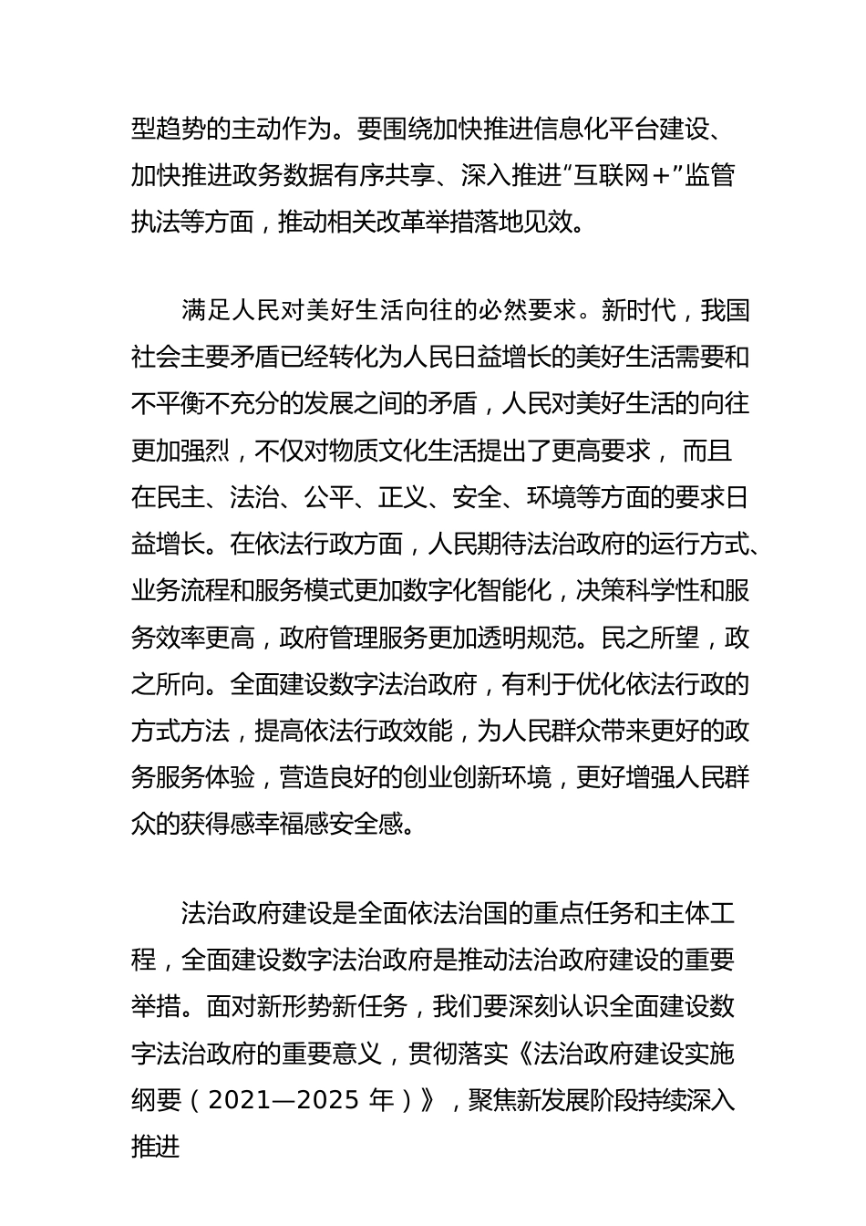 【网信工作】全面建设数字法治政府习近平总书记强调:“要全面贯彻网络强国战略,把数字技术广泛应用于政府管理服务,推动政府数字化、智能化运行,为推进国家治理体系和治理能力现代化提供有力支撑。”适应互联网发展趋势,将大数据、云计算、人工智能等数字技术广泛应用于政府依法行政过程,实现政府治理信息化与法治化深度融合,对于优化政府治理流程和方式、提升政府依法行政能力和水平,具有十分重要的意义。《法治政府建设实施纲要(2021—2025年)》提出:“健全法治政府建设科技保障体系,全面建设数字法治政府”。新形势下,我们要把数字政府建设与法治政府建设有机结合起来,为全面建设法治政府筑牢“数字基石”,更好推动科学决策、民主决策、依法决策。适应国家治理现代化的内在要求。当前,国际形势继续发生深刻复杂变化,百年变局和世纪疫情相互交织,我们既面临难得发展机遇,也面临严峻挑战。要赢得主动、化危为机,需要准确把握数字技术创新发展带来的新机遇。在法治政府建设中创新数字技术运用,以政府数字化转型驱动治理方式变革,推动政府治理流程优化、治理模式创新和履职能力提升,进一步提高政府运行数字化、智能化水平,让法治政府更加智能更加高效,能够更好地把社会主义法治优势转化为国家治理效能,以现代化国家治理体系和治理能力确保人民安居乐业、党和国家长治久安。全面建设数字法治政府,将数字技术融入构建职责明确、依法行政的政府治理体系之中,让数字技术赋能法治,为依法行政提供科技支撑,有利于提升政府治理效能,契合政府决策科学化、社会治理精准化、公共服务高效化的国家治理需要,能够更好推进国家治理体系和治理能力现代化。推进全面深化改革的重要举措。充分发挥市场在资源配置中的决定性作用,更好发挥政府作用,需要通过全面深化改革,切实推进政府职能转变。全面建设数字法治政府,顺应数字技术和依法行政深度融合的趋势,对促进政府职能深刻转变、持续优化具有重要作用。例如,借助数字技术,更多政务服务事项实现“一件事一次办”“网上办”“掌上办”“自助办”等,可以进一步促进政务服务标准化、规范化、便利化,推动行政机构职能、流程等的法治化再造,有效提升政务服务能力和水平。全面建设数字法治政府,是顺应经济社会数字化转型趋势的主动作为。要围绕加快推进信息化平台建设、加快推进政务数据有序共享、深入推进“互联网+”监管执法等方面,推动相关改革举措落地见效。满足人民对美好生活向往的必然要求。新时代,我国社会主要矛盾已经转化为人民日益增长的美好生活需要和不平衡不充分的发展之间的矛盾,人民对美好生活的向往更加强烈,不仅对物质文化生活提出了更高要求,而且在民主、法治、公平、正义、安全、环境等方面的要求日益增长。在依法行政方面,人民期待法治政府的运行方式、业务流程和服务模式更加数字化智能化,决策科学性和服务效率更高,政府管理服务更加透明规范。民之所望,政之所向。全面建设数字法治政府,有利于优化依法行政的方式方法,提高依法行政效能,为人民群众带来更好的政务服务体验,营造良好的创业创新环境,更好增强人民群众的获得感幸福感安全感。法治政府建设是全面依法治国的重点任务和主体工程,全面建设数字法治政府是推动法治政府建设的重要举措。面对新形势新任务,我们要深刻认识全面建设数字法治政府的重要意义,贯彻落实《法治政府建设实施纲要(2021—2025年)》,聚焦新发展阶段持续深入推进依法行政的实际需要,充分发挥数字技术的赋能增效作用,采取有效举措构建数字化、智能化的政府运行新形态,为全面建设职能科学、权责法定、执法严明、公开公正、智能高效、廉洁诚信、人民满意的法治政府提供强劲科技动能。