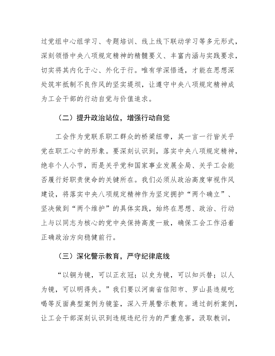 副主席在总工会党组理论学习中心组传达河南省信阳市、罗山县xx名干部违规吃喝问题研讨会上的交流发言同志们:中央八项规定精神如劲风涤荡,为新时代党的作风建设锚定方向。河南省信阳市、罗山县xx名干部在学习教育期间违规吃喝的通报,如一记重锤,敲响了作风建设的警钟。市总工会作为全市各级工会的引领者、国家政权的有力支撑、职工权益的坚定维护者,必须深刻汲取教训,以更高站位、更严标准,将中央八项规定精神融入工会工作的每一处脉络。下面,我结合工作实际,谈几点体会。一、以“慎独慎微”的自律精神,夯实作风根基(一)强化理论武装,领悟精神内核总书记强调:“理想信念是共产党人精神上的‘钙’,没有理想信念,理想信念不坚定,精神上就会‘缺钙’,就会得‘软骨病’。”我们要把学习总书记关于加强党的作风建设的重要论述和中央八项规定及其实施细则精神作为重中之重。通过党组中心组学习、专题培训、线上线下联动学习等多元形式,深刻领悟中央八项规定精神的精髓要义、丰富内涵与实践要求,切实将其内化于心、外化于行。唯有学深悟透,才能在思想深处筑牢抵制不良作风的坚实堤坝,让遵守中央八项规定精神成为工会干部的行动自觉与价值追求。(二)提升政治站位,增强行动自觉工会作为党联系职工群众的桥梁纽带,其一言一行皆关乎党在职工心中的形象。要深刻认识到,落实中央八项规定精神,绝非个人小节,而是关乎党和国家事业发展全局、关乎工会能否履行好职责使命的关键所在。我们必须从政治高度审视作风建设,将落实中央八项规定精神作为坚定拥护“两个确立”、坚决做到“两个维护”的具体实践,始终在思想、政治、行动上与以同志为核心的党中央保持高度一致,确保工会工作沿着正确政治方向稳健前行。(三)深化警示教育,严守纪律底线“以铜为镜,可以正衣冠;以史为镜,可以知兴替;以人为镜,可以明得失。”我们要以河南省信阳市、罗山县违规吃喝等反面典型案例为镜鉴,深入开展警示教育。通过剖析案例,让工会干部深刻认识到违规违纪行为的严重危害,汲取教训,引以为戒。同时,大力宣传贯彻中央八项规定精神的先进典型,树立鲜明导向。强化纪律意识与规矩意识,教育引导工会干部时刻保持清醒头脑,自觉遵守党的纪律和规矩,做到心有所畏、言有所戒、行有所止,坚守纪律底线不动摇。二、以“刮骨疗毒”的果敢决心,整治作风积弊(一)聚焦关键领域,严纠违规吃喝违规吃喝绝非小事,而是严重影响党在人民群众心中形象的大问题。在工会系统,我们要重点聚焦工会经费使用、职工活动组织、对外交流合作等领域,坚决杜绝违规公款吃喝、接受管理和服务对象宴请等行为。严格执行工会经费使用管理规定,加强经费收支审计监督,确保工会经费使用合法合规、公开透明。规范职工活动组织开展,严禁借活动之名铺张浪费、大吃大喝。加强对外交流合作管理,严格按规定安排接待活动,坚决抵制违规吃喝歪风。(二)狠刹形式主义,提升工作效能形式主义是作风建设的大敌,严重阻碍工作落实与职工权益保障。我们要坚决整治工会工作中的形式主义问题,精简会议活动,严格控制会议数量、规模和时长,提高会议质量与效果,开短会、讲短话、求实效。精简文件简报,改进文风,无实质内容、可发可不发的文件、简报一律不发。优化工作流程,减少不必要的工作环节与过度留痕现象,让工会干部将更多时间和精力投入到为职工群众服务的实际工作中,切实提高工作效能,推动工会工作高质量发展。(三)力戒官僚主义,密切联系职工工会工作的核心是为职工群众服务,必须坚决反对官僚主义,密切联系职工群众。我们要深入基层、深入一线、深入职工群众,倾听职工呼声,了解职工需求,关心职工疾苦,切实为职工群众办实事、解难题。改进工作作风,坚决克服在联系服务职工中消极应付、冷硬横推、效率低下等问题,切实维护职工群众的合法权益。建立健全联系职工群众的长效机制,拓宽职工群众反映问题的渠道,加强与职工群众的沟通交流,不断增强职工群众的获得感、幸福感和安全感。(四)严查隐形变异,保持高压态势随着正风肃纪力度不断加大,一些“四风”问题呈现出隐形变异的新动向。我们要保持...