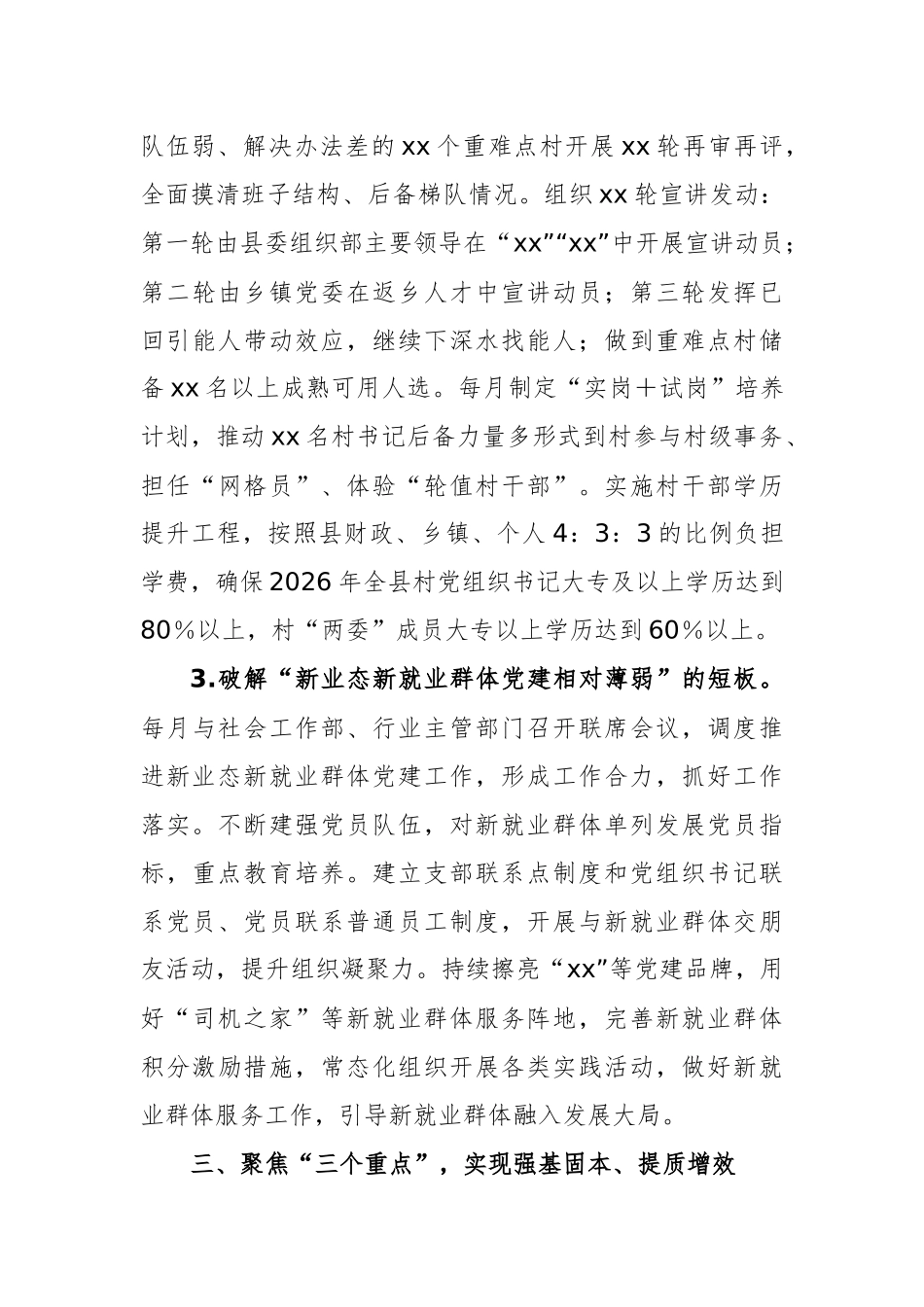在2025年党建工作务虚会上的发言提纲范文根据会议安排,xx就2025年基层党建工作思路作简要发言。一、抓好“三个层级”,做到上下联动、统筹推进1.发挥县委领航作用。注重发挥县委引领作用,用好每季度县委党建工作领导小组会议、县委常委会议等制度定期向县委汇报党建工作情况,争取县委的支持配合。聚焦我县党建工作的品牌特色及短板弱项,提前谋划确定好2025年县委“xx”项目;持续抓好项目实施,压实相关职能部门作用,做到每季度向党建工作领导小组汇报工作进展,确保项目成效。发挥党建述职评议考核“指挥棒”作用,严格落实“述职评议未得‘好’的,年度考核不确定为‘优秀’”的工作要求,压实党建责任。2.发挥组织部门统筹协调作用。坚持部务会成员和机关干部挂点联系制度,确保每周至少下基层调研党建工作1次,重点围绕基层治理、乡村振兴、党员教育管理等重点任务,常态化跟踪党建工作成效,确保工作落实。严格督促基层党组织落实好“三会一课”、主题党日等组织生活制度,统筹推进机关、学校、公立医院等各领域党建工作抓牢党建工作基础。以打造“xx”为抓手,健全工作链条、强化调度指导,鼓励引导xx党支部、货车司机党支部等“两新”党组织努力探索工作特色经验,力争2025年度打造市级“xx”总量进位赶超。3.发挥乡镇党建办作用。推动各乡镇选配1名党建业务熟练的优秀后备干部专职负责党建办日常工作,做到专人、专业、专岗。细化xx项党建办工作人员职责清单,指导落实周工作例会、协调研判、常态下沉、重点联系支部督促指导xx项工作机制,厘清机构定位和主要职能,压紧压实工作责任。每季度围绕党建工作年度计划、重点任务开展专题培训和业务指导,推动党建办顺畅运行。二、破解“三个短板”,力求精准发力、全面过硬1.破解“流动党员管理难”的短板。全面开展流动党员“三服务”行动,巩固流动党员集中登记、接收工作成果,用好流动党员管理系统,在春节前后,组织xx余名与流动党员结对联系的村“两委”干部了解党员最新信息,更新全县流动党员名册。做好“双向共管”“后半篇文章”,加强与xx个驻外流动党支部、xx个流动党员服务驿站、xx个签订共建协议流入地的沟通联络,扎实开展党员教育、管理和服务工作。发挥xx余名“家乡推介官”队伍作用,开展“我为家乡献一策”“支部出题、党员选题”等活动,在助力振兴、促进治理上彰显作为。2.破解“村级后备干部储备难”的短板。着眼新一轮村“两委”换届,在春节和年中期间对换届任务重、干部队伍弱、解决办法差的xx个重难点村开展xx轮再审再评,全面摸清班子结构、后备梯队情况。组织xx轮宣讲发动:第一轮由县委组织部主要领导在“xx”“xx”中开展宣讲动员;第二轮由乡镇党委在返乡人才中宣讲动员;第三轮发挥已回引能人带动效应,继续下深水找能人;做到重难点村储备xx名以上成熟可用人选。每月制定“实岗+试岗”培养计划,推动xx名村书记后备力量多形式到村参与村级事务、担任“网格员”、体验“轮值村干部”。实施村干部学历提升工程,按照县财政、乡镇、个人4:3:3的比例负担学费,确保2026年全县村党组织书记大专及以上学历达到80%以上,村“两委”成员大专以上学历达到60%以上。3.破解“新业态新就业群体党建相对薄弱”的短板。每月与社会工作部、行业主管部门召开联席会议,调度推进新业态新就业群体党建工作,形成工作合力,抓好工作落实。不断建强党员队伍,对新就业群体单列发展党员指标,重点教育培养。建立支部联系点制度和党组织书记联系党员、党员联系普通员工制度,开展与新就业群体交朋友活动,提升组织凝聚力。持续擦亮“xx”等党建品牌,用好“司机之家”等新就业群体服务阵地,完善新就业群体积分激励措施,常态化组织开展各类实践活动,做好新就业群体服务工作,引导新就业群体融入发展大局。三、聚焦“三个重点”,实现强基固本、提质增效1.抓实党建引领基层治理。持续开展“金事精办·‘溪’心为民”行动,组织在职党员干部深入农村、社区、企业帮助群众解决实际困难,确保事件“接诉即办”。落实好全县党员干部带头维护小区物业管理秩序九条措施,推广“五方议事厅”机制。加强社区工作...