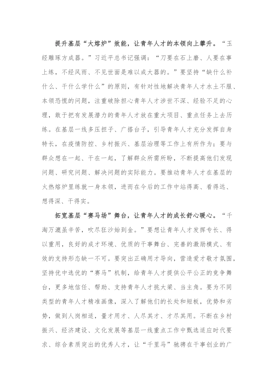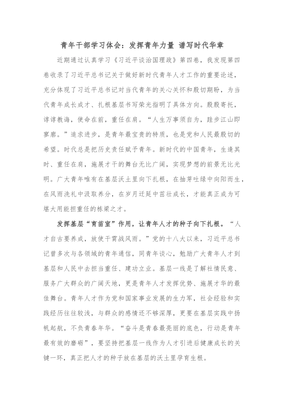 青年干部学习体会:发挥青年力量谱写时代华章近期通过认真学习《习近平谈治国理政》第四卷,我发现第四卷收录了习近平总书记关于做好新时代青年人才工作的重要论述,充分体现了习近平总书记对当代青年的关心关怀和殷切期盼,为当代青年成长成才、扎根基层书写荣光指明了具体方向。殷殷寄托,谆谆教诲,使命在前,重任在肩。“人生万事须自为,跬步江山即寥廓。”追求进步,是青年最宝贵的特质,也是党和人民最殷切的希望。时代总是把历史责任赋予青年。新时代的中国青年,生逢其时、重任在肩,施展才干的舞台无比广阔,实现梦想的前景无比光明。广大青年唯有在基层沃土里向下扎根,在抽芽吐绿中向阳而生,在风雨洗礼中汲取养分,在岁月迁延中茁壮成长,才能真正成为可堪大用能担重任的栋梁之才。发挥基层“育苗室”作用,让青年人才的种子向下扎根。“人才自古要养成,放使干霄战风雨。”党的十八大以来,习近平总书记曾多次与各领域的青年通信,同青年谈心,勉励广大青年人才到基层和人民中去担当重任、建功立业。基层一线是了解社情民意、服务广大群众的广阔天地,更是青年人才发挥优势、施展才华的最佳舞台。青年人才作为党和国家事业发展的生力军,社会经验和实践经历往往较浅,与群众的感情还不够深厚,更要在基层实践中扬帆起航,不负青春年华。“奋斗是青春最亮丽的底色,行动是青年最有效的磨砺”,要坚持把基层一线作为人才引进后健康成长的关键一环,真正把人才的种子放在基层的沃土里孕育生根。提升基层“大熔炉”效能,让青年人才的本领向上攀升。“玉经雕琢方成器。”习近平总书记强调:“刀要在石上磨、人要在事上练,不经风雨、不见世面是难以成大器的。”要坚持“缺什么补什么、干什么学什么”的原则,有针对性地解决青年人才水土不服、本领恐慌的问题,注重破除担心青年人才涉世不深、经验不足的心理,敢于把有发展潜力的青年人才放在重大项目、重点任务上去历练。在基层一线多压担子、广搭台子,引导青年人才充分发挥自身特长,在疫情防控、乡村振兴、基层治理等工作上有所作为;要与群众想在一起、干在一起,了解群众所需所盼,不断提高他们发现问题、研究问题、解决问题的实际能力。要推动青年人才在基层的火热熔炉里练就一身本领,进而在今后的工作中站得高、看得远、想得深、干得实。拓宽基层“赛马场”舞台,让青年人才的成长舒心暖心。“千淘万漉虽辛苦,吹尽狂沙始到金。”要想让青年人才发挥专长、得以重用,良好的成才环境、优质的干事舞台、完善的激励模式、有效的支持形态缺一不可。要突出正确用才导向,营造爱才敬才氛围,坚持优中选优的“赛马”机制,给青年人才提供公平公正的竞争舞台,更多地信任、帮助、支持青年人才挑大梁、当主角。要为不同类型的青年人才精准画像,深入了解他们的长处和短板,优势和劣势,做到人岗相适,量才用才、人尽其才、才尽其用。不断在乡村振兴、经济建设、文化发展等基层一线重点工作中甄选适应时代要求、综合素质突出的优秀人才,让“千里马”驰骋在干事创业的广阔天地,使各类优秀人才脱颖而出,在奋进新征程的伟大事业中充分施展才干。繁荣基层“百花园”盛景,让青年人才的事业蓬勃兴旺。“青春孕育无限希望,青年创造美好明天。”要在引才、育才、用才的基础上,不断提高青年人才的政治、经济和社会待遇,提供更加立体细致的周到服务,增强青年人才的归属感、获得感和幸福感,用真心和诚心留住来之不易的宝贵人才资源。要让更多“土专家”“田秀才”活跃在基层一线,不断激励各类人才把论文写在乡村田野上,把成果留在寻常百姓家。时代塑造人才,人才成就事业,要以人才振兴引领基层经济社会发展,源源不断地为建设高素质专业化人才队伍输送生力军,为实现第二个百年奋斗目标筑牢人才之基。“青年者,国家之魂。”作为青年干部要认真接受政治训练、加强政治锻造、追求政治进步,带头立足岗位、苦练本领、创先争优,努力成为行业骨干、青年先锋,在奋进新征程的伟大事业中充分施展才干,真正成为可堪大用能担重任的栋梁之才。