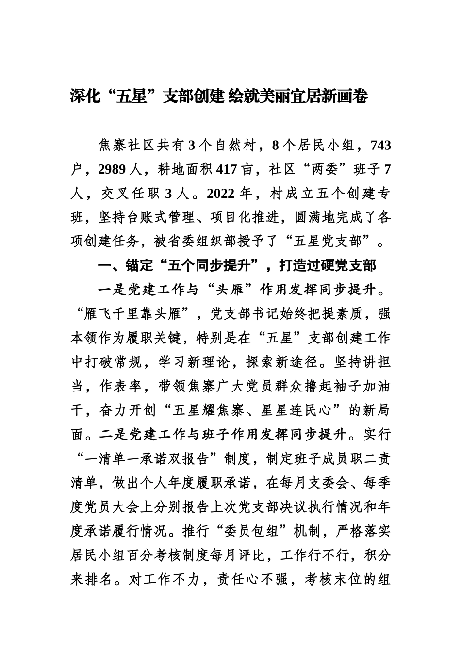 深化“五星”支部创建绘就美丽宜居新画卷焦寨社区共有3个自然村,8个居民小组,743户,2989人,耕地面积417亩,社区“两委”班子7人,交叉任职3人。2022年,村成立五个创建专班,坚持台账式管理、项目化推进,圆满地完成了各项创建任务,被省委组织部授予了“五星党支部”。一、锚定“五个同步提升”,打造过硬党支部一是党建工作与“头雁”作用发挥同步提升。“雁飞千里靠头雁”,党支部书记始终把提素质,强本领作为履职关键,特别是在“五星”支部创建工作中打破常规,学习新理论,探索新途径。坚持讲担当,作表率,带领焦寨广大党员群众撸起袖子加油干,奋力开创“五星耀焦寨、星星连民心”的新局面。二是党建工作与班子作用发挥同步提升。实行“一清单一承诺双报告”制度,制定班子成员职二责清单,做出个人年度履职承诺,在每月支委会、每季度党员大会上分别报告上次党支部决议执行情况和年度承诺履行情况。推行“委员包组”机制,严格落实居民小组百分考核制度每月评比,工作行不行,积分来排名。对工作不力,责任心不强,考核末位的组长、包组干部在主题党日会议上表态发言。三是党建工作与党员队伍建设同步提升。坚持用好“一编三定”工作法、坚持无职党员联户和义务值班制度,科学设定岗位,让无职党员“有职”,让无职党员“领岗知所责,在岗有所为”,进一步激发无职党员队伍“微能量”。同时,围绕优化农村党员队伍结构,将党员发展向退伍军人、致富能手、大中专毕业生等重点对象倾斜,今年培养3名35岁以下入党积极分子,其中2名为致富能手,1名为毕业的大学生。四是党建工作与推动组织生活同步提升。将传承红色基因作为“三会一课”鲜明特色,先后组织党员到红色基地,通过现场教学、情景教学、体验教学等各种形式,让:组织生活更具吸引力。在“三会一课”中引导党员围绕“五星”支部创建建言献策。通过微信群组织“微讨论”、开讲“微党课”,线上线下互联互动。五是党建工作与阵地建设同步提升。在党群服务中心,改建40多平方米的“五星”支部创建工作室(党员风采活动室),展示党支部历年来所取得的各项荣誉、社区优秀党员风采以及“五星”支部创建相关资料。二、找准强社富民支点,撬动产业发展新“杠杆”围绕“产业兴、焦寨行”,深挖社区发展潜力,始终把壮大集体经济的着力点放在产业发展上,社区以“信用村”建设助力社区群众创业兴业,以技能培训进社区助推劳动就业,以绑定龙头企业促进闲散劳动力增收。由焦寨社区集体经济合作社,出资成立了禹州市裕民劳务服务有限公司,与锦利建筑公司和神龙发制品有限公司进行“双绑”,依托社区项目优势,主要开展建筑工程施工、劳务服务、劳务分包、房屋场地租赁等业务,实现了年集体经济经营收入40多万元。焦寨社区在产业发展的示范带动下,形成了个人创业能力强,家庭致富能力强,社区产业发展兴旺的良好局面。三、着力在“宜”上下功夫,打好生态宜居“四张牌”着力在“宜”字上做文章、下功夫,打好“控、改、增、变”四张牌,以优美环境带动社区其他领域共同发展。一是“控”。重点围绕村容村貌提升这一关键性内容,以整治农村人居环境为抓手,完善了“四级”环境卫生管理制度,成立了八支环境卫生志愿服务队,加大统筹推进力度。二是“改”。统筹安排村庄布局,突出乡村优势特色,推行实用性村庄规划设计,打造焦寨社区孝善文化一条街、“五星”支部创建主题一条街、健康知识宣传一条街。三是“增”。大力实施绿化行动,充分利用公共休闲场地、乡村道路、房前屋后等区域,加强村庄绿化、庭院绿化、通道绿化,对荒芜宅基地实行一宅变四园,因地制宜,分别建成了游园、花园、果园、菜园,初步建成了春有花、夏有荫、秋有果、冬有景的生态宜居美丽社区。四是“变”。引导广大居民积极参与乡村环境整治和保护,改变原有的生活习惯,养成爱护环境、讲究卫生的新风尚,社区先后有200多户评上“五美示范庭院”,社区居民争当“五美示范庭院”的氛围更加浓厚,现在焦寨社区的人居环境舒适度实现了由表及里、形神兼备的全面提升。四、“党建引领+群防群治”,建设平安法治“新焦寨”坚持党建引领,深入推进“焦寨街坊”...
