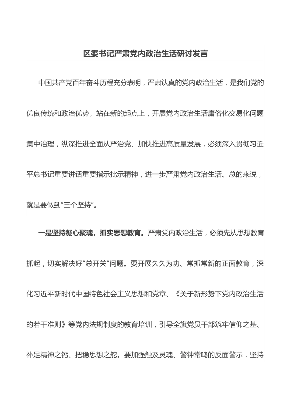 区委书记严肃党内政治生活研讨发言中国共产党百年奋斗历程充分表明,严肃认真的党内政治生活,是我们党的优良传统和政治优势。站在新的起点上,开展党内政治生活庸俗化交易化问题集中治理,纵深推进全面从严治党、加快推进高质量发展,必须深入贯彻习近平总书记重要讲话重要指示批示精神,进一步严肃党内政治生活。总的来说,就是要做到“三个坚持”。一是坚持凝心聚魂,抓实思想教育。严肃党内政治生活,必须先从思想教育抓起,切实解决好“总开关”问题。要开展久久为功、常抓常新的正面教育,深化习近平新时代中国特色社会主义思想和党章、《关于新形势下党内政治生活的若干准则》等党内法规制度的教育培训,引导全旗党员干部筑牢信仰之基、补足精神之钙、把稳思想之舵。要加强触及灵魂、警钟常鸣的反面警示,坚持用身边事警示教育身边人,通过以案示警、以案明纪、以案为鉴,常敲警示钟、常打预防针、常上廉政课,引导全旗党员干部增强廉洁自律意识和拒腐防变能力。二是坚持标本兼治,健全长效机制。要坚持“严”字当头,严明纪律规矩、严肃组织生活、严格监督约束,全面从严,一严到底。要坚持问题导向,健全党内政治生活庸俗化交易化问题发现、查处、整改全流程工作机制,让庸俗腐朽的政治文化在党内失去市场。要注重管用有效,健全完善党的组织生活、党内监督、反腐倡廉等制度体系,全方位扎紧制度“笼子”,使制度优势成为严肃开展党内政治生活的重要依托和抓手,真正把权力运行的规矩立起来、严起来、守起来。三是坚持以上率下,推动常态长效。实现党内政治生活健康有序,既要落实“一把手”责任,发挥好“一把手”表率作用,以“头雁效应”激活“群雁活力”,又要带领广大党员经常同党中央对标对表,善于在顾大局、守规矩中担当作为、笃行奋进。要充分发扬党内民主,加强对贯彻执行民主集中制、重大事项决策、选人用人、廉洁自律等情况的监督,在政治监督全面深入、常态长效上下功夫,实现政治生态风清气正。