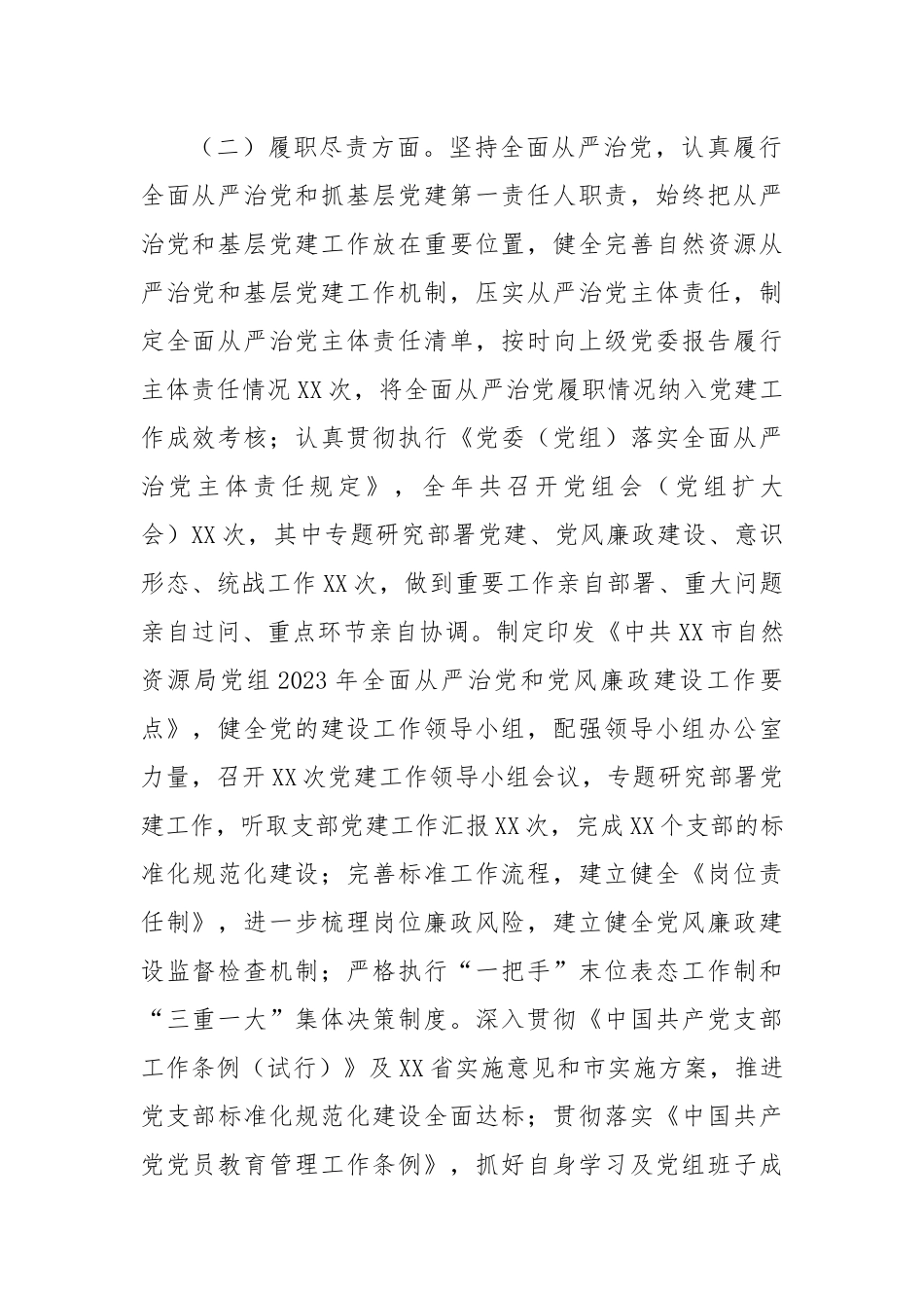 某单位2023年一季度党建工作情况报告根据市委组织部关于认真做好2023年第一季度党建工作情况梳理的通知,XX单位紧紧围绕市委2023年党建工作要点,认真贯彻落实习近平新时代中国特色社会主义思想,狠抓基层党建重点任务落实,现将2023年第一季度党建工作情况报告如下。一、工作开展成效(一)政治建设方面。狠抓习近平新时代中国特色社会主义思想学历,单位班子带头先学先行,通过个人自学、集中学习、交流研讨,做到学习原文弄懂原意。累计开展集中学习XX次,交流研讨XX次;到挂帮的XX及各自然资源所、各矿山企业讲党课XX次;强化党员日常教育培训,采取专题培训等方式,系统学习《中国共产党章程》《中国共产党纪律处分条例》等党规党纪,学习党的XX大精神、学习习近平总书记视察XX重要讲话精神,培训局系统党员干部XX余人次。印发学习培训工作方案,坚持以习近平新时代中国特色社会主义思想为指导,重点围绕党的XX大精神、习近平总书记视察XX重要讲话精神,聚焦工作重点难点,推动党支部和全体党员学懂弄通做实习近平新时代中国特色社会主义思想;健全完善《党组理论中心组学习制度》《党组会议制度》《支部“三会一课”制度》等,将XX对XX的重要指示批示精神全部纳入台账进行动态管理,及时进行跟踪销号;严格落实党组会议“第一议题”制度,强化对支部落实“第一议题”制度情况的监督检查,全年共开展监督检查XX次。(二)履职尽责方面。坚持全面从严治党,认真履行全面从严治党和抓基层党建第一责任人职责,始终把从严治党和基层党建工作放在重要位置,健全完善自然资源从严治党和基层党建工作机制,压实从严治党主体责任,制定全面从严治党主体责任清单,按时向上级党委报告履行主体责任情况XX次,将全面从严治党履职情况纳入党建工作成效考核;认真贯彻执行《党委(党组)落实全面从严治党主体责任规定》,全年共召开党组会(党组扩大会)XX次,其中专题研究部署党建、党风廉政建设、意识形态、统战工作XX次,做到重要工作亲自部署、重大问题亲自过问、重点环节亲自协调。制定印发《中共XX市自然资源局党组2023年全面从严治党和党风廉政建设工作要点》,健全党的建设工作领导小组,配强领导小组办公室力量,召开XX次党建工作领导小组会议,专题研究部署党建工作,听取支部党建工作汇报XX次,完成XX个支部的标准化规范化建设;完善标准工作流程,建立健全《岗位责任制》,进一步梳理岗位廉政风险,建立健全党风廉政建设监督检查机制;严格执行“一把手”末位表态工作制和“三重一大”集体决策制度。深入贯彻《中国共产党支部工作条例(试行)》及XX省实施意见和市实施方案,推进党支部标准化规范化建设全面达标;贯彻落实《中国共产党党员教育管理工作条例》,抓好自身学习及党组班子成员、党员的集中培训和集体学习,认真落实学时制度,实现党员教育工作全覆盖。充分发挥党支部教育管理党员的职责作用,督促落实“三会一课”、主题党日、民主评议党员、领导干部双重组织生活等制度,及时开展新党员入党宣誓、党员重温入党誓词、过政治生日、政治家访、革命传统教育等活动;坚持把政治标准放在首位,严格发展党员程序,动员XX名思想政治素质较高的同志向党组织递交入党申请书,入党积极分子转为发展对象XX名,预备党员转为正式党员XX名。(三)责任落实方面。整治形式主义、官僚主义突出问题负面清单,持续开展监督检查和警示提醒,坚决纠正不担当、不作为、乱作为、假作为等问题,引导全体党员干部履职尽责、真抓实干。组织作风建设“三整治五提升”专项行动,认真落实中央八项规定及其实施细则精神和省委、市委有关要求,紧盯中秋、国庆、元旦等重要节点,及时警示约谈和通报曝光典型案例,严防“四风”反弹回潮。认真落实中央、省、市关于为基层减压减负措施,主动回应基层和群众关切,推动“政策红利”落实到基层。持续完善监督管理机制,强化日常监督,注重抓早抓小,持续整治群众身边的腐败和不正之风。结合自然资源工作实际,加强党风廉政教育,筑牢不敢腐、不能腐、不想腐思想防线,盯牢重点领域,加强风险防控和监督。坚持标本兼治、惩防并举,持之以恒抓好党风廉政...