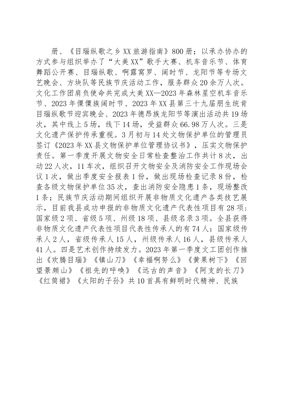 县文化和旅游局2023年第一季度工作总结今年以来,县文化和旅游局深入学习贯彻落实党的二十大精神和习近平总书记考察云南重要讲话精神,围绕州县委提出的“三支柱一标杆”“彰文兴旅”战略目标,不断提高政治站位、扛牢职责使命,通过抓项目促发展、补短板供产品,全力推动XX县文旅产业高质量发展。现将2023年第一季度工作开展总结报告如下:一、主要工作开展情况(一)加强文化阵地建设,推动公共文化服务高质量发展。一是文化阵地服务稳固。2023年县图书馆总藏量为65118册,有各类计算机50台(其中40台提供给读者使用)分别建有德宏州景颇文化工作团、拉影文化中心(国门书社)、中国人民解放军24分队、武警XX中队及新城社区等5个流动图书室1-3月共接待各类读者12364人次,其中县图书馆8399人次,流动图书室3965人次;外借图书期刊3836册次,外借人次3324人次,阅览人次9049人次;持续推进XX县图书馆总分馆制建设,2022年县财政投入资金200万元,用于总馆(XX县图书馆)和11个乡镇级分馆图书室和公共电子阅览室规范化建设。项目计划年底完成并投入运营;XX县图书馆新馆建设工作目前正在积极地推进中,预计年底完成相关建设任务。二是群众文化服务丰富。2023年第一季度县图书馆、文化馆开展文化进万家活动,共发放春联1200幅、发放《中华人民共和国公共文化服务保障法》400册、《中华人民共和国公共图书馆法》400册、《目瑙纵歌之乡XX旅游指南》800册;以承办协办的方式参与组织举办了“大美XX”歌手大赛、机车音乐节、体育舞蹈公开赛、目瑙纵歌、啊露窝罗、阔时节、龙阳节等专场文艺晚会、方块队等民族节庆活动工作,服务群众20余万人次。文化工作团肩负使命共完成大美XX—2023年森林星空机车音乐节、2023年傈僳族阔时节、2023年XX县第三十九届朋生统肯目瑙纵歌节迎宾晚会、2023年德昂族龙阳节等演出活动共19场次,其中线上5场,线下14场,受益群众66.98万人次。三是文化遗产保护传承重视。3月初与14处文物保护单位的管理员签订《2023年XX县文物保护单位管理协议书》,压实文物保护责任。第一季度开展文物安全日常检查整治工作共计8次,出动22人次,11车次,组织召开文物安全及消防安全工作现场会议1次,做出季度安全报表1份,做出现场检查记录8份,检查各级文物保护单位35次,查出消防安全隐患1条,现场整改1条;民族节庆活动期间组织开展非物质文化遗产各类技艺展示,目前我县成功申报的非物质文化遗产代表性项目有28项:国家级2项、省级5项、州级18项、县级名录3项。全县获得非物质文化遗产代表性项目代表性传承人的有74人:国家级传承人2人,省级传承人15人,州级传承人16人,县级传承人41人。四是艺术创作持续发力。2023年第一季度文工团创作推出《欢腾目瑙》《镇山刀》《幸福啊努么》《黄果树下》《回望景颇山》《祖先的呼唤》《远古的声音》《阿支的长刀》《红筒裙》《太阳的子孙》共10首具有鲜明时代精神、民族精神、地域特色又受群众喜闻乐见的优秀歌曲、舞蹈、器乐等文艺精品,通过舞台表演形式呈现给群众,获得了社会各界的好评。(二)文化旅游市场焕发新活力,彰文兴旅初见成效。一是项目固定资产投资稳扎稳打。县文化和旅游局负责的在库重大项目共有5个(龙安土砖文化驿站、龙安水世界、户撒滇缅国际雨林运动公园、京旺温泉度假村二期建设、龙安片区服务中心),第一季度完成固定资产投资3957万元,其中龙安土砖文化驿站完成投资2747万元、龙安水世界完成投资300万元、京旺温泉二期完成投资0万元、户撒滇缅国际雨林运动公园完成投资10万元;二是旅游经济开局良好。XX县现有限上住宿单位4家(翠之魂酒店、鑫乐酒店、云素酒店、鑫方圆酒店),第一季度完成营业收入217.68万元,同比增长20.16%。2023年第一季度全县预计接待旅游人数63.62万人次,预计同比增长83.5%。2023年第一季度全县预计完成旅游收入5.48亿元,预计同比增长78.5%。三是文化旅游市场规范有序。全县共有文旅行业场所64家,其中文化行业企业(场所)52家(网吧5家、KTV43家、酒吧2家、音像制品2家、电影院1家);旅游行业企业11家(其中:星级宾馆2家,旅行社分社及服务网点2家,旅游企业7家)。2023年...