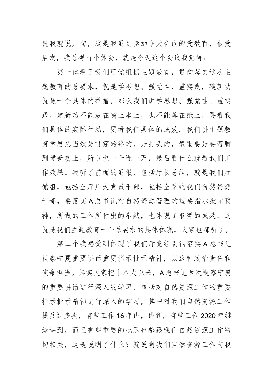 主题教育督导组组长在“大起底”“回头看”汇报会上的讲话贯彻落实A总书记视察宁夏重要讲话,重要指示批示精神,大起底回头看,也是自治区党委结合我们自然资源实际部署的这次主题教育的五大载体之一,这个内容很重要。自治区党委召开了大起底回头看的工作会议,对A总书记视察宁夏的重要讲话精神,对自然资源工作的一系列指示批示精神进行了全面的梳理,进行了回头看,自治区党政各位领导都结合分管的工作又如何落实的,做了情况通报,进行了工作交流。那么今天自然资源厅党组召开这样一个会议,传达学习党委大起底回头看的会议精神,对厅系统厅党组全厅的工作厅系统工作也进行安排部署,我觉得今天这个会很重要很有意义。会议开始时候,世民副厅长通报了我们自然资源厅大起底回头看的基本情况,听了之后确实还是很有感触,各位厅领导也结合自己分管的工作进行进行了交流,厅长代表全厅大起底回头看,特别是结合我们自然资源工作进行了一个全面的总结,也梳理了指出了存在的问题,并对下一步的工作大起底回头看,包括主题教育工作进行了再次的安排部署。我今天参加这个会议,我是本着学习的态度来听大家的情况和意见建议,没有做讲话,没有想学讲话,刚厅长让我说我就说几句,这是我通过参加今天会议的受教育,很受启发,我总得有个体会,就是今天这个会议我觉得:第一体现了我们厅党组抓主题教育,贯彻落实这次主题教育的总要求,就是学思想、强党性、重实践,建新功就是一个具体的举措。那么我们讲学思想、强党性、重实践,建新功不能放在嘴上本上,也不能落在纸上,要看我们具体的实际行动,要看我们具体的成效。我们讲主题教育学思想当然是贯穿始终的,是打头的,最重要是要落脚到建新功上,所以说一千道一万,最后看什么就看我们工作效果。我听了前面的通报,包括厅长总结,就是我们厅党组,包括全厅广大党员干部,包括全系统我们自然资源干部,要落实A总书记对自然资源管理的重要指示批示精神,所做的工作所付出的奉献,也体现了取得的成效,这就是我们主题教育一个总要求的具体体现,大家也都听了。第二个我感觉到体现了我们厅党组贯彻落实A总书记视察宁夏重要讲话重要指示批示精神,以这种政治责任和使命担当。其实大家把十八大以来,A总书记两次视察宁夏的重要讲话进行深入的学习,包括对自然资源工作的重要指示批示精神进行深入的学习,其中对我们自然资源工作提及过多次,有些工作16年讲,讲到,有些工作2020年继续讲到,而且有些重要的批示也都跟我们自然资源工作密切相关,这是说明了什么?就说明我们自然资源工作与我们经济社会发展,与A总书记对宁夏发展的殷切希望息息相关,为什么有些工作A总书记16年来讲,2020年来继续还在讲,包括十八大之前A总书记来的,他当政治局常委那是哪一年来的?这97年还来过一次,因为我们大家都是搞具体工作的,确实我们自然环境,我们的生态很脆弱,特别我们中部包括六盘固原来确实很脆弱,所以A总书记极力关注,包括我们三山的保护,我觉得在这方面我听了之后,确实也体现了我们厅党组,我们全厅的党员干部贯彻落实A总书记重要指示重要批示,视察宁夏重要讲话,我们应该承担什么?我们应该做什么?我们不是要强调要筑牢A总书记怎么说我们就怎么干的政治忠诚,就是一个具体体现。我觉得这是一种使命,一种责任,一种担当。第三点我听了之后,自然资源工作确实是一个系统的综合性的工作,有些工作说起来容易,确实做起来很难,有些问题的形成长期的各种各样的原因,而是解决起来不是说一下就可以解决的,不是说一蹴就能一蹴而就的,我们三山的治理,但是又是在这样比较复杂的情况下,能形成这样的效果,我也觉得体现了我们厅党组我们厅党员干部,包括全系统干部的这种精神状态,良好的精神状态和深入的扎实的工作作风工作作风,没有大家的努力,没有大家有良好的精神状态,甚至不断的去推动去实践,我觉得有些事可能也还是比较难。因为有些工作确实不光是我们系统要做,是各地各部门乃至全社会要共同来努力的,共同来努力的,所以我觉得也体现了我们党员干部的良好的精神状态,扎实工作作风,我们讲学思想,要做到深化、内化、转化,...