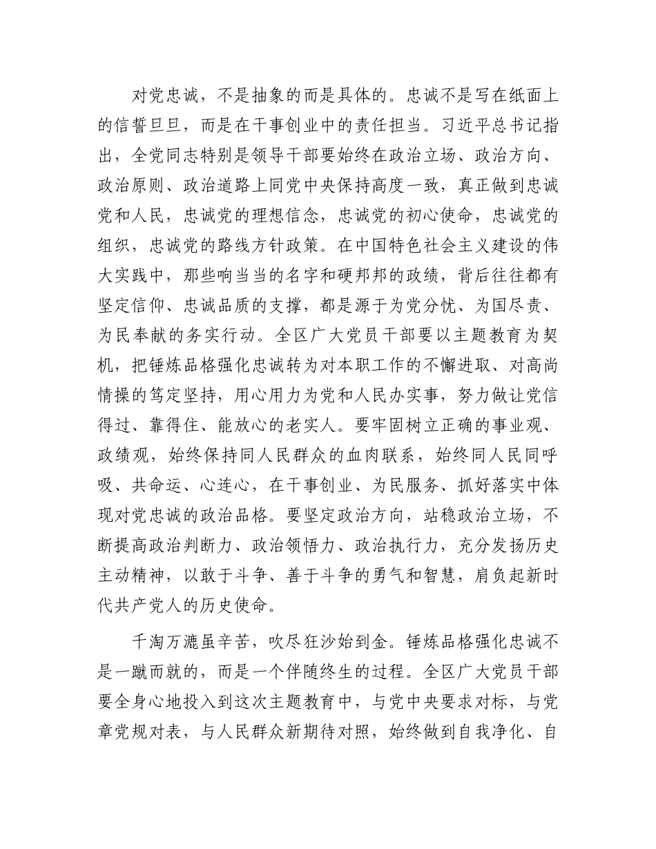 交流研讨发言:在锤炼品格强化忠诚中增强政治觉悟一、锤炼品格强化忠诚是共产党人的政治本色锤炼品格强化忠诚是共产党人的政治本色,是我们党与生俱来的政治基因。我们党自诞生之日起,就把对党忠诚作为对党员的一贯要求,习近平总书记深刻指出:“我们党一路走来,经历了无数艰险和磨难,但任何困难都没有压垮我们,任何敌人都没能打倒我们,靠的就是千千万万党员的忠诚。”当前,世界百年未有之大变局加速演进,世界之变、时代之变、历史之变特征更加明显,越是形势复杂、越是任务艰巨,越要求我们对党忠诚。只有不断锤炼品格强化忠诚,全区广大党员干部才能为党和人民事业勇挑重担,才能在推动全面振兴新征程上作出无负时代、无负历史、无负人民的业绩。二、锤炼品格强化忠诚就是要筑牢理想信念根基理想信念是共产党人精神上的钙,也是安身立命的根本。筑牢理想信念的根基,关键在理论学习。只有理论上清醒,政治上才能坚定,理想信念才能笃定,才有对党忠诚。作为当代中国马克思主义、二十一世纪马克思主义,习近平新时代中国特色社会主义思想贯穿着对中国共产党人政治品格、价值追求、精神境界、作风操守的要求,具有强大真理力量和实践伟力,是我们认识世界和改造世界的强大思想武器。我们要深入学习贯彻习近平新时代中国特色社会主义思想,掌握蕴含其中的世界观、方法论和贯穿其中的立场观点方法,切实解决好世界观、人生观、价值观这个根本问题。通过理论学习,不断增进对中国共产党领导和中国特色社会主义的政治认同、思想认同、理论认同、情感认同,深刻领会“两个确立”的决定性意义,推动学习贯彻习近平新时代中国特色社会主义思想往深里走、往实里走、往心里走,坚持读原著、学原文、悟原理,多思多想、学深悟透。增强忠诚核心、拥戴核心、维护核心、捍卫核心的政治自觉、思想自觉、行动自觉。每个党员干部都要突出强化忠诚的问题导向,自觉接受政治体验,把自己摆进去、把工作摆进去、在一次次与党中央要求对标、与党章党规对表中查找自身不足,锤炼品格强化忠诚。三、锤炼品格强化忠诚关键在干事创业对党忠诚,不是抽象的而是具体的。忠诚不是写在纸面上的信誓旦旦,而是在干事创业中的责任担当。习近平总书记指出,全党同志特别是领导干部要始终在政治立场、政治方向、政治原则、政治道路上同党中央保持高度一致,真正做到忠诚党和人民,忠诚党的理想信念,忠诚党的初心使命,忠诚党的组织,忠诚党的路线方针政策。在中国特色社会主义建设的伟大实践中,那些响当当的名字和硬邦邦的政绩,背后往往都有坚定信仰、忠诚品质的支撑,都是源于为党分忧、为国尽责、为民奉献的务实行动。全区广大党员干部要以主题教育为契机,把锤炼品格强化忠诚转为对本职工作的不懈进取、对高尚情操的笃定坚持,用心用力为党和人民办实事,努力做让党信得过、靠得住、能放心的老实人。要牢固树立正确的事业观、政绩观,始终保持同人民群众的血肉联系,始终同人民同呼吸、共命运、心连心,在干事创业、为民服务、抓好落实中体现对党忠诚的政治品格。要坚定政治方向,站稳政治立场,不断提高政治判断力、政治领悟力、政治执行力,充分发扬历史主动精神,以敢于斗争、善于斗争的勇气和智慧,肩负起新时代共产党人的历史使命。千淘万漉虽辛苦,吹尽狂沙始到金。锤炼品格强化忠诚不是一蹴而就的,而是一个伴随终生的过程。全区广大党员干部要全身心地投入到这次主题教育中,与党中央要求对标,与党章党规对表,与人民群众新期待对照,始终做到自我净化、自我完善、自我革新、自我提高,在全面建设社会主义现代化国家的实践中书写绝对忠诚,努力创造出经得起实践、人民、历史检验的实绩,以实际行动诠释对党忠诚。
