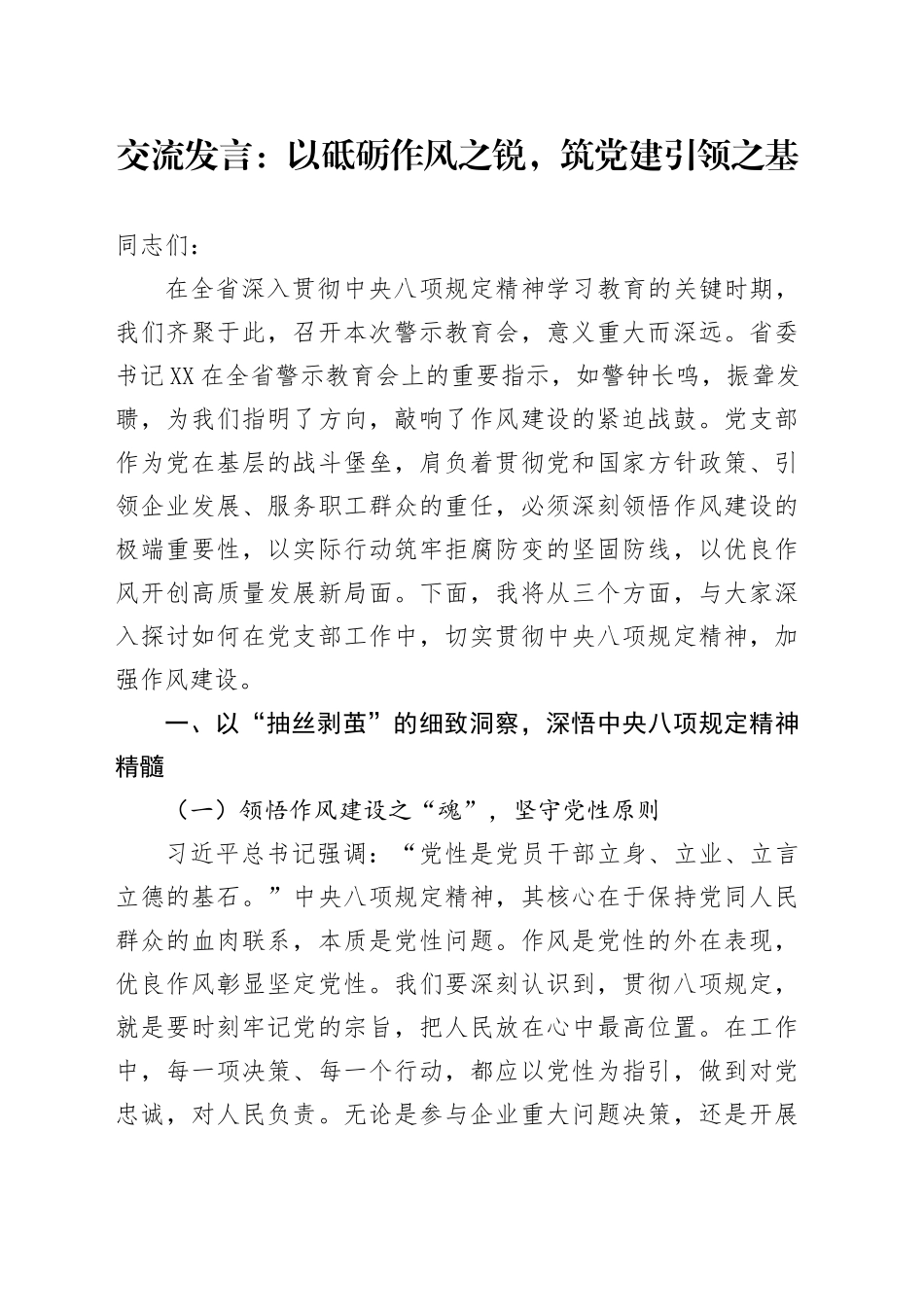 交流发言:以砥砺作风之锐,筑党建引领之基同志们:在全省深入贯彻中央八项规定精神学习教育的关键时期,我们齐聚于此,召开本次警示教育会,意义重大而深远。省委书记XX在全省警示教育会上的重要指示,如警钟长鸣,振聋发聩,为我们指明了方向,敲响了作风建设的紧迫战鼓。党支部作为党在基层的战斗堡垒,肩负着贯彻党和国家方针政策、引领企业发展、服务职工群众的重任,必须深刻领悟作风建设的极端重要性,以实际行动筑牢拒腐防变的坚固防线,以优良作风开创高质量发展新局面。下面,我将从三个方面,与大家深入探讨如何在党支部工作中,切实贯彻中央八项规定精神,加强作风建设。一、以“抽丝剥茧”的细致洞察,深悟中央八项规定精神精髓(一)领悟作风建设之“魂”,坚守党性原则习近平总书记强调:“党性是党员干部立身、立业、立言立德的基石。”中央八项规定精神,其核心在于保持党同人民群众的血肉联系,本质是党性问题。作风是党性的外在表现,优良作风彰显坚定党性。我们要深刻认识到,贯彻八项规定,就是要时刻牢记党的宗旨,把人民放在心中最高位置。在工作中,每一项决策、每一个行动,都应以党性为指引,做到对党忠诚,对人民负责。无论是参与企业重大问题决策,还是开展思想政治工作,都要以党性原则为衡量标准,确保方向不偏、立场不移。坚决摒弃任何违背党性的行为,杜绝形式主义、官僚主义,以扎实的工作作风,诠释对党的忠诚,践行对人民的承诺,让党性的光辉在作风建设中熠熠生辉。(二)把握纪律规矩之“纲”,严守行为底线“欲知平直,则必准绳;欲知方圆,则必规矩。”中央八项规定及其实施细则,是新时代党员干部必须严守的纪律规矩。它涵盖了工作、生活的方方面面,从公务接待、办公用房,到廉洁自律、履职尽责,都划出了清晰的红线。我们党支部成员,要将这些纪律规矩内化于心、外化于行。在支持股东会、董事会、监事会和经理依法行使职权过程中,严格按规矩办事,不越权、不逾矩。在与职工群众交往中,严守廉洁纪律,不以权谋私,不接受不正当利益。时刻保持敬畏之心,明白哪些可为、哪些不可为,以纪律规矩约束自己的言行举止,做到心有所畏、言有所戒、行有所止,让纪律规矩成为不可触碰的高压线。(三)明晰作风建设之“责”,勇担使命担当“为天地立心,为生民立命,为往圣继绝学,为万世开太平。”这是古人的担当,而在新时代,我们党员干部肩负着推动党和国家事业发展、实现中华民族伟大复兴的历史使命。中央八项规定精神的贯彻落实,需要我们每一位同志勇担责任。党支部要发挥战斗堡垒作用,将作风建设纳入重要议事日程,明确责任分工,层层压实责任。支委成员要以身作则,带头遵守规定,同时加强对党员的教育管理监督。在工作中,面对困难和挑战,不能推诿扯皮、敷衍塞责,要主动作为、勇于担当。无论是在企业发展的关键时刻,还是在服务职工群众的日常工作中,都要以高度的责任感,积极履行职责,为企业发展、职工幸福贡献力量,以实际行动诠释对作风建设责任的担当。二、以“刮骨疗毒”的坚定决心,查摆党支部作风建设问题(一)思想认识之“蔽”,亟待拨云见日“求木之长者,必固其根本;欲流之远者,必浚其泉源。”思想是行动的先导,当前部分党员对中央八项规定精神的思想认识仍存在偏差。有的认为八项规定只是一阵风,过了风头就没事了;有的对规定的内涵理解不深,只知其然不知其所以然。这导致在实际工作中,执行规定不坚决、不到位。我们必须深刻反思,加强思想教育,通过集中学习、专题研讨、警示教育等多种形式,让党员干部真正认识到八项规定精神的重大意义和长期性,从思想根源上筑牢防线,驱散思想上的迷雾,坚定贯彻落实的决心,让正确的思想认识引领行动。(二)工作落实之“虚”,务须真抓实干习近平总书记指出:“一分部署,九分落实。”在落实中央八项规定精神过程中,我们存在工作落实不到位的情况。比如在精简会议文件方面,虽然会议数量有所减少,但部分会议质量不高,文件冗长空洞,没有真正解决实际问题。在执行过程中,存在打折扣、搞变通的现象。这与八项规定精神背道而驰。我们要树立正确的政绩观,真抓实干,对于...