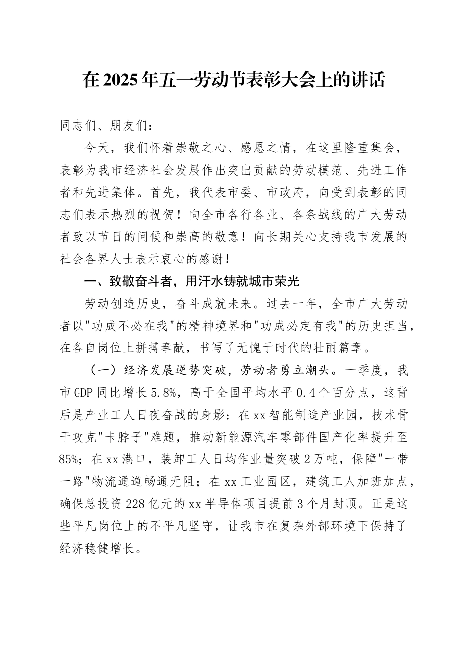 在2025年五一劳动节表彰大会上的讲话同志们、朋友们:今天,我们怀着崇敬之心、感恩之情,在这里隆重集会,表彰为我市经济社会发展作出突出贡献的劳动模范、先进工作者和先进集体。首先,我代表市委、市政府,向受到表彰的同志们表示热烈的祝贺!向全市各行各业、各条战线的广大劳动者致以节日的问候和崇高的敬意!向长期关心支持我市发展的社会各界人士表示衷心的感谢!一、致敬奋斗者,用汗水铸就城市荣光劳动创造历史,奋斗成就未来。过去一年,全市广大劳动者以"功成不必在我"的精神境界和"功成必定有我"的历史担当,在各自岗位上拼搏奉献,书写了无愧于时代的壮丽篇章。(一)经济发展逆势突破,劳动者勇立潮头。一季度,我市GDP同比增长5.8%,高于全国平均水平0.4个百分点,这背后是产业工人日夜奋战的身影:在xx智能制造产业园,技术骨干攻克"卡脖子"难题,推动新能源汽车零部件国产化率提升至85%;在xx港口,装卸工人日均作业量突破2万吨,保障"一带一路"物流通道畅通无阻;在xx工业园区,建筑工人加班加点,确保总投资228亿元的xx半导体项目提前3个月封顶。正是这些平凡岗位上的不平凡坚守,让我市在复杂外部环境下保持了经济稳健增长。(二)科技创新捷报频传,劳动者开拓进取。从实验室到生产一线,科技工作者用智慧点燃创新引擎。市农科院团队培育的"xx超级稻"亩产突破900公斤,助力粮食安全;xx新能源公司研发的固态电池技术获国际专利,推动我市新能源产业跻身全球第一方阵;"最美巾帼奋斗者"赵春玲带领团队攻克大飞机复合材料技术,为C929项目贡献xx力量。全市高新技术企业数量突破1200家,科技进步贡献率达68%,这些数字背后,是无数科研工作者"十年磨一剑"的执着。(三)民生福祉持续改善,劳动者温暖守护。在医疗战线,白衣天使日夜守护生命防线,市人民医院胸痛中心平均救治时间缩短至38分钟;在教育领域,乡村教师扎根偏远山区,让每一个孩子都能享受优质教育;在基层治理一线,社区工作者化解矛盾纠纷,创建"无讼社区"23个。特别是在老旧小区改造中,施工人员克服重重困难,完成3.3万户燃气管道改造,让群众用上安全清洁的能源。这些看似微小的改变,汇聚成人民群众实实在在的获得感。(四)乡村振兴蹄疾步稳,劳动者挥洒汗水。广袤田野间,新型职业农民探索"农业+旅游"模式,打造生态农场37个;返乡创业者带动5000余名村民就业,特色农产品线上销售额增长40%;基层干部创新"党支部+合作社+农户"模式,村集体经济年收入超百万元的行政村达127个。正如"最美巾帼奋斗者"李娜倮带领乡亲们将拉祜族歌舞转化为旅游资源,让小山村变身4A级景区,我市农村正焕发着产业兴、生态美、农民富的勃勃生机。二、弘扬劳动精神,凝聚高质量发展动能劳动模范是时代的标杆,是全市人民学习的榜样。今天受到表彰的先进典型,既有深耕一线的产业工人,也有勇攀高峰的科技精英;既有扎根基层的乡村振兴带头人,也有守护平安的人民警察。他们身上集中体现了"爱岗敬业、争创一流,艰苦奋斗、勇于创新,淡泊名利、甘于奉献"的劳模精神,是激励全市人民奋进的宝贵精神财富。(一)坚定理想信念,做听党话跟党走的排头兵。劳动模范始终与党和国家同呼吸、共命运。全国劳模、xx集团焊工班长王xx,30年如一日坚守岗位,用精湛技艺为国产航母建造贡献力量,他常说:"焊接的不仅是钢板,更是对党和国家的忠诚。"广大劳动者要以他们为榜样,深刻领悟"两个确立"的决定性意义,增强"四个意识"、坚定"四个自信"、做到"两个维护",在投身改革发展中实现人生价值。(二)勇担时代使命,做高质量发展的主力军。当前,我市正处于转型升级的关键期。省劳模、xx科技公司工程师张xx带领团队研发的工业机器人,使企业生产效率提升300%,成本降低40%;全国五一劳动奖章获得者、xx医院主任医师李xx创新"互联网+医疗"模式,让偏远地区患者也能享受三甲医院服务。广大劳动者要立足岗位创新创造,聚焦"卡脖子"技术攻关、数字化转型、绿色低碳发展等领域,以"匠心"铸"匠魂",推动我市在新一轮科技革命中抢占先机。(三)厚植为民情怀,做美好生活的创造者。劳动模范始终把人民放在心中最高位置。市劳模、社区书...