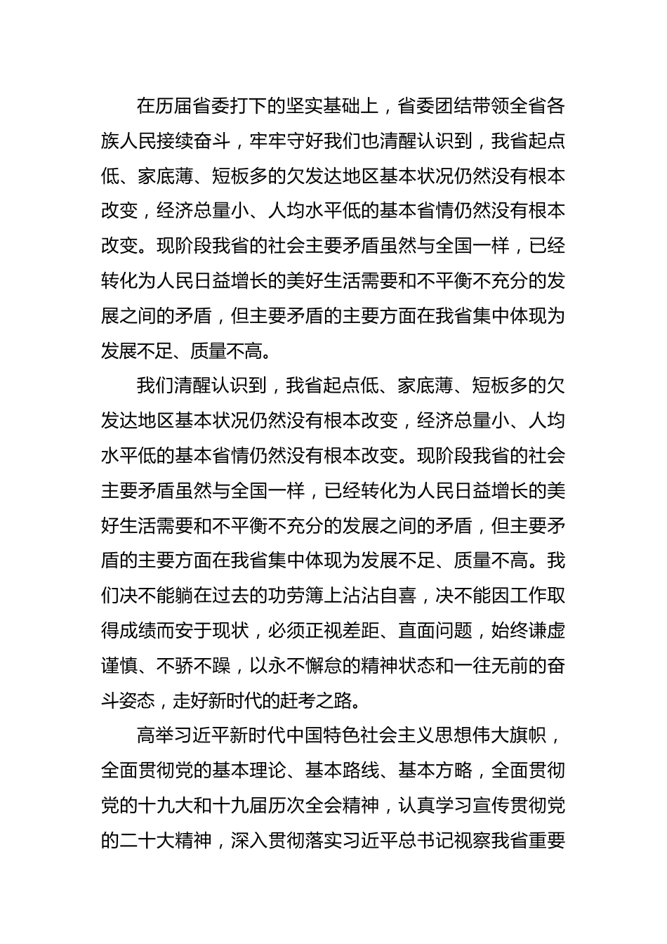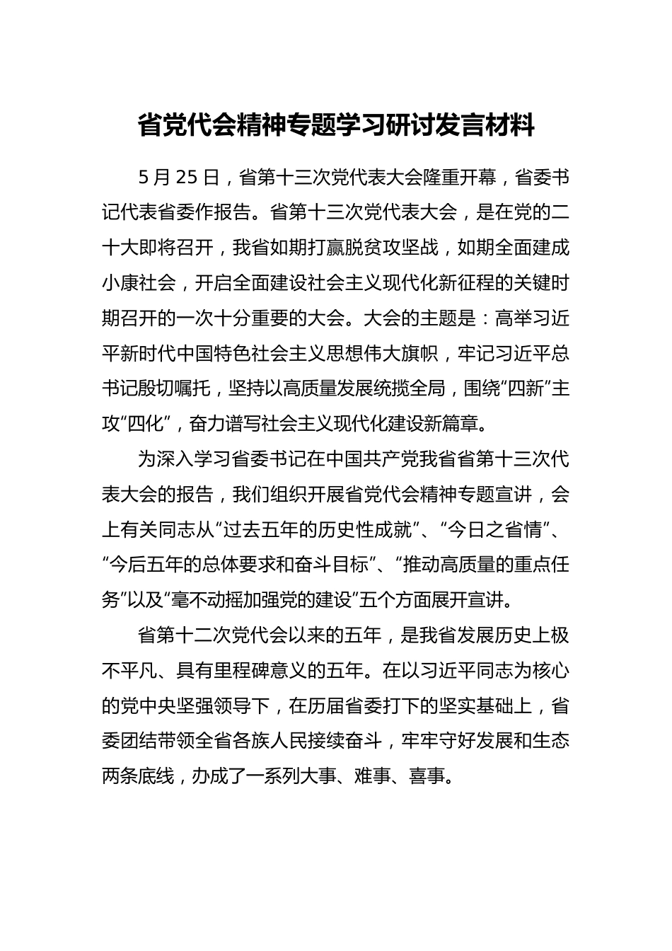 省党代会精神专题学习研讨发言材料5月25日,省第十三次党代表大会隆重开幕,省委书记代表省委作报告。省第十三次党代表大会,是在党的二十大即将召开,我省如期打赢脱贫攻坚战,如期全面建成小康社会,开启全面建设社会主义现代化新征程的关键时期召开的一次十分重要的大会。大会的主题是:高举习近平新时代中国特色社会主义思想伟大旗帜,牢记习近平总书记殷切嘱托,坚持以高质量发展统揽全局,围绕“四新”主攻“四化”,奋力谱写社会主义现代化建设新篇章。为深入学习省委书记在中国共产党我省省第十三次代表大会的报告,我们组织开展省党代会精神专题宣讲,会上有关同志从“过去五年的历史性成就”、“今日之省情”、“今后五年的总体要求和奋斗目标”、“推动高质量的重点任务”以及“毫不动摇加强党的建设”五个方面展开宣讲。省第十二次党代会以来的五年,是我省发展历史上极不平凡、具有里程碑意义的五年。在以习近平同志为核心的党中央坚强领导下,在历届省委打下的坚实基础上,省委团结带领全省各族人民接续奋斗,牢牢守好发展和生态两条底线,办成了一系列大事、难事、喜事。在历届省委打下的坚实基础上,省委团结带领全省各族人民接续奋斗,牢牢守好我们也清醒认识到,我省起点低、家底薄、短板多的欠发达地区基本状况仍然没有根本改变,经济总量小、人均水平低的基本省情仍然没有根本改变。现阶段我省的社会主要矛盾虽然与全国一样,已经转化为人民日益增长的美好生活需要和不平衡不充分的发展之间的矛盾,但主要矛盾的主要方面在我省集中体现为发展不足、质量不高。我们清醒认识到,我省起点低、家底薄、短板多的欠发达地区基本状况仍然没有根本改变,经济总量小、人均水平低的基本省情仍然没有根本改变。现阶段我省的社会主要矛盾虽然与全国一样,已经转化为人民日益增长的美好生活需要和不平衡不充分的发展之间的矛盾,但主要矛盾的主要方面在我省集中体现为发展不足、质量不高。我们决不能躺在过去的功劳簿上沾沾自喜,决不能因工作取得成绩而安于现状,必须正视差距、直面问题,始终谦虚谨慎、不骄不躁,以永不懈怠的精神状态和一往无前的奋斗姿态,走好新时代的赶考之路。高举习近平新时代中国特色社会主义思想伟大旗帜,全面贯彻党的基本理论、基本路线、基本方略,全面贯彻党的十九大和十九届历次全会精神,认真学习宣传贯彻党的二十大精神,深入贯彻落实习近平总书记视察我省重要讲话精神,牢牢把握国发〔2022〕2号文件的重大机遇,坚持稳中求进工作总基调,立足新发展阶段,完整、准确全面贯彻新发展理念,融入新发展格局,坚持以高质量发展统揽全局,坚持以人民为中心的发展思想,守好发展和生态两条底线,统筹发展和安全,坚持围绕“四新”主攻“四化”主战略,全力建设“四区一高地”,奋力谱写多彩我省现代化建设新篇章,是我省今后五年工作的总体要求。今后五年,要着力抓好七个方面重点任务,一是坚定不移推动“四化”,构建支撑高质量发展的现代产业体系;二是深化改革扩大开放激活创新汇聚人才,增强高质量发展的动力活力;三是践行以人民为中心的发展思想,让人民群众在高质量发展中共享高品质生活;四是做好绿水青山就是金山银山这篇大文章,厚植高质量发展的生态优势;五是大力发展社会主义民主法治,汇聚高质量发展的强大合力;六是繁荣多彩我省特色文化,凝聚高质量发展的强大精神力量;七是统筹发展和安全,为高质量发展营造和谐稳定的良好环境,奋力在新时代西部大开发上闯新路。坚持和加强党的全面领导,深入贯彻新时代党的建设总要求和新时代党的组织路线,大力弘扬伟大建党精神,大力弘扬长征精神和“坚定信念、坚持真理、独立自主、团结统一”的遵义会议精神,永葆自我革命精神,不断提高党的政治领导力、思想引领力、群众组织力、社会号召力,以高质量党建引领高质量发展。在新时代的长征路上,作为基础教育阶段的教师,我们应充满无比的自信、无穷的力量,立足于本职岗位,从身边的点滴小事做起,更加紧密地团结在以习近平同志为核心的党中央周围,牢记领袖嘱托、迎接党的二十大胜利召开