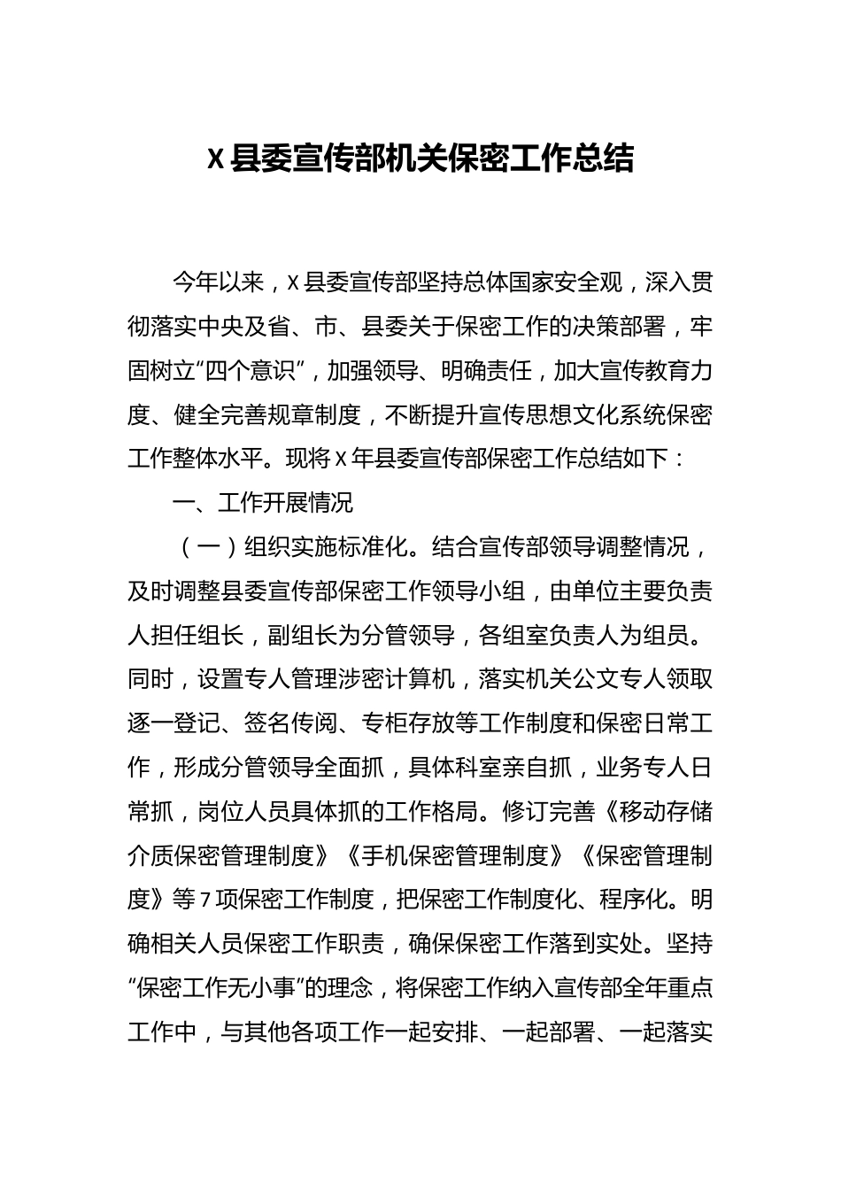X县委宣传部机关保密工作总结今年以来,X县委宣传部坚持总体国家安全观,深入贯彻落实中央及省、市、县委关于保密工作的决策部署,牢固树立“四个意识”,加强领导、明确责任,加大宣传教育力度、健全完善规章制度,不断提升宣传思想文化系统保密工作整体水平。现将X年县委宣传部保密工作总结如下:一、工作开展情况(一)组织实施标准化。结合宣传部领导调整情况,及时调整县委宣传部保密工作领导小组,由单位主要负责人担任组长,副组长为分管领导,各组室负责人为组员。同时,设置专人管理涉密计算机,落实机关公文专人领取逐一登记、签名传阅、专柜存放等工作制度和保密日常工作,形成分管领导全面抓,具体科室亲自抓,业务专人日常抓,岗位人员具体抓的工作格局。修订完善《移动存储介质保密管理制度》《手机保密管理制度》《保密管理制度》等7项保密工作制度,把保密工作制度化、程序化。明确相关人员保密工作职责,确保保密工作落到实处。坚持“保密工作无小事”的理念,将保密工作纳入宣传部全年重点工作中,与其他各项工作一起安排、一起部署、一起落实强化定密、网络保密、涉密人员管理等三项制度,着力实现定密精准化,网络保密管理“谁主管谁负责、谁使用谁负责”的原则,进一步提高新形势下的保密工作水平。(二)教育前置常态化。加强宣传部及各下属单位干部保密知识和保密常识宣传教育培训,组织全体干部专题学习《保密法》《实施办法》等保密工作相关法律规章制度。积极派遣新入职的X名干部参加全县保密工作培训,规范日常保密管理、掌握保密知识技能,做到懂保密、善保密、会保密。利用周一例会,组织全体干部及时传达学习中省市《泄密案件通报》,通过失泄密案件的反面案例教育,教育引导大家要时刻绷紧保密这根弦,坚决执行克服麻痹大意和懈怠思想,做到警钟长鸣。邀请专业人员开展保密知识专题培训,加强保密工作领导干部责任制、涉密载体管理、涉密人员管理、技术防范和要害部门管理等保密知识的培训,切实增强做好保密工作的责任感和使命感严守“安全底线”,杜绝失密、泄密事件发生。对涉密人员及部领导、各组室负责人,分别签订了《保密承诺书》,要求不定期开展保密自查自评工作,发现问题立行立改,进一步落实保密责任。(三)隐患检查精细化。不断强化日常安全防范措施重大节日、重要政治活动期间,及时召开部长办公会议,安排部署对重点保密部位的安全防范工作,做好值班工作确保保密措施落到实处。坚持查管结合、查改结合,查处结合、查教结合的方式,每月对各组室办、站、中心开展自查检查,对保密检查工具查出来的疑似文件逐份进行判定,生成保密检查报告并由组室办自行保存备查。对配备的X台保密电脑、X台保密打印机和X台操作网评指令系统平板电脑,粘贴密级和警示标识,并设置登录密码,警示提防泄密、失密事件发生。相关单导传输系统和X台网络安全专用检测软件均正常运行。不定期对涉密设备、系统和软件运行状况进行安全检查。积极开展X年X第十届国家网络安全宣传周系列活动,组织全县各单位开展网络安全自查X次,邀请省网络安全技术员进行全县关键信息基础设施单位网络安全大检查X次,下发整改通知单X份,及时消除网络安全隐患。二、存在问题虽然我们在保密工作中取得了一定的成绩,但也存在一些不足,主要表现在,一是部分干部对保密工作重视还不够。二是保密制度执行还不够严格。三是对计算机网络的保密管理还缺乏完全有保障的技术支持。三、下一步工作打算在今后的工作中,我们将认真把握新常态下保密工作的重要性,全面加强安全保密能力建设,加大保密宣传教育和督促检查,促进保密工作取得新成绩,保障宣传思想文化工作顺利开展。一是加强理论学习,深化思想认识。通过集体学和个人自学相结合的方式,多渠道对全体干部进行宣传教育,组织全体干部认真学习单位各项制度,将各类保密学习文件及时转发各组室,切实做到从思想上重视保密工作,确保计算机及其网络安全。二是推进安可替代,提升安全水平。全面清查摸底,掌握国产电脑和正版软件使用情况,按照全县安可替代项目有关工作要求,逐步完成国产化电脑及相关办公软件的全面配置,从源头...