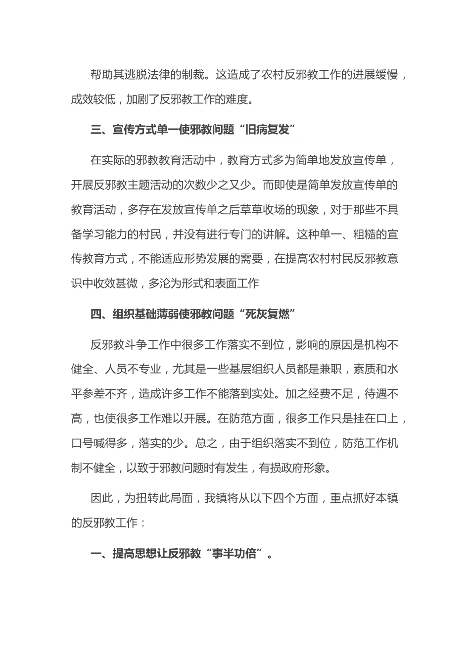 在全县反邪教工作推进会上的表态发言尊敬的各位领导:大家好,按照会议安排,我代表***镇党委、政府,现就全镇反邪工作做如下表态发言:***镇辖3个行政村、4个社区,属地管理人口数量占全县总人口数的80%以上,近年来,随着经济的发展,邪教组织在基层“暗流涌动”,邪教人员也越来越突出隐蔽,邪教人员已经成为影响我镇社会治安稳定的一个重要因素。在市、县高度重视和有力领导下,我们做了大量工作,虽取得了一些成绩,但反邪教工作面临的形势仍然比较严峻,存在的困难和问题还很多,主要表现在:一、思想认识不足使邪教问题“屡见不鲜”有些干部,没有深刻认识邪教组织反人类、反社会、反科学的邪恶本质和企图颠覆我党政权的丑恶政治面目,对反邪教斗争的性质及长期性、复杂性、艰巨性认识不足,忽视了反邪教工作的重要作用,存在松懈麻痹思想和畏难厌战情绪,在一定程度上影响了专项斗争工作的深入推进。二、打击力度有限使邪教问题“屡禁不止”由于基层多表现为熟人社会,乡镇干部或村干部在反邪教工作的开展过程中,常常出于血缘或亲缘关系的考虑而出现执法不严的现象。而有的村民阻碍执法人员进村执法,保护参与邪教组织的亲人或朋友,帮助其逃脱法律的制裁。这造成了农村反邪教工作的进展缓慢,成效较低,加剧了反邪教工作的难度。三、宣传方式单一使邪教问题“旧病复发”在实际的邪教教育活动中,教育方式多为简单地发放宣传单,开展反邪教主题活动的次数少之又少。而即使是简单发放宣传单的教育活动,多存在发放宣传单之后草草收场的现象,对于那些不具备学习能力的村民,并没有进行专门的讲解。这种单一、粗糙的宣传教育方式,不能适应形势发展的需要,在提高农村村民反邪教意识中收效甚微,多沦为形式和表面工作四、组织基础薄弱使邪教问题“死灰复燃”反邪教斗争工作中很多工作落实不到位,影响的原因是机构不健全、人员不专业,尤其是一些基层组织人员都是兼职,素质和水平参差不齐,造成许多工作不能落到实处。加之经费不足,待遇不高,也使很多工作难以开展。在防范方面,很多工作只是挂在口上,口号喊得多,落实的少。总之,由于组织落实不到位,防范工作机制不健全,以致于邪教问题时有发生,有损政府形象。因此,为扭转此局面,我镇将从以下四个方面,重点抓好本镇的反邪教工作:一、提高思想让反邪教“事半功倍”。坚持把反邪教工作作为贯彻总体国家安全观、维护社会和谐稳定、构建新时代文明乡风的重要政治任务,增强忧患意识,组织召开工作部署会,研判形势,掌握情况,解决具体问题。二、工作服务让反邪教“声势壮大”。将防范邪教工作纳入村两委全年重点工作,定期进行工作交流,确定年度宣传目标。针对本辖区涉邪教人员,两委要在班子会议上研究和部署,分析形势,并定期对其进行走访,按照“不漏一户、不漏一人”的原则,充分网格化管理职能和网格员作用,严格落实本辖区涉邪教人员动态摸排工作机制,坚持做到人员信息、场所信息底数清,情况明,全面掌握涉邪教人员动态,逐人制定管控措施,并严格落实,及时掌握邪教人员思想动态和现实表现。三、精准宣传让反邪教“余音绕梁”。一是加强宣传栏建设。在老人协会、村委大楼等人流集中地,设置反邪专窗,并定期张贴“警钟”等宣传资料。二是强化村级场所宣传。在村委办公楼、便民服务中心、农家书屋等显要处要设置宣传标语,放置反邪教书籍和其他反邪宣传资料。三是发挥文化礼堂作用,建立精神家园。设置反邪教宣传专窗、专栏、电子屏、设立反邪教阅读室,并利用文化礼堂讲坛定期播放反邪教影音短片等,形成村居常态化的宣传防范阵地。四、众志成城让邪教在全镇“无处遁形”。一是引导群众开展各种健康文明的文体活动,营造健康向上的氛围。二是注重爱心帮扶,解决群众所急所难,开展爱心公益活动。发挥党员先锋带头作用;关注弱势群体,帮助困难群众,以印有防邪反邪字样的毛巾、雨伞、茶杯等生活用品为礼物,开展“送温暖、献爱心”活动,尽心处理信访、低保、救济等与群众切身利益相关的事情,帮助其免被邪教分子入侵。今后我镇将以本次会议为契机,在实际工作中,常态化不断创新宣传载体,精细化不断...
