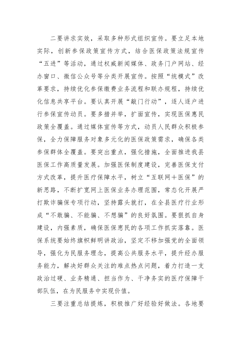 XX医保局长在2023年全县基本医保全民参保计划集中宣传活动启动仪式上的讲话同志们:为更好推动全县医保政策宣传工作,进一步提高人民群众对医疗保障的认可度和医保政策的知晓度,激发人民群众参加医疗保险热情,更好享受医保待遇,今天,我们汇聚县体育馆,隆重举行基本医保全民参保计划集中宣传活动启动仪式。根据会议安排,相关镇的通知已经做了表态发言,我局**同志也对基本医保全民参保计划进行了部署安排,下面,我讲几点意见。一要积极采取措施,突破参保瓶颈。针对不同人群,从政策、技术、服务等方面采取措施,巩固和拓展医疗保险参保成果。开展全民参保计划集中宣传,是提升医疗保障政策知晓度、增强群众参保意愿、督促企业履行参保缴费义务、助推医保参保扩面的重要举措。基本医保覆盖全民是“国之大者”,是人民群众获得享受医保待遇和服务的根本前提,是医保事业发展的全局性、基础性、先导性工作。各级医保部门要统一思想认识,强化责任担当,精心谋划部署,主动对接联合财政、教育、卫生健康、税务等部门,主要负责同志要亲自部署、亲自推动,认真组织好、开展好集中宣传活动,持续巩固参保成果。二要讲求实效,采取多种形式组织宣传。要立足本地实际,创新参保政策宣传方式,结合医保政策法规宣传“五进”等活动,通过权威新闻媒体、政务门户网站、经办窗口、微信公众号等分类开展宣传。按照“统模式”改革要求,持续优化参保缴费业务流程和联办规程,持续优化信息共享平台。要认真开展“敲门行动”,逐人逐户进行参保宣传动员。要多措并举,扩面宣传,实现医保惠民政策全覆盖。通过媒体宣传等方式,动员人民群众积极参保,全力保障服务对象多元化的医保政策需求,确保各类参保群体全覆盖。要突出重点,强化措施,全面推进我县医保工作高质量发展。加强医保制度建设,完善医保支付方式改革,提升医疗保障水平,树立“互联网+医保”的新思路,不断扩宽网上医保业务办理范围,常态化开展严打欺诈骗保专项行动,坚持露头就打,在全县医疗行业形成“不敢骗、不能骗、不想骗”的良好氛围。要狠抓自身建设,内强素质,确保医保恵民的各项工作抓实落靠。医保系统要始终旗帜鲜明讲政治,坚定不移加强党的全面领导,强化为民服务理念,提高公共服务水平,提升经办服务能力,解决好群众关注的难点热点问题,着力打造一支政治过硬、业务精通、担当作为、干净务实的医疗保障干部队伍,在为民服务中实现价值。三要注重总结提炼,积极推广好经验好做法。各地要及时总结、集中宣传典型经验,推广行之有效的经验做法形成长效机制,制度化、规范化、常态化开展参保宣传。全县的医保系统要用公平统一、均等可及的高水平医疗保障惠民政策,持续吸引鼓励群众参保,严格规范企业依法参保,织密医疗保障网络。全县医保系统特别是各级经办机构要认真贯彻落实主题教育中关于大兴调查研究的工作要求,深入企事业单位,宣传政策、解答疑问,同时,用好“医保高铁”这个信息化工具,实现精准扩面。全民参保宣传员要积极投身全市参保扩面工作,重点关注“一老一小”和灵活就业人员这三类群体,通过全面有力的医保宣传,激发群众的参保意愿并做好参保经办服务。四是要打造**特色的参保政策体系和高水平的待遇保障体系。实现群众由“要我参保”转变为“我要参保”。要紧紧依托“医保高铁”信息平台推进精准扩面,实现参保数据由“信息孤岛”转变为“数据大陆”。要持续发挥“15分钟医保服务圈”及延伸服务点功能,实现参保服务由“等人上门”转变为“服务上门”。要全面运用“**医保”微信公众号,开展“八走进”活动,实现参保宣传由“单一渠道”转变为“多元发动”。要用公平统一、均等可及的高水平医疗保障惠民政策,持续吸引鼓励群众参保严格规范企业依法参保,织密医疗保障网络。我县将凝聚合力、勠力同心,从顾大局、惠民生、促发展、保稳定的高度出发,主动对标国家、省、市相关工作部署要求,全力推进城乡居民基本医疗保险全覆盖,为**加快建设绿色低碳发展示范区提供更加坚实的医疗保障。谢谢大家!