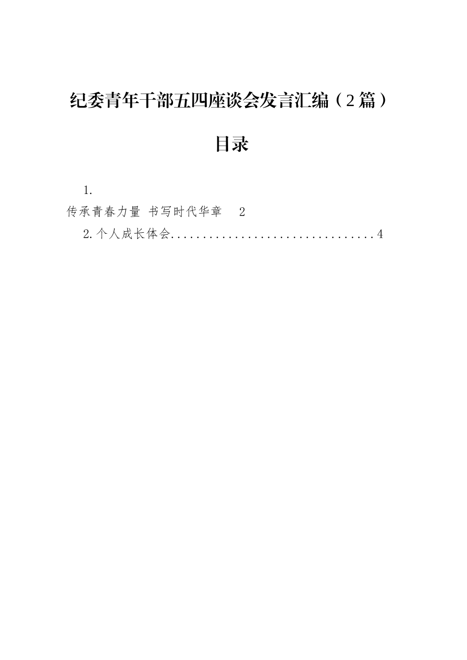 纪委青年干部五四座谈会发言汇编(2篇)目录1.传承青春力量书写时代华章22.个人成长体会................................4传承青春力量书写时代华章在市纪委监委工作的这段时光里,我倍感光荣,且经历难忘,更是心怀感恩。青春是短暂的,我觉得作为一名青年人,作为纪检监察系统的一滴年轻血液,我们应该体现出更多不一样的地方。不一样在于——我们有更多的机会、挑战,成为更加优秀的自己。作为青年人,要时刻做好抓住机会的准备,做好当下的每一份工作,把一点一滴、重复繁琐都作为成功背后的积累。要有无畏失败和挫折的勇气,不好高骛远、骄傲自满,也不消极怠慢、缺乏信心。我也经历过工作中的患得患失、心浮气躁,尤其是身处市纪委监委,身边有太多优秀的前辈和同仁,总会觉得事情没有做好,但当我学会接受不足、认识不足、改正不足时,才真正认识到,从困难中走出来,也是一种宝贵的体验。不一样在于——我们有更多的激情、活力,为工作注入新鲜血液。既然我们是青年人,就应该有青年人的样子,珍惜自己的青春年华,始终以良好的精神状态对待工作、对待人生,对纪检监察工作充满信心,把自己的本职工作当做一份事业,用心经营。作为青年人,我们还要始终保持工作热情和干事激情,充分发挥青年人精力充沛、思想活跃、富于激情的特点,以青年的活力带动整个纪检监察系统的活力。不一样在于——我们有更好的时代、机遇,实现自我的人生价值。作为青年,必须树立远大的人生志向,明确自己的目标,围绕人生目标进行规划。要坚守内心的信念,以严谨的态度对待每一份工作,以坚定的意志抵制每一个诱惑,以无畏的勇气迎接每一个挑战。作为一名青年纪检监察人,有责任将这种精神继续传递下去。个人成长体会今年是我加入X市纪委监委这个优秀团体的第五年,在领导、同事们的指导与帮助下,我脚踏实地,不断学习,努力实践,终于成长为一名合格的纪检监察干部。如果有人问我:怎样才算是成为了合格的纪检监察干部?我想就是要以实际行动诠释对党的忠诚。危身奉上,险不辞难曰忠。青年党员应始终牢记对党的忠诚,必须表里如一、知行合一,面对愈进愈难、愈进愈险的新考验,保持不怕吃苦、迎难而上、勇挑重担、克险前行的奋进姿态,把忠诚体现到实际行动上,在新时代新征程中留下许党报国的奋斗足迹。历史深刻昭示,对党忠诚既是政治标准更是实践要求,既看政治态度更看实际行动,必须做到任何时候任何情况下都不改其心、不移其志、不毁其节。踏上新征程,我们前进的道路上仍面临着许多难关和挑战,把埋头苦干、真抓实干作为对忠诚最有力的实践,把完成急难险重任务作为对忠诚最切实的检验,把闯关夺隘、开创新局作为对忠诚最实际的见证,是新时代共产党人应有的政治品格。如今反腐败斗争面临的风险考验更加复杂,年轻干部更加要自觉加强斗争历练,发扬越是艰苦越向前的斗争精神,砥砺“不畏浮云遮望眼”的自信、“乱云飞渡仍从容”的定力、坚定“主动迎战、敢于出击”的斗争意识,不屈不挠,一往无前,在复杂险峻的斗争中经历风雨,以实际行动诠释对党的忠诚。