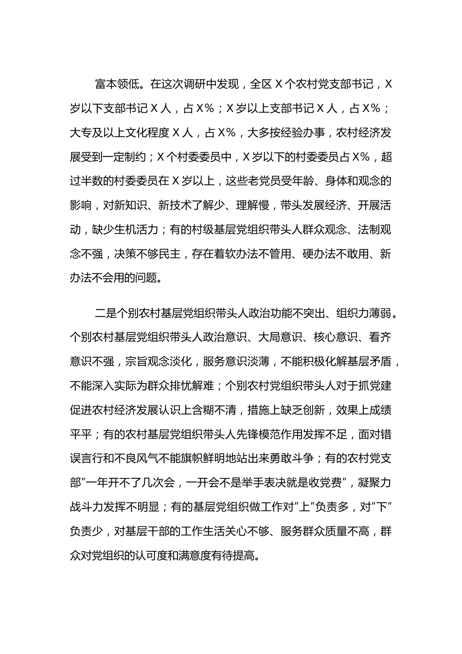 基层”一肩挑”带头人队伍建设调研报告加强农村基层党组织建设,关键在于建设一支政治上靠得住、工作上有能力、群众中威信高的基层党组织带头人队伍。近期,X区通过召开座谈会、个别访谈、发放调查问卷等形式对近年来农村基层党组织带头人队伍建设进行专题调研,共召开座谈会、访谈会X场,走访干部群众X人次,发放调查问卷X余份,收取意见和建议X条。全面掌握了农村基层党组织带头人队伍建设的基本问题,深入分析了存在的问题,总结提炼了具有X特色的对策及建议。一、基本情况X区地形复杂,北部为丘陵沟壑,中部为冲积平原,南部为黄河滩地,辖X个行政村,X个村民小组。2021年换届选举后,X个村共选举产生支部委员X人,支部书记X人,其中”一肩挑”X人,占X%;X岁以下支部书记X人,占X%;X岁以上支部书记X人,占X%;大专以上文化程度支部书记X人,占X%。二、存在问题X区通过实施”两会两审”“公推直选”等措施,村级基层党组织带头人队伍的文化、年龄、能力结构得到了一定程度的改善。但与新时期基层组织建设的新形势、新任务相比,我区村级基层党组织带头人队伍还存在一些不相适应的问题。一是农村基层党组织带头人队伍结构不合理。全区村级基层党组织中普遍存在”一高三低”现象:即年龄高,文化低、技能低、致富本领低。在这次调研中发现,全区X个农村党支部书记,X岁以下支部书记X人,占X%;X岁以上支部书记X人,占X%;大专及以上文化程度X人,占X%,大多按经验办事,农村经济发展受到一定制约;X个村委委员中,X岁以下的村委委员占X%,超过半数的村委委员在X岁以上,这些老党员受年龄、身体和观念的影响,对新知识、新技术了解少、理解慢,带头发展经济、开展活动,缺少生机活力;有的村级基层党组织带头人群众观念、法制观念不强,决策不够民主,存在着软办法不管用、硬办法不敢用、新办法不会用的问题。二是个别农村基层党组织带头人政治功能不突出、组织力薄弱。个别农村基层党组织带头人政治意识、大局意识、核心意识、看齐意识不强,宗旨观念淡化,服务意识淡薄,不能积极化解基层矛盾,不能深入实际为群众排忧解难;个别农村党组织带头人对于抓党建促进农村经济发展认识上含糊不清,措施上缺乏创新,效果上成绩平平;有的农村基层党组织带头人先锋模范作用发挥不足,面对错误言行和不良风气不能旗帜鲜明地站出来勇敢斗争;有的农村党支部”一年开不了几次会,一开会不是举手表决就是收党费”,凝聚力战斗力发挥不明显;有的基层党组织做工作对”上”负责多,对”下”负责少,对基层干部的工作生活关心不够、服务群众质量不高,群众对党组织的认可度和满意度有待提高。三是个别农村基层党支部书记驾驭全局能力不强。有的村党支部书记有”等、靠、要”思想,创业创新意识不足,开展工作习惯于等文件、等指示,依赖上级计划安排;个别村党支部书记,特别是一些新上任的支部书记,部分村党支部书记工作思路不清,缺乏长远规划,不能看清自身发展优势,缺乏驾驭全局、处理复杂问题的能力,面对一些突发性事件、信访纠纷、土地征用和一些群众普遍反映关注热点、难点问题时,显得束手无策,常常在政策”执行者”和村民”当家人”的角色之间摇摆,找不到解决协调各方面利益冲突的办法,带头人核心作用发挥不充分。四是个别农村基层党组织书记致富带富能力弱。个别村党支部书记缺乏”双带”能力,面对国家的诸多优惠政策,不能根据本村实际,利用集体优势资源,调整经济结构,带领群众发展经济,错失发展先机,造成了在守业受穷和受穷守业中循环;同时大部分村委委员没有自己的致富项目,个别虽然有带领群众致富的愿望,但思路窄、办法少,找不准发展经济的路子,效果不明显,”空壳村”“空巢村”在一定程度上存在。如,离城市区较远,交通不便,村级集体经济发展相对滞后,除村级财政专项补助资金外集体几乎没有经营性收入西北岭区的韩庄村、六门村、下柳村等。三、对策及建议一是拓宽选拔,选好”领头羊”。注重放宽选人视野,进一步拓宽农村党组织书记来源,对现有村干部数量较多、后备干部来源充足的村,加大从本村选拔农村党组织书记力度;对本村暂无合适人选的村...