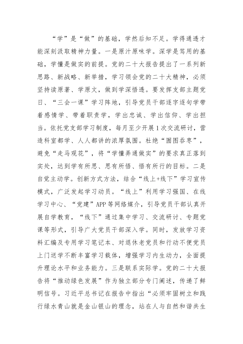 研讨发言:以党的XX大精神为引领奋力谱写绿色发展新篇同志们:党的二十大报告高瞻远瞩、内涵丰富、思想深邃是党员学习教育的“精神食粮”,是干部成长奋进的“营养源泉”,是实现人民美好生活的“任务书”“施工图”。习近平总书记在党的二十大报告中提出了“高质量发展是全面建设社会主义现代化国家的首要任务”“坚持创新在我国现代化建设全局的核心地位”“加快绿色发展方式转型”等一系列科学论述,为科技节能事业提供了根本遵循、指明了前进方向。我们要以党的二十大精神为指引,把学思践悟党的二十大精神作为当前和今后一个时期的首要政治任务,内化于心、外化于行,贯彻到科技节能工作全方位、全过程。一、在“学”上下功夫,深入学习、深刻领会“学”是“做”的基础,学然后知不足。学得通透才能深刻汲取精神力量。一是原汁原味学。深学是笃用的基础,学懂是做实的前提。党的二十大报告提出了一系列新思路、新战略、新举措,学习领会党的二十大精神,必须坚持读原著、学原文,做到学深悟透。要发挥支部主题党日、“三会一课”学习阵地,引导党员干部逐字逐句学带着感情学、带着职责学,学出忠诚、学出信仰、学出担当。依托党支部学习制度,每月至少开展1次交流研讨,营造科室都学、人人都讲的浓厚氛围。杜绝“囫图吞枣”,避免“走马观花”,将“学懂弄通做实”的要求真正落到实处,达到学有所思、思有所悟、悟有所行的目标。二是自觉主动学。创新方式方法,结合“线上+线下”学习宣传模式,广泛发起学习动员。“线上”利用学习强国、在线学习中心、“党建”APP等网络媒介,引导党员干部认真开展自学教育,“线下”通过集中学习、交流研讨、专题党课等形式,引导广大党员干部深入学。同时,发放学习资料汇编及专用学习笔记本、对退休老党员和行动不便党员上门送学不断丰富学习载体,增强学习内生动力,全面提升理论水平和业务能力。三是联系实际学。党的二十大报告将“推动绿色发展”作为独立部分专门阐述,传递了鲜明信号。习近平总书记在报告中指出“必须牢固树立和践行绿水青山就是金山银山的理念,站在人与自然和谐共生的高度谋划发展”。作为一名科技节能工作者,倍感振奋、倍受鼓舞。当务之急就是要立足自身职责,将学习与推动单位发展、事业发展、行业发展相结合与解决绿色建筑发展存在的问题相结合,深刻领会蕴含其中的核心要义和使命责任,明确目标任务,找准工作路径,解决实际问题。二、在“思”上真发力,倍加珍惜、倍增力量“思”是“学”的延伸,思然后知奋进。古人讲,“学而不思则罔,思而不学则殆”。一“思”立身之本。习近平总书记在党的二十大报告中指出,要自觉做共产主义远大理想和中国特色社会主义共同理想的坚定信仰者和忠实实践者。守纪律、讲规矩是党员干部的立身之本,要牢记自己的第一身份是共产党员,坚守政治纪律,坚定理想信念对党忠诚,依法履职。以“坚定笃行”的姿态,深刻领悟“两个确立”、牢固树立“四个意识”、坚定“四个自信”、践行“两个维护”。做到胸中有大局、眼中有目标、脑中有思路、手中有抓手。二“思”为政之道。党的二十大报告指出“江山就是人民,人民就是江山,中国共产党领导人民打江山守江山,守的是人民的心”。为政之道,以顺民心为本以厚民生为本。科技节能部门肩负建设科技、建筑节能、预拌混凝土、墙材革新等方面的职责使命,要聚焦群众“急难愁盼”“痛点难点”问题,用心、用情用力办好群众关心的民生实事、身边小事。加强科技节能行业监管服务,进一步保障绿色建筑品质,建立绿色住宅使用者监督机制,增强人民群众对绿色建筑的获得感。三“思”成事之要。党的二十大报告总结了五年来党和国家取得的重大成就,阐述了十年来经历地对党和人民事业具有重大现实意义和深远历史意义的三件大事。生逢伟大时代、身处伟大国家,必须更加珍惜机遇、珍惜平台、珍惜岗位,紧密围绕中央决策部署,着力提升城乡建设绿色低碳发展质量,大力发展绿色建筑,推行绿色设计,推广绿色建材和绿色建造方式。优化建筑用能结构,提高可再生能源使用比例,加快既有房屋节能改造,以更先进的理念、更扎实的作风、更有力的措施做好本...