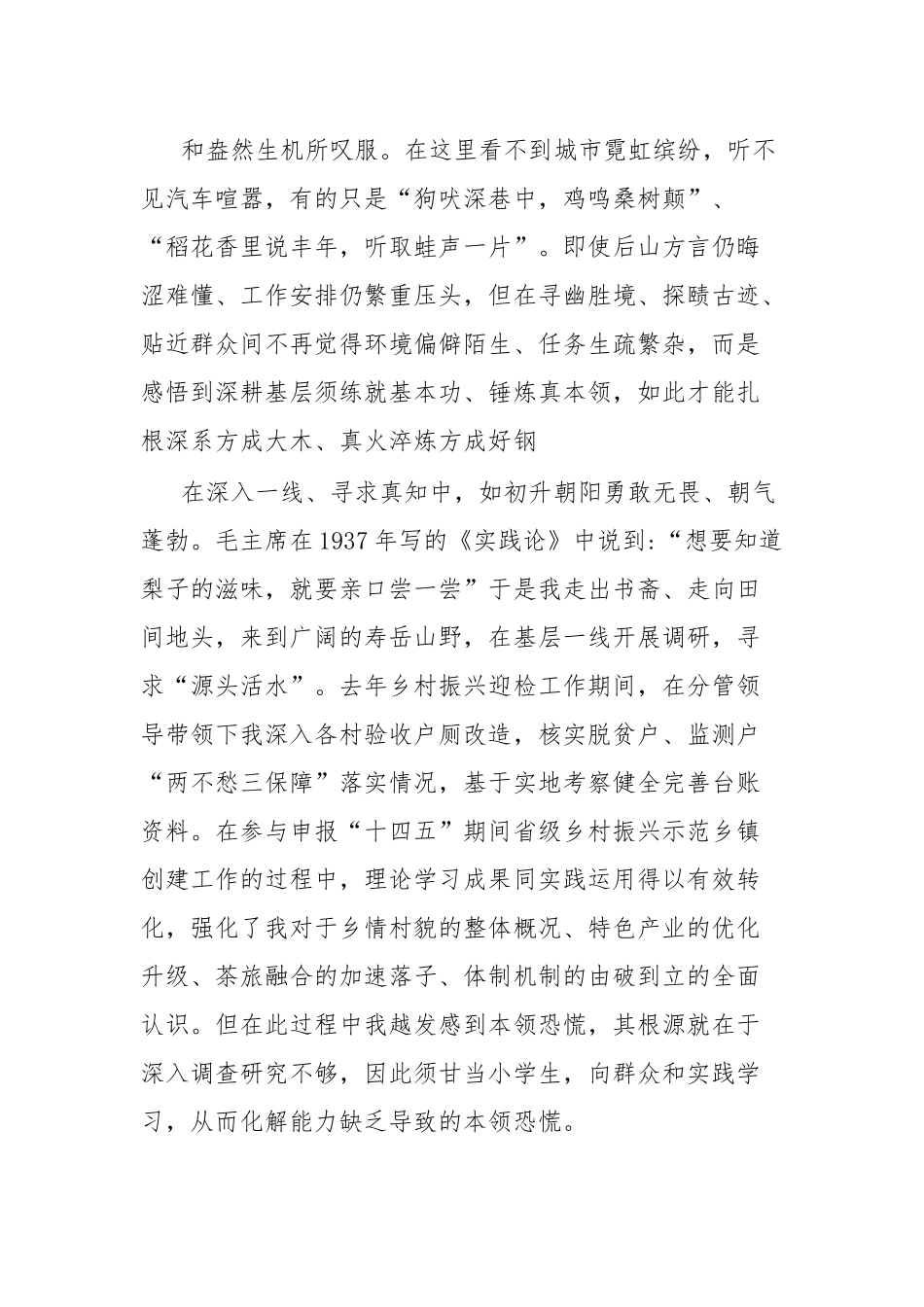 在培训班上的发言:做用“心”而“为”的基层干部在樱花如云似雪的时节,我怀揣“在最美大学读书,为最强中国奋斗”的铮铮誓言,报考了XXXX选调生,并被分配到青山葱茏、碧水连天的XXXXXXXX。从去年8月从XXXX省委党校“毕业”到如今,我深耕基层已将近一年。在山水的浸润下,在实践的淬炼中,我完成了从在校学生到基层干部的蜕变,基层百味,回味绵长。短短一年间,我曾经历因临近乡镇突发新冠病例而紧急开展疫情防控阻击战的“尖峰时刻”,曾在乡村振兴迎检时与乡村两级干部通宵达旦地整理完善台账资料,也曾面对一份汇报材料手足无措,处处查阅资料和咨询同事才勉强交出仅达及格线的文章。这些看似稀疏平常的日常却是构成我基层生活的生动切面,夹揉着喜悦、挫败、心酸、茫然等情绪,正是寿岳乡、是红旗村,以“客到南岳不思归”的广阔胸怀包容了我,也以母亲的暧心关怀引导在工作上跌跌撞撞仍在蹒跚学步的我。踏遍山河万里,仍觉此间风景独秀。在深耕基层、脚履黄土中,如初春萌芽向下扎根、顽强生长。在红旗村,我曾见过曾国藩古道的险峻蜿蜒并为挖掘到人文古迹所蕴藏的深厚历史底蕴所欣喜,还因看到老龙潭的清澈澄明而感慨于自然的馈赠和鬼斧神工,曾深深迷恋住下村入户摸排问题厕所至傍晚时分所偶然看到的绚烂晚霞,也因在老茶园调研乡村振兴加工车间时为茶园的满目青翠和盎然生机所叹服。在这里看不到城市霓虹缤纷,听不见汽车喧嚣,有的只是“狗吠深巷中,鸡鸣桑树颠”、“稻花香里说丰年,听取蛙声一片”。即使后山方言仍晦涩难懂、工作安排仍繁重压头,但在寻幽胜境、探赜古迹、贴近群众间不再觉得环境偏僻陌生、任务生疏繁杂,而是感悟到深耕基层须练就基本功、锤炼真本领,如此才能扎根深系方成大木、真火淬炼方成好钢在深入一线、寻求真知中,如初升朝阳勇敢无畏、朝气蓬勃。毛主席在1937年写的《实践论》中说到:“想要知道梨子的滋味,就要亲口尝一尝”于是我走出书斋、走向田间地头,来到广阔的寿岳山野,在基层一线开展调研,寻求“源头活水”。去年乡村振兴迎检工作期间,在分管领导带领下我深入各村验收户厕改造,核实脱贫户、监测户“两不愁三保障”落实情况,基于实地考察健全完善台账资料。在参与申报“十四五”期间省级乡村振兴示范乡镇创建工作的过程中,理论学习成果同实践运用得以有效转化,强化了我对于乡情村貌的整体概况、特色产业的优化升级、茶旅融合的加速落子、体制机制的由破到立的全面认识。但在此过程中我越发感到本领恐慌,其根源就在于深入调查研究不够,因此须甘当小学生,向群众和实践学习,从而化解能力缺乏导致的本领恐慌。在见贤思齐、躬身自省中,如初生牛犊强化学习、砥砺前行。在红旗村,我认识了深受村民信赖连续当选好几届的村书记、在扶贫和党建事业上尽职尽责被评为区优秀共产党员的村干部、履职尽责兢兢业业的村副主任、放弃城市工作回来建设家乡的村干部、扎根红旗村多年带领红旗村由脱贫攻坚向乡村振兴有效衔接的驻村第一书记等等,他们或是对党的路线、方针和各种惠农政策烂熟于心,或是基层工作经验丰富,善于处理疑难杂事和化解矛盾纠纷,或是掌握带领村民致富增收的专业技能和过硬本领。从他们身上,我感受到基层干部坚守初心、凝聚民心、全心全意聚焦农业高质高效、乡村宜居宜业、农民富裕富足目标所付出的努力和做出的贡献。在基层这个最生动的课堂上,实践提供了最丰富的教材,群众则是最智慧的老师,基层干部成为我最信赖的引路人和同行人,他们的真挚为民情怀和丰富实践经验是值得我深挖的精神富矿。此刻,习近平总书记在2023年新年贺词中对广大青年的谆谆教诲再次在我耳边回响:”明天的中国,希望寄予青年。青年兴则国家兴,中国发展要靠广大青年挺膺担当”。基层一线是青年磨砺淬炼的起跑线、基层前沿是青年干事创业的大舞台,而我愿深耕寿岳乡这一方沃土,以蓬勃青春赋青山、以奋进姿态书华章、以实干之风促振兴,不辜负这片葱茏绿意和这个伟大时代。