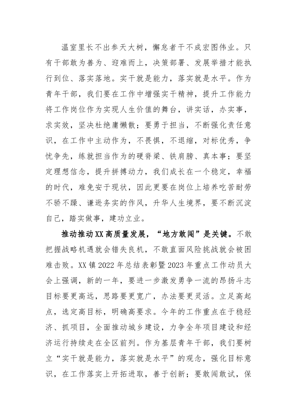 “敢为、敢闯、敢干、敢首创"一“四敢"精神心得体会研讨发言材料(5篇)一时千载,千载一时,新时代的中国巨舱正在驶出历史的峡谷,进入“海阔凭鱼跃”的宽广水域。然而在世界百年未有之大变局和新冠肺炎疫情全球大流行交织的影响下,发展环境更趋复杂严峻,风险挑战不断增多。12月6日,习近平总书记在中央政治局会议上向全社会发出了号召,要坚持真抓实干,激发全社会干事创业活力,让干部敢为、地方敢闯、企业敢干、群众敢首创。“四敢”强音如“号角”,青年干部要拒绝“躺平”,力争在基层岗位建功,争做XX发展尖兵。推动高质量发展,“干部敢为”是前提。温室里长不出参天大树,懈怠者干不成宏图伟业。只有干部敢为善为、迎难而上,决策部署、发展举措才能执行到位、落实落地。实干就是能力,落实就是水平。作为青年干部,我们要在工作中增强实干精神,提升工作能力将工作岗位作为实现人生价值的舞台,讲实话,办实事,求实效,坚决杜绝庸懒散;要勇于担当,不断强化责任意识,在工作中主动作为,不畏惧,不退缩,对标优秀,争忧争先,练就担当作为的硬脊梁、铁肩膀、真本事;要坚定理想信念,提升拼搏动力,我们成长在一个稳定,幸福的时代,难免安于现状,因此更要在岗位上培养吃苦耐劳不骄不躁、谦逊务实的作风,升华人生境界,要不断沉淀自己,踏实做事,建功立业。推动推动XX高质量发展,“地方敢闯”是关键。不敢把握战略机遇就会错失良机,不敢直面风险挑战就会被困难击败。XX镇2022年总结表彰暨2023年重点工作动员大会上强调,新的一年,要进一步激发勇争一流的昂扬斗志目标要更高远,思路要更宽广,办法要更灵活。立足高起点,选定高目标,明确高要求。今年的工作重点在于稳经济、抓项目,全面推动城乡建设,力争全年项目建设和经济运行持续走在全区前列。作为基层青年干部,我们要树立“实干就是能力,落实就是水平”的观念,强化目标意识,在工作落实上开拓进取,善于创新;要敢闯敢试,保持创新意识和创新激情,抓住新机遇,创造新办法,解决新问题,开拓新思路,开创新业绩,力争在探索探路上“破冰”突围,在比学赶超上争先进位,通过个人力量的汇聚,推动“地方敢闯”,继而促进全镇经济社会的大发展、快发展。推动高质量发展,“企业敢干”与“群众敢首创”是动力。人民群众是历史的创造者,企业是市场经济的主体,有效应对经济下行压力需要发挥企业和人民群众的能动性要让各类企业敢干、敢闯、敢投,在危机中育新机,于变局中开新局,要激发蕴藏在人民群众中的创造伟力。想要“企业敢干”“群众敢首创”,就要持续营造优质营商环境,加速传统产业转型和战略新兴产业培育,引育一批产出可观、产业层次较高的专精特新“小巨人”、瞪羚和独角兽企业进入XX,•要帮助企业解决难题、稳定预期、提振信心,用好省市区各项惠企政策,让企业真真切切享受到政策红利,坚定企业投资XX、深耕XX的信心:要充分尊重群众首创精神,坚持为了人民、依靠人民、尊重人民主体地位,注重发挥基层人民群众的首创精神,走好新时代的群众路线。万事只争春来早,一年奋进当此时。“四敢”最强音对广大基层青年干部而言是干事创业的一剂“强心针”。在全面贯彻落实党的二十大精神开局之年,青年干部当坚定理想信念,积极担当,勐力拼搏,为奋力推进中国式现代化海门新实践的XX篇章贡献个人力量!“敢为、敢闯、敢干、敢首创"一“四敢"精神心得体会研讨材料去年12月6日,习近平总书记在中央政治局会议上指出,要坚持真抓实干,激发全社会干事创业活力,让干部敢为、地方敢闯、企业敢干、群众敢首创。从党员干部到各级地方政府,从各类市场主体到广大群众,“四敢”涵盖广泛,方向明确,为今年全面贯彻落实好党的二十大精神和部署提供了方法论指导,发出了奋斗号召。XX的青年干部作为古镇最具活力的中坚力量,应自觉扛起践行“四敢”精神的重责,把个人奋斗融入全镇发展大局,让蓬勃青春与家国情怀同频共振,将个人发展与XX前途命运紧密结合,擦亮青年担当与责任,更好实现人生价值。思想若松一寸,行动就散一尺。2022年是XX爬坡过坎、克难奋进的一年,招商引资、项目建设、经济运行一扫颓...