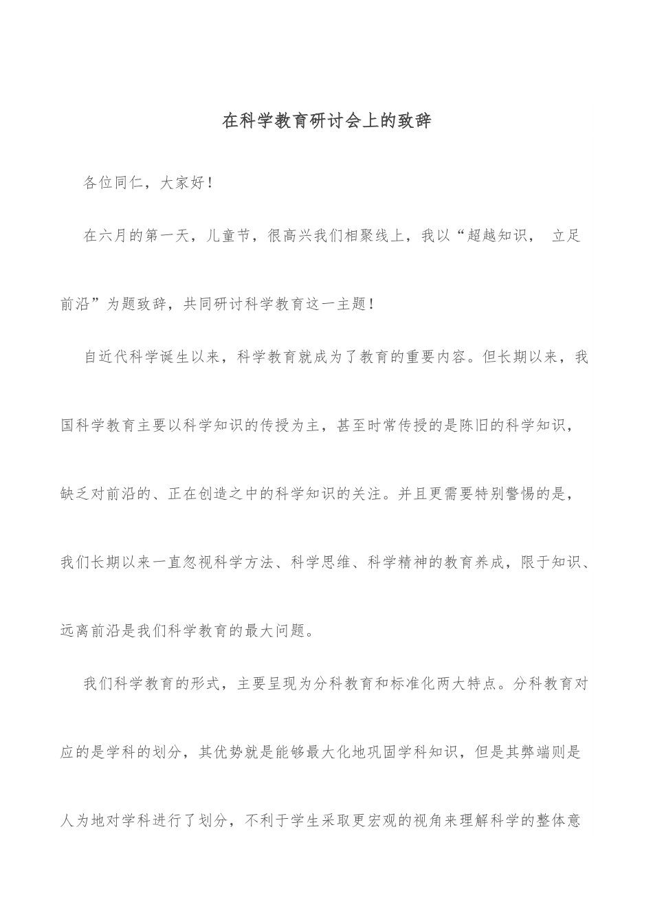 在科学教育研讨会上的致辞各位同仁,大家好!在六月的第一天,儿童节,很高兴我们相聚线上,我以“超越知识,立足前沿”为题致辞,共同研讨科学教育这一主题!自近代科学诞生以来,科学教育就成为了教育的重要内容。但长期以来,我国科学教育主要以科学知识的传授为主,甚至时常传授的是陈旧的科学知识,缺乏对前沿的、正在创造之中的科学知识的关注。并且更需要特别警惕的是,我们长期以来一直忽视科学方法、科学思维、科学精神的教育养成,限于知识、远离前沿是我们科学教育的最大问题。我们科学教育的形式,主要呈现为分科教育和标准化两大特点。分科教育对应的是学科的划分,其优势就是能够最大化地巩固学科知识,但是其弊端则是人为地对学科进行了划分,不利于学生采取更宏观的视角来理解科学的整体意义,也局限了学生用多学科知识解决具体问题的可能性。标准化则是以我们的“课标”和“知识点”为代表。知识点就是我们教学中的标准,我们所有的教学、考核内容都围绕知识点展开,然后根据知识点设定标准答案。这种模式有助于学生对知识的掌握,但却割裂了从“知识”到“真实世界”的有机联系,科学实践被彻底忽视。而恰恰忘记了科学一直在推陈出新,常常颠覆性地变化,知识的前沿不断向前,标准答案只是基本合格答案,如果不能包含非标准答案,永远不会有卓越全面的答案。从历史来看,这种科学教育,培养了大批具有一定科学知识技能的产业工人,推动了我国迅速地从一个传统的农业国转向了一个工业大国,也从侧面培养了群众的科学思维和科学精神,取得了积极的成效。但不可否认的是,随着科学技术的快速发展迭代,传统的以知识为主要内容的科学教育,已经无法追赶技术更新的脚步。课堂上传授的知识或许在毕业的那一刻就已经被更新替代。与此同时,分科教育和标准化,对当前愈发重要的学科交叉和科学应用,带来了严重的负面影响,我国的科学教育亟待重塑。因此,当前科学教育的核心,就是要培养学生以科学精神为灵魂、以科学思维为核心、以科学知识为基础的,通过科学方法自主地探究世界、创造知识、应用实践的能力。科学精神的树立,是科学教育的灵魂。对科学精神,有许多不同的解释。我认为,在中国当前的文化语境下,科学精神应该包括三个方面,即以独立判断为代表的质疑精神,以谦逊包容为代表的开放精神,以想象创造为代表的探索精神。在培养训练科学精神方面要找到合适的切入点,如从地心说、日心说、黑洞说等故事或者观察切入,从巫神、瘟疫、显微镜、病毒等故事或者实验切入,就是一些可以采取的方式。科学思维的养成,是科学教育的核心。科学思维包括多个方面,我想主要有逻辑思维和形象思维,以及在此基础上的批判性思维和创造性思维。前两者是基础,后两者是在此之上的提升。而且这四者缺一不可。仅有逻辑没有形象,就会缺乏创造,仅有形象没有逻辑,则是空想。这都不是科学。当然科学思维还应包括最前沿的量子逻辑等。科学方法的掌握,是科学教育的关键。科学教育不能仅仅是理论上的教育,更是科学实践的教育,特别要鼓励亲自动手和观察,用身边的事物作为科学的对象和材料。科学精神、科学思维、科学知识,只有应用于科学实践,才能体现出价值。科学实践,包括且不限于科学实验、发明创造、创新创业等等形式。只有让我们的学生能够积极地投身科学实践,才算是完整的科学教育,如此才能进入创造型社会、研究型社会。而这也是我们当前的科学教育最为缺乏的部分。作为一所以教师教育为特色、文理基础学科见长的“双一流”建设高校,*有着扎实的理工科与教育研究基础。近年来,学校积极探索卓越人才培养模式的改革,以卓越学术、卓越育人相互支撑,旨在培养全面而自由的人。科学教育不仅涉及自然科学,也应包括工程科学,也涉及社会科学、人文科学,是实现我们人才培养目标的重要内容和重要途径。因此,*的科学教育所面向的,不仅仅是我们理工科的学生,而是涵盖全校所有人文、艺术、理工、教育等的全部学生,更包括作为我校特色的师范生群体。我们希望通过他们,影响他们的学生,进而提升我国青少年一代的科学素养和水平。我们希望通过思维导向的通识教育,让我们的学...