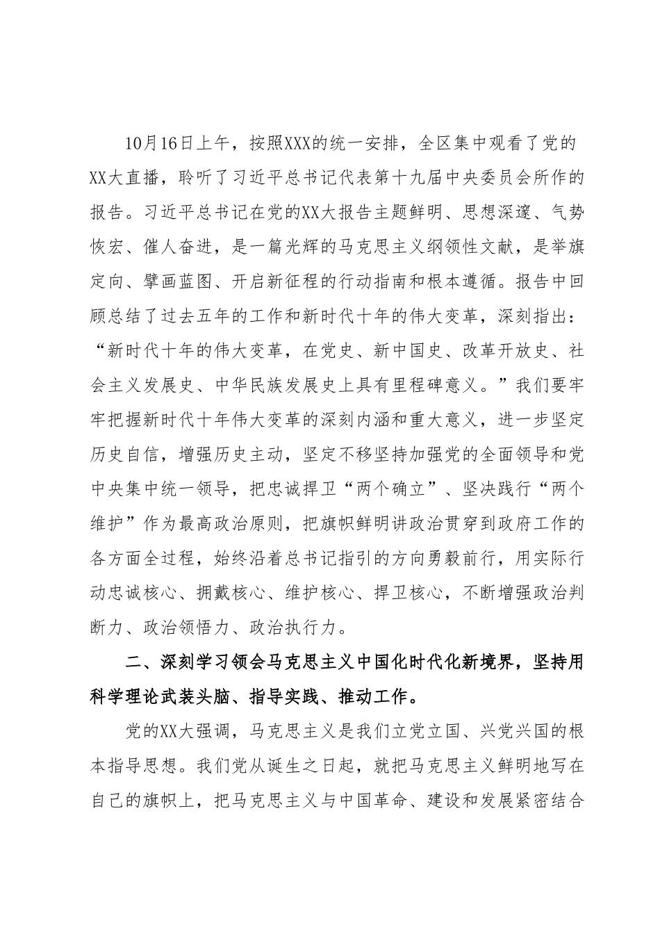 在理论学习中心组学习会议上的研讨发言提纲按照会议安排,下面就近一阶段学习贯彻党的XX大会议精神和大家进行交流研讨。一、以高度的政治责任感和使命感学习、领悟党的XX大会议精神党的XX大,是在进入全面建设社会主义现代化国家新征程的关键时刻召开的一次十分重要的大会,会议科学谋划未来5年乃至更长时期党和国家事业发展的目标任务和大政方针,事关党和国家事业继往开来,事关中国特色社会主义前途命运,事关中华民族伟大复兴。对团结和激励全国各族人民为夺取中国特色社会主义新胜利而奋斗具有十分重大的意义。10月16日上午,按照XXX的统一安排,全区集中观看了党的XX大直播,聆听了习近平总书记代表第十九届中央委员会所作的报告。习近平总书记在党的XX大报告主题鲜明、思想深邃、气势恢宏、催人奋进,是一篇光辉的马克思主义纲领性文献,是举旗定向、擘画蓝图、开启新征程的行动指南和根本遵循。报告中回顾总结了过去五年的工作和新时代十年的伟大变革,深刻指出:“新时代十年的伟大变革,在党史、新中国史、改革开放史、社会主义发展史、中华民族发展史上具有里程碑意义。”我们要牢牢把握新时代十年伟大变革的深刻内涵和重大意义,进一步坚定历史自信,增强历史主动,坚定不移坚持加强党的全面领导和党中央集中统一领导,把忠诚捍卫“两个确立”、坚决践行“两个维护”作为最高政治原则,把旗帜鲜明讲政治贯穿到政府工作的各方面全过程,始终沿着总书记指引的方向勇毅前行,用实际行动忠诚核心、拥戴核心、维护核心、捍卫核心,不断增强政治判断力、政治领悟力、政治执行力。二、深刻学习领会马克思主义中国化时代化新境界,坚持用科学理论武装头脑、指导实践、推动工作。党的XX大强调,马克思主义是我们立党立国、兴党兴国的根本指导思想。我们党从诞生之日起,就把马克思主义鲜明地写在自己的旗帜上,把马克思主义与中国革命、建设和发展紧密结合起来。习近平新时代中国特色社会主义思想作为当代中国马克思主义、21世纪马克思主义,开辟了马克思主义中国化时代化新境界,为新时代更好坚持和发展中国特色社会主义提供了思想武器和根本遵循。区政府将坚持深入学习贯彻习近平新时代中国特色社会主义思想,完整、准确、全面把握好“十个明确”、“十四个坚持”、“十三个方面成就”的丰富内涵和实践要求,把握好蕴含其中的立场观点方法,努力把学习成效转化为推动振兴发展的思路和举措,特别是要深入学习贯彻并自觉主动地从习近平总书记关于东北、辽宁振兴的重要讲话、指示批示精神和总书记在辽宁、沈阳考察时的重要讲话中找方向、找遵循、找方法、找答案,切实做到学思用贯通、知信行合一。三、全面贯彻党的XX大的实践要求,以更大的担当作为推动新时代振兴发展取得新突破党的XX大明确提出,要推动东北全面振兴取得新突破,这是习近平总书记和党中央立足于新时代、新征程提出的重要要求。总书记来到辽宁、沈阳考察时还提出,希望辽宁在新时代东北振兴上展现更大担当和作为。我们要紧密结合实际,把党的XX大作出的重大决策部署付诸行动、见之于成效,在新时代东北振兴中展现更大担当作为,奋力开创振兴发展新局面。(一)坚持综合施策,保持经济运行在合理区间,为高质量发展奠定基础。党的XX大强调,高质量发展是全面建设社会主义现代化国家的首要任务。XX区政府将继续巩固工业经济主导地位关注区内的重点企业,加大调研力度,对企业运行状况进行定期调度,跟踪各项政府经济指标完成情况,持续做好“三篇大文章”,助推创建“XXX”取得新突破。(二)坚持补齐短板,提高科技创新能力,力争在创新发展上取得突破。党的XX大强调,要加快实施创新驱动发展战略,增强自主创新能力。按照XXX在XX调研时的指示精神,下一步将重点推进“XXX”项目建设,推动园区内各产业、各企业之间相互协调优化配给,实现园区绿色、低碳集群化发展。同时,强化产学研融合发展,强化科技项目、成果推广、人才培养等方面的深入合作,持续提升我区自主创新能力。(三)坚持以人民为中心,聚焦群众意愿,全力以赴保障民生。党的XX大强调,必须坚持在发展中保障和改善民生,鼓励共同奋斗创造美好生活...