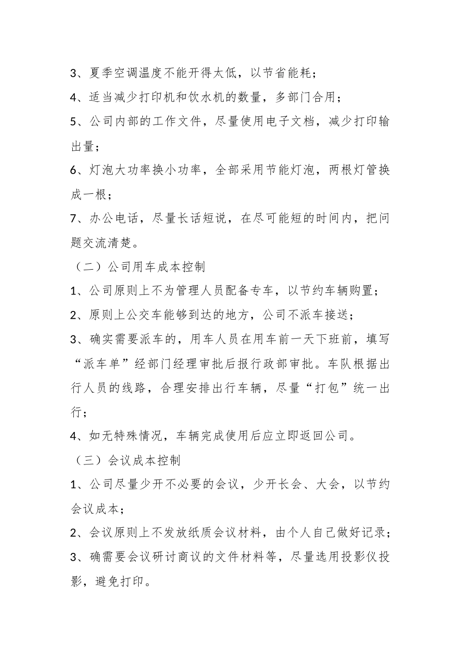公司成本控制计划和措施汇编(5篇)第一篇:公司成本控制计划和措施公司成本控制计划和措施一、控制重点各项工序应当从严控制行政成本,着力控制以下事项:(一)日常办公成本控制;(二)公司用车成本控制;(三)会议成本控制;(四)设备采购成本控制(五)接待成本控制二、控制方式(一)日常办公成本控制1、公司的打印、复印由打印室专门负责。好纸双面打印。公司内部交流用的校对稿等文件,尽量用废纸打印。打印稿原则上只黑白打印,不得彩色打印。在行政部领取打印纸时,需经行政部经理批准;2、办公楼用灯由保卫处指定专人负责,上下班按时开关灯。电脑、饮用水、打印机在晚上下班时必须关闭,减少待机能耗;3、夏季空调温度不能开得太低,以节省能耗;4、适当减少打印机和饮水机的数量,多部门合用;5、公司内部的工作文件,尽量使用电子文档,减少打印输出量;6、灯泡大功率换小功率,全部采用节能灯泡,两根灯管换成一根;7、办公电话,尽量长话短说,在尽可能短的时间内,把问题交流清楚。(二)公司用车成本控制1、公司原则上不为管理人员配备专车,以节约车辆购置;2、原则上公交车能够到达的地方,公司不派车接送;3、确实需要派车的,用车人员在用车前一天下班前,填写“派车单”经部门经理审批后报行政部审批。车队根据出行人员的线路,合理安排出行车辆,尽量“打包”统一出行;4、如无特殊情况,车辆完成使用后应立即返回公司。(三)会议成本控制1、公司尽量少开不必要的会议,少开长会、大会,以节约会议成本;2、会议原则上不发放纸质会议材料,由个人自己做好记录;3、确需要会议研讨商议的文件材料等,尽量选用投影仪投影,避免打印。(四)设备采购成本控制1、不采购多余的设备;2不采购多余功能的设备,功能越多,价格越贵;比如传真机主要是发传真,计算机主要是处理文档,上网搜集资料不需要过大的内存;3、推行以旧换新制度,用旧的设备折扣购买新的设备;4、固定一家百货文具用品店进货,建立长期供应关系,以保证较低的优惠折扣,其他大件设备的采购采取招标的形式,选用质优价廉者;5、办公设备和家具,可以充分利用原有的。(五)接待成本控制1、原则上的接待工作不宴请;2、一般的工作接待在花园酒店西餐厅工作餐接待;3、需要正式宴请的接待需由董事长亲自批准;4、工作接待尽量不迎来送往。第二篇:采购成本控制计划采购成本控制计划一、供方渠道从不同方面收集各种物料的供货渠道、地域差别等,充分利用网络资源,开发新的供应商,做好采购询价管理,从而保障各个报价的可比性;选择适合我公司发展的供应商一个合格的供应商能为我司出谋划策,共同发展,判断一个供应商主要从产品价格、质量、售后服务、技术力量等多方面因素。二、询价代理类供应商:通过对产品各个代理之间的询价,掌握该物料的目前市场形势,要求供应商进行降价或批量折扣等处理。生产类供应商:采购前熟悉物料的价格组成,了解供应商生产的产品原材料价格,为准确有效的进行议价打下基础。三、谈判技巧提供谈判技巧降低采购成本,确保每年降价幅度保持在5%~10%左右。针对每月货款较多的供应商,告知明年的公司计划及后期的订单量进行有效商谈。四、批量采购确保物料采购计划的准确性,做到适时、适量;采购物料时确保做到适价、适质、适地。五、特殊物料针对部分非常规、非标、难采购的物料进行分类管理,能使用新物料替代的协助研发部分进行物料替代、验证等。第三篇:餐饮行业成本控制的有效措施餐饮行业成本控制的有效措施餐饮成本控制是餐饮经营管理的重要内容,由于餐饮的成本结构制约着餐饮产品的价格,而餐饮的价格又影响着餐厅的经营和上座率,因此,餐饮成本控制是餐饮经营的关键。在餐饮经营中,保持或降低餐饮成本中的原材料成本和经营费用,尽量提高食品原材料成本的比例,使餐饮产品的价格和质量更符合市场要求、更有竞争力,是保证餐饮经营效益、增强竞争能力的具体措施。餐饮成本控制实战方法:一是营销,二是消减成本。成本控制实战操作之一:降成本从6点着手一、抓原料采购降成本控制成本自然是要控制产品的全部成本,从成本产生全过程、全方位来控制成...