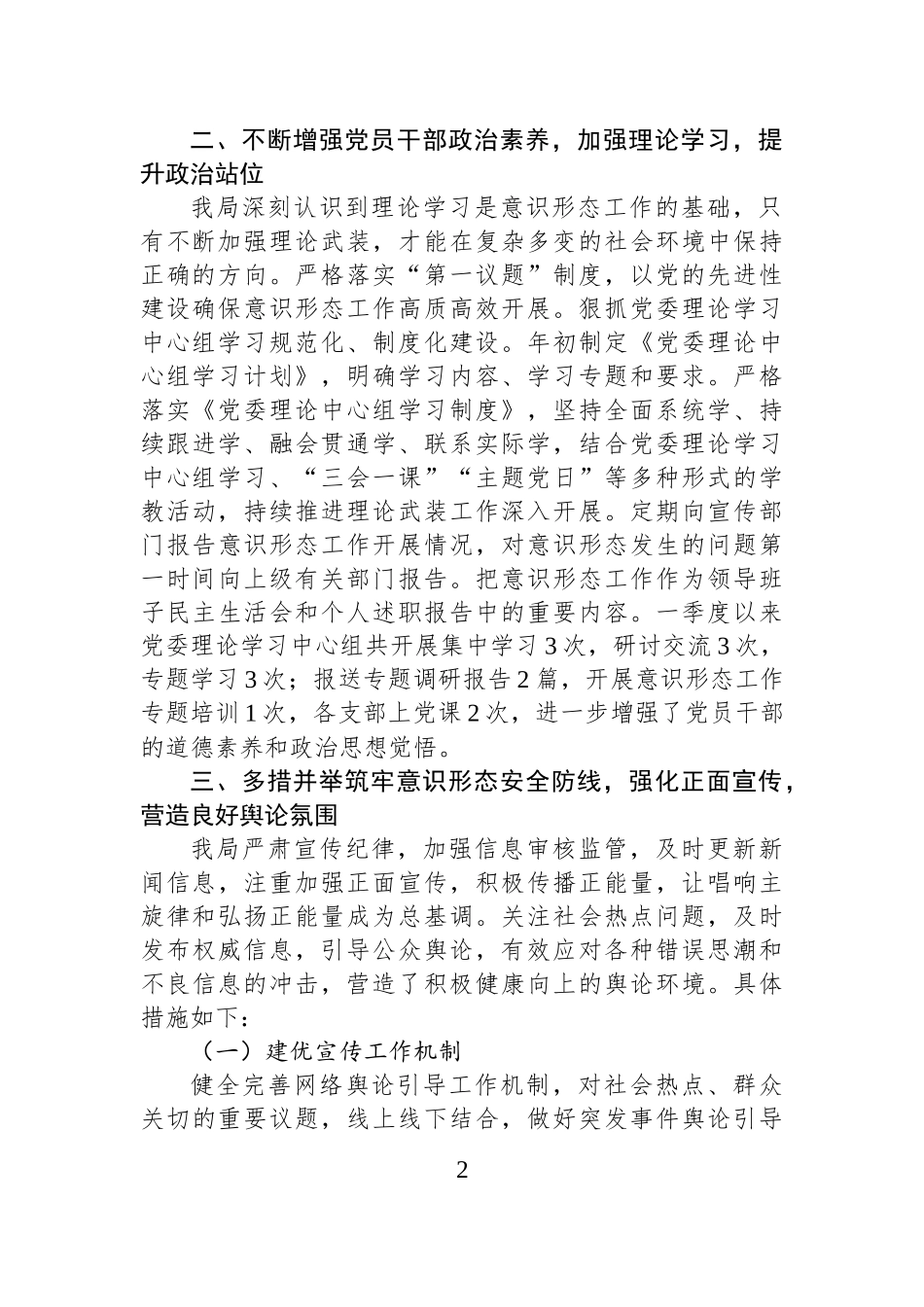 财政局2025年第一季度意识形态工作汇报今年一季度以来,我局意识形态工作坚持以习近平新时代中国特色社会主义思想为指导,将意识形态工作列入重要议事日程,牢牢把握意识形态工作的主导权,始终把意识形态工作作为服务中心大局、保障业务开展的基础性工作来抓好抓实,筑牢党员干部思想阵地,弘扬主旋律,引领服务能力进一步提升。在全国“两会”、“两节”及清明假期等重要时间节点,提前做好预判、统筹推进各项工作,营造了良好的政治环境和积极的舆论氛围。现将2025年第一季度意识形态工作及下一步工作打算汇报如下:一、严格落实意识形态工作责任制,强化组织领导,压实工作责任我局成立意识形态工作领导小组,明确党委书记履行意识形态工作主体责任,将意识形态工作作为党的建设重要内容,纳入党委会议重要议事日程,与党建工作紧密结合,同部署、同落实、同考核。分管领导负责统筹协调指导,其他班子成员严格落实“一岗双责”,抓好分管范围的意识形态工作,对职责范围内的意识形态工作负领导责任。围绕党管意识形态的原则,定期分析研判,推进部署意识形态工作,建立健全意识形态工作责任制,带头做好意识形态工作,健全意识形态工作目标责任考核制度。定期向上级党委汇报意识形态工作开展情况,尤其是重点分析研判意识形态形势,确保苗头性、倾向性问题第一时间发现,及时解决到位。一季度以来,党委共开展意识形态安排部署会议1次,意识形态工作分析研判会议1次,在单位内部通报、传达意识形态领域工作情况,定期向区委宣传部专题汇报1次,推动了意识形态工作深入贯彻落实。1二、不断增强党员干部政治素养,加强理论学习,提升政治站位我局深刻认识到理论学习是意识形态工作的基础,只有不断加强理论武装,才能在复杂多变的社会环境中保持正确的方向。严格落实“第一议题”制度,以党的先进性建设确保意识形态工作高质高效开展。狠抓党委理论学习中心组学习规范化、制度化建设。年初制定《党委理论中心组学习计划》,明确学习内容、学习专题和要求。严格落实《党委理论中心组学习制度》,坚持全面系统学、持续跟进学、融会贯通学、联系实际学,结合党委理论学习中心组学习、“三会一课”“主题党日”等多种形式的学教活动,持续推进理论武装工作深入开展。定期向宣传部门报告意识形态工作开展情况,对意识形态发生的问题第一时间向上级有关部门报告。把意识形态工作作为领导班子民主生活会和个人述职报告中的重要内容。一季度以来党委理论学习中心组共开展集中学习3次,研讨交流3次,专题学习3次;报送专题调研报告2篇,开展意识形态工作专题培训1次,各支部上党课2次,进一步增强了党员干部的道德素养和政治思想觉悟。三、多措并举筑牢意识形态安全防线,强化正面宣传,营造良好舆论氛围我局严肃宣传纪律,加强信息审核监管,及时更新新闻信息,注重加强正面宣传,积极传播正能量,让唱响主旋律和弘扬正能量成为总基调。关注社会热点问题,及时发布权威信息,引导公众舆论,有效应对各种错误思潮和不良信息的冲击,营造了积极健康向上的舆论环境。具体措施如下:(一)建优宣传工作机制健全完善网络舆论引导工作机制,对社会热点、群众关切的重要议题,线上线下结合,做好突发事件舆论引导2工作。(二)筑牢舆论引领阵地明确核心网评员,及时转发正向信息,做好重要节点和敏感时期的值班值守和网络舆论监管工作。在重大政治原则和大是大非问题上,敢于亮剑发声、加强辨析引导,一季度分管领域未出现舆情信息,未发生舆情事件。(三)注重源头管控严格把控信息发布审核关,认真执行“三级审核制”,加强对意识形态领域各类发布信息的审核和把关,及时发现问题和隐患,切实把控好“出口关”。提高舆论舆情敏感度,及时掌握分管领域的舆情动态,结合工作实际,加强舆情研判预警,建立长效机制,切实管控好信息传播途径。四、准确把握网络意识形态领域动向,加强网络管理,维护网络安全我局坚持把加强网络意识形态的管理作为首要任务,正确处理好正面宣传与舆论监督的关系,真正发挥网络宣传的重要作用,坚决守好用好意识形态阵地,引导网民文明上网、理性表达,维护网络空间...
