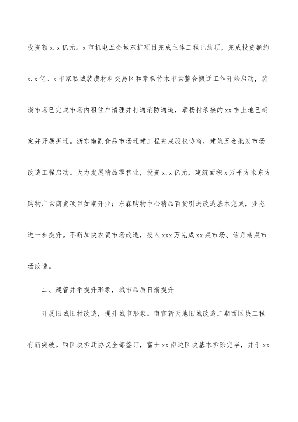 2022年区街道党工委办事处基层党建工作规划(1)xxxx年,xx街道党工委、办事处在区委、区政府的正确领导下,紧紧围绕区委、区政府提出“品质之城”建设发展战略,以旧城旧村改造为着力点,以转型发展为突破口,以党的建设为推动力,努力发展经济,着力改善民生,构建和谐社会,街道经济社会得到又好又快发展。xxxx年,街道实现财政总收入xx.xx亿元,其中地方财政收入x.xx亿元,同比分别增长xx%、xx.x%。现将xxxx年街道工作总结如下。一、攻坚克难加快转型,经济发展提速增效面对今年银根紧缩、企业生产成本上升等不利因素,我们认真分析经济形势,重点围绕促增长、强优势等方面,积极主动提出化解难题的措施和办法,确保全街道经济的平稳增长,实现年度的各项目标任务。工业经济稳步发展。全年实现工业总产值xx.xx亿元,同比增长x.xx%。其中规模上工业生产总值xx.xx亿元,同比增长xx.xx%。工业销售产值xx.xx亿元,其中规上工业销售产值xx.xx亿元,自营出口x.x亿美元,同比增长xx.xx%,工业性投资完成xxxx万。上报省级高新技术企业研究开发中心一家(xx有限公司),区级科技项目x家,培育名牌x家,其中工业企业x家,服务业x家。商贸业转型升级有序推进。xxxx年实现三产增加值xx.xx亿元,同比增长x.xx%,市场成交额xxx.xx亿元,同比增长x.x%,社会消费品零售总额xx.xx亿元,同比增长x.xx%。推进传统市场转型升级。小商品市场改扩建工程,已完成一期主体工程结顶,完成投资额x.x亿元。x市机电五金城东扩项目完成主体工程已结顶,完成投资额约x.x亿。x市家私城装潢材料交易区和章杨竹木市场整合搬迁工作开始启动,装潢市场已完成市场内租住户清理并打通消防通道,章杨村承接的xx亩土地已确定并开展拆迁。浙东南副食品市场迁建工程完成股权协商,建筑五金批发市场改造工程启动。大力发展精品零售业,投资x.x亿元,建筑面积x万平方米东方购物广场商贸项目如期开业;东森购物中心精品百货引进改造基本完成,业态进一步提升。不断加快农贸市场改造,投入xxx万完成xx菜市场、话月巷菜市场改造。二、建管并举提升形象,城市品质日渐提升开展旧城旧村改造,提升城市形象。南官新天地旧城改造二期西区块工程有新突破。西区块拆迁协议全部签订,富士xx南边区块基本拆除完毕,并于xx月x日挂牌成功出让,目前已开始地质勘测。旧城改造二期良一区块取得进展。该区域总xxx户,签订xxx户,协议签订率达xx%。同时加快旧村改造工作步伐,xx村、xx村旧村改造项目已经启动,xx村旧村改造区块土地农转用已经完成,小区安置方案原则已经通过,房屋拆迁协议签订基本完成。xx安置小区安置建筑方案已设计完成,已开始桩基施工。加强基础设施建设,完善城市功能。以xx省道建设为重点,加快道路基础设施建设。xx省道完成全部xx户拆迁户房屋拆迁协议签订,并于x月xx日顺利进场施工,目前已完成打桩并开始填渣,进展顺利。富仕路东延桥梁工程,总投资xxx万,xx月初完成主体工程;投资xx万的下里桥至磨石桥南官岸道路改造完工。加强交通基础设施建设,开辟银座街临时停车场所,解决停车xxx辆,有效缓解城区停车难题。完成xx、xx两村村级供水管网及消防栓改造工作,其中xx村投资xx万、xx村投资xxx万。开展城区排水排污工程改造,完成大操场新村区块截污工程;投资xx万完成xx社区排水改造;投资xx多万建设石浜环山沟排水工程已完工。积极开展“清洁家园、和谐社区”活动。认真组织实施平原绿化项目,完成xx村路泽太公路延伸路段东侧进村xxx米景观道绿化工程,xx村xxxx㎡围村景观林建设,xx泾长度约xxxm河道绿色河道建设等项目建设。申报xx村、田洋王村为区级绿化示范村。积极落实河道疏浚清淤工作,完成xx泾、卖油泾(石浜泾--南官河涵管)、石浜泾等三条河道疏浚、清淤工程。加强对环卫一体化运行的监督,辖区村、社区对环卫保洁工作进行日常评分,运作取得初步成效。以文明城区创建为载体加强城区管理。通过墙体广告、宣传橱窗、宣传标语、宣传车、短信、网站等多种载体开展文明创建宣传。共发放创建宣传小册子xxxxx份,宣传环保袋xxxxx只,活动倡议书xxxx份,促进了文明创建深入民心。点面结合,开展整治,全面加强城...