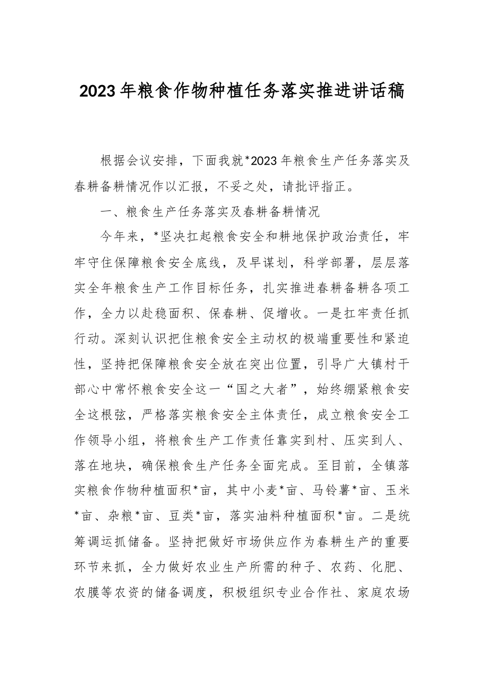 2023年粮食作物种植任务落实推进讲话稿根据会议安排,下面我就*2023年粮食生产任务落实及春耕备耕情况作以汇报,不妥之处,请批评指正。一、粮食生产任务落实及春耕备耕情况今年来,*坚决扛起粮食安全和耕地保护政治责任,牢牢守住保障粮食安全底线,及早谋划,科学部署,层层落实全年粮食生产工作目标任务,扎实推进春耕备耕各项工作,全力以赴稳面积、保春耕、促增收。一是扛牢责任抓行动。深刻认识把住粮食安全主动权的极端重要性和紧迫性,坚持把保障粮食安全放在突出位置,引导广大镇村干部心中常怀粮食安全这一“国之大者”,始终绷紧粮食安全这根弦,严格落实粮食安全主体责任,成立粮食安全工作领导小组,将粮食生产工作责任靠实到村、压实到人、落在地块,确保粮食生产任务全面完成。至目前,全镇落实粮食作物种植面积*亩,其中小麦*亩、马铃薯*亩、玉米*亩、杂粮*亩、豆类*亩,落实油料种植面积*亩。二是统筹调运抓储备。坚持把做好市场供应作为春耕生产的重要环节来抓,全力做好农业生产所需的种子、农药、化肥、农膜等农资的储备调度,积极组织专业合作社、家庭农场种植大户等生产经营主体及早购置春耕物资,广泛引导镇域内*个供销合作社及经销主体参与春耕物资的储备调运,定期抓好余缺调剂,最大限度满足春耕生产需求。至目前,已储备调运化肥*吨、农药*吨、农膜*吨、小麦良种*吨、马铃薯种子*吨,满足了春耕生产需求。三是督促落实抓推进。把粮食安全责任制纳入村级年度目标绩效考核,印发实施落实粮食安全责任制工作方案、考核通知等规范性文件,定期召开工作会议研究推进粮食作物种植面积落实工作,健全完善主要领导抓总分管领导抓面、村党组织书记抓点的工作机制,层层压实责任、逐级督促落实。由镇纪委、农业综合服务中心牵头开展粮食种植任务落实及春耕备耕专项督查,有效传导工作压力,倒逼各村责任落实、措施落实和任务落实。二、当前工作中存在的问题一是部分村对落实粮食安全政治责任没有拿出硬核担当和有效举措,在宣传发动、政策解读、督促落实上还需持续用力。二是马铃薯种子普遍繁育不足,出现了马铃薯种子“一种难求”的现象,影响了农户从事马铃薯生产的积极性。三是部分土地需进行农作物轮作倒茬,对粮食作物种植面积落实存在一定影响。三、下一步工作打算下一步,我镇将进一步提高政治站位、靠实工作责任持续落实小麦、马铃薯、玉米等粮食作物,确保耕地面积播种面积、粮食产量“三个不减”。一是广泛引导凝聚思想共识。坚持思想引领、宣传带动,组织召开全镇种植大户座谈会议,持续加大保障粮食安全的重大意义和各类种粮补贴等惠农政策的宣讲解读,详细分析市场行情和政策扶持认真听取种植大户意见建议,积极回应种植大户困难诉求全面消除种植大户思想顾虑,切实凝聚起全社会关注粮食安全、保障国家粮食安全的思想共识。二是示范引领提升种粮积极性。充分发挥村党支部牵头抓总作用和党员干部带头示范作用,积极鼓励种植大户集约化、规模化种植粮食作物,全力打造特色粮食作物连片种植基地,推动粮食作物种植面积不断增加。常态化开展种植技术培训,大力推广种植优质、高产、多抗品种,着力推动粮食生产经营向产业化、优质化、特色化、品牌化发展,持续提升粮食作物经济效益,激发农民种粮积极性。三是统筹协调抓好春耕备耕。积极协助做好春季农用物资储备工作,全面摸排掌握化肥、农药、农膜、种子等农资的需要量、库存量和货源等情况,及时协调解决经营主体种子调运、化肥购买等方面的困难,严厉打击贩卖假种子、假农药等坑农、害农违法行为,全力协调解决春耕备耕难题,确保高质量完成粮食生产任务和春耕备耕工作。