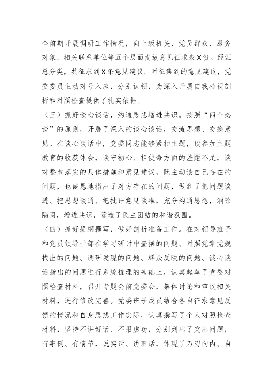 2023年主题教育民主生活会会议召开情况通报按照中央纪委机关、中央组织部、主题教育领导小组统一部署,根据X委主题教育领导小组的具体安排,经过充分准备,请示X委和主题教育第X指导组同意批复后,X党委于8月X日召开了学习贯彻习近平新时代中国特色社会主义思想主题教育专题民主生活会。上级党委主题教育第X指导组X组长到会指导。按照会议要求,与会党委委员认真进行了检视剖析,开展了批评与自我批评,做到了把专题民主生活会作为“学思想、强党性、重实践、建新功”的一次政治体检,检验了主题教育成效。现将有关情况通报如下:一、会前阶段:周密开展部署,保质保量做好准备(一)抓好学习教育,全面打牢思想基础。会前,党委班子认真学习了习近平新时代中国特色社会主义思想和XX大精神,认真学习了《党章》《关于新形势下党内政治生活的若干准则》《中国共产党纪律处分条例》,认真学习习近平总书记在主题教育工作会议上的讲话精神及《习近平著作选读》等规定篇目。通过学习进一步统一了思想,提高了认识,为开好民主生活会打牢了思想基础。(二)抓好意见收集,认真梳理检视问题。根据主题教育专题民主生活会方案要求,围绕聚焦“6个方面”的要求,结合前期开展调研工作情况,向上级机关、党员群众、服务对象、相关联系单位等五个层面发放意见征求表X份。经汇总分类,共征求到X条意见建议。对征集到的意见建议,党委委员主动对号入座,分别认领,为深入开展自我检视剖析和对照检查提供了扎实依据。(三)抓好谈心谈话,沟通思想增进共识。按照“四个必谈”的原则,开展了深入的谈心谈话,交流思想、交换意见。在谈心谈话中,党委同志能够紧扣主题,谈参加主题教育的收获体会,谈守初心、担使命方面的差距不足,谈对整改落实的具体措施和意见建议,既主动谈自己存在的问题,也诚恳地指出了对方存在的问题,做到了把问题谈透、把思想谈通、把批评意见谈准,充分沟通思想,消除隔阂,增进共识,营造了民主团结的和谐氛围。(四)抓好提纲撰写,做好剖析准备工作。在对领导班子和党员领导干部在学习研讨中查摆的问题、对照党章党规找出的问题、调研发现的问题、群众反映的问题、谈心谈话指出的问题进行系统梳理的基础上,认真起草了党委对照检查材料,召开专题会前党委会,集体讨论和审议相关材料,进行修改完善。党委班子成员结合各自征求意见反馈的情况和自身思想工作实际,认真撰写了个人对照检查材料,坚持不讲好话、不报虚功,分别列出了突出问题,有事例、有情节,说实话、讲真话,体现了刀刃向内、自我革命的精神。(五)抓好先行先改,做好先期整改落实。本着积极发现问题、敢于直面问题、切实解决问题的态度,针对征求到的意见建议,分类整理,逐条对照,从人民群众反映最强烈的问题改起,先期解决了部分存在的突出问题,凸显了务实的作风。二、会议阶段:深入检视剖析,真刀真枪自我革命8月X日,党委班子主题教育专题民主生活会在X会议室召开。党委书记X主持会议,党委副书记X、党委委员X、X参加会议,会期X。(一)会议主题鲜明突出。会上,与会成员充分运用主题教育成果,紧扣学习贯彻习近平新时代中国特色社会主义思想这一主线,聚焦“坚持不懈用习近平新时代中国特色社会主义思想凝心铸魂,切实加强党的思想建设,对于推动全党更加深刻领悟”两个确立“的决定性意义,更加自觉增强”四个意识“、坚定”四个自信“、做到”两个维护“,始终在思想上政治上行动上同以习近平同志为核心的党中央保持高度一致”这一主题,按照指导组的具体要求,认真盘点收获、检视问题,进行了深刻剖析。(二)会议程序严密规范。会议共有五项议程:一是书面通报本次民主生活会征求意见情况;二是X同志代表党组班子进行对照检查;三是县处级以上党员领导干部逐人进行个人对照检查,每人发言后,班子其他成员对其发表意见四是指导组领导对民主生活会召开情况进行点评;五是X同志对会议进行总结表态,并就整改落实工作提出具体要求。会议严格按照民主生活程序和市主题教育指导组的要求进行开出了严肃认真的学风,开出了民主团结的作风,开出了求真务实的新风。(三)开展批评求真务实。班...