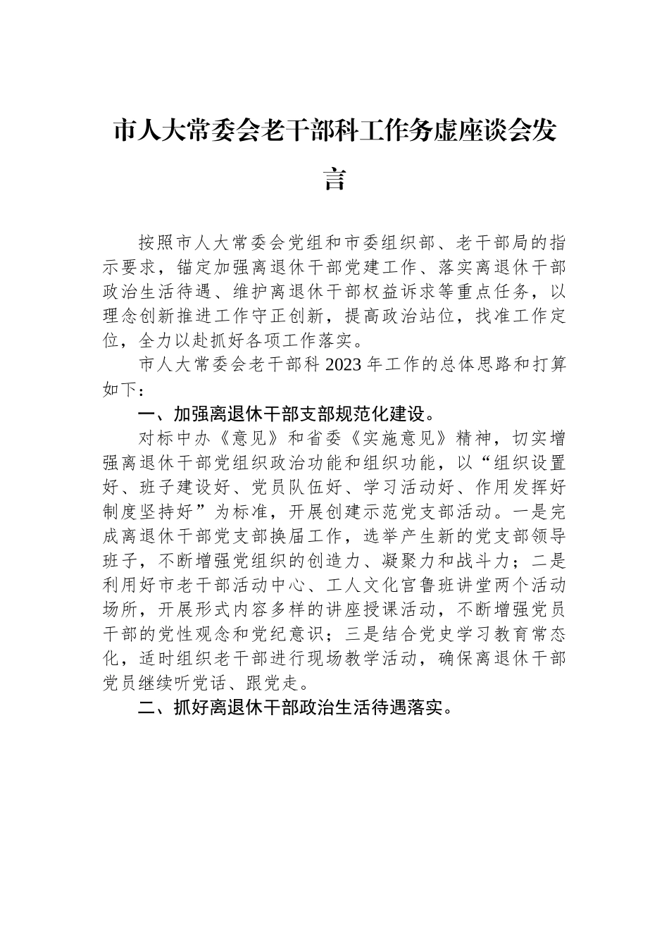 市人大常委会老干部科工作务虚座谈会发言按照市人大常委会党组和市委组织部、老干部局的指示要求,锚定加强离退休干部党建工作、落实离退休干部政治生活待遇、维护离退休干部权益诉求等重点任务,以理念创新推进工作守正创新,提高政治站位,找准工作定位,全力以赴抓好各项工作落实。市人大常委会老干部科2023年工作的总体思路和打算如下:一、加强离退休干部支部规范化建设。对标中办《意见》和省委《实施意见》精神,切实增强离退休干部党组织政治功能和组织功能,以“组织设置好、班子建设好、党员队伍好、学习活动好、作用发挥好制度坚持好”为标准,开展创建示范党支部活动。一是完成离退休干部党支部换届工作,选举产生新的党支部领导班子,不断增强党组织的创造力、凝聚力和战斗力;二是利用好市老干部活动中心、工人文化宫鲁班讲堂两个活动场所,开展形式内容多样的讲座授课活动,不断增强党员干部的党性观念和党纪意识;三是结合党史学习教育常态化,适时组织老干部进行现场教学活动,确保离退休干部党员继续听党话、跟党走。二、抓好离退休干部政治生活待遇落实。对市委办、组织部、老干部局组织的领导干部会、老干部情况通报会、老干部视察等会议活动,第一时间征求意见并反馈情况,确保准确及时高效;对例行的党代会、人代会、年度视察等会议活动,统筹布置会议通知、参会组织、材料准备、用车安排等各个环节,确保不出差错纰漏;对年度党报党刊订阅,根据征求意见和掌握情况,在原则标准范围内进行微调,最大程度地满足老干部的意愿对年度老干部常规体检,在检查项目上优化设置,在跟进诊疗上搞好配合,最大程度地为老干部提供健康保障。三、维护好离退休干部权益和诉求。截至2022年12月,市人大机关共有离退休干部78人,其中县级实职24人,享受县级待遇5人,科级46人。面对日益庞大的老干部队伍,我们克服人员少、任务重的实际认真接好老干部的每一通电话,做好老干部的每一次来访办好老干部的每一项诉求。平时对老干部定期走访慰问,帮助协调看病就医、待遇落实等方面存在的问题;不定期通过送学习资料、打电话、微信平台发信息等形式,与老干部保持沟通联系;年底与市直机关工委、慈善总会等部门对接,为有特殊情况的老干部办理各种补助,帮助他们解决日常生活中的实际困难。