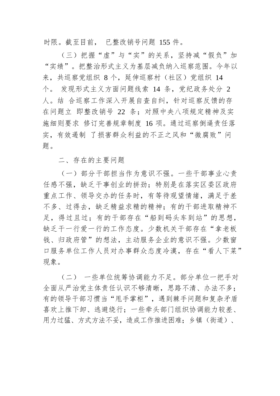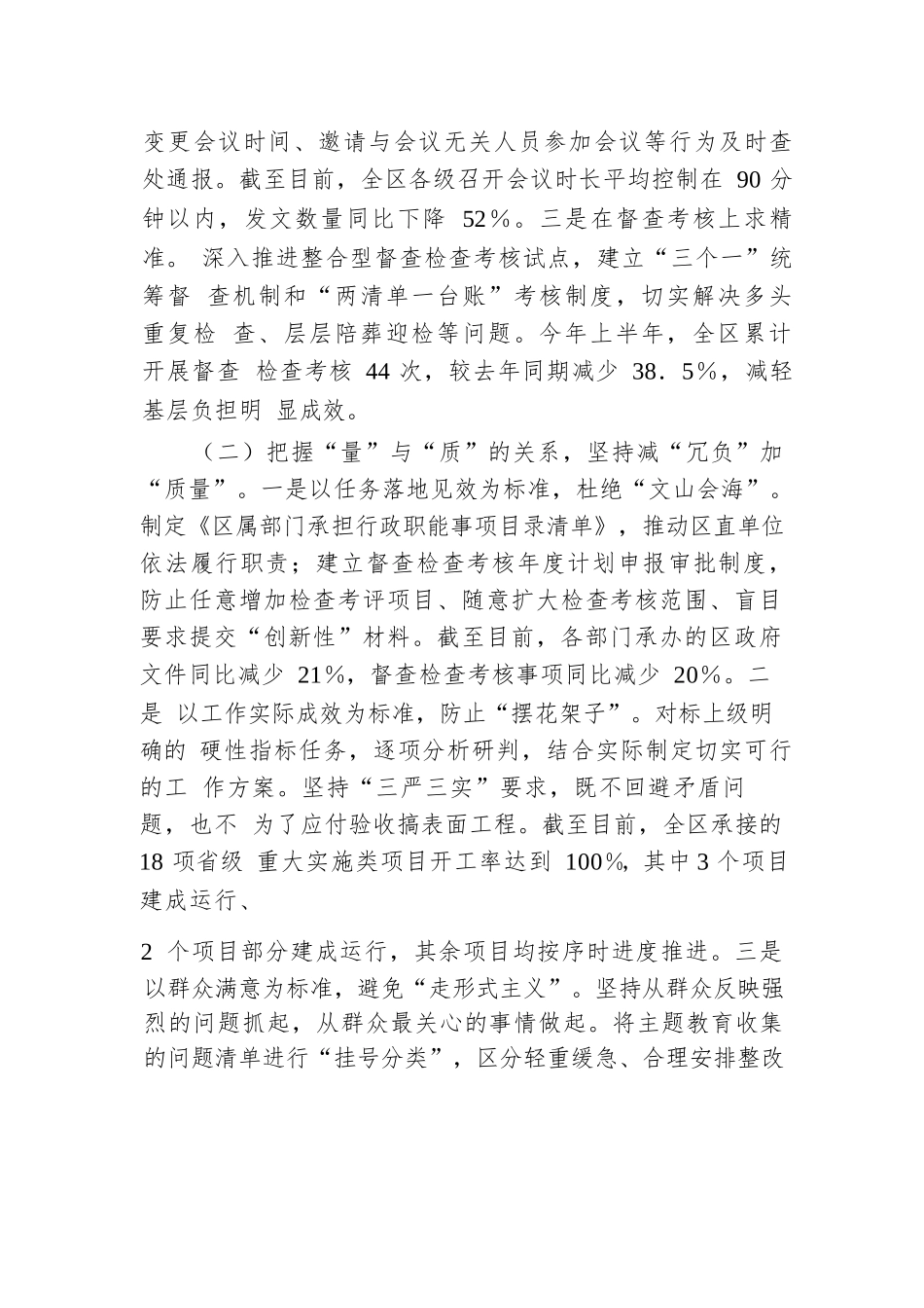 县区整治形式主义为基层减负工作情况总结今年以来,我区牢牢把握“严”和“实”的总基调,始终坚持通过整治形式主义为基层减负,不断深化党风政风评议,激发干部担当作为热情,引导广大党员干部以实际行动贯彻落实好党中央决策部署。在全市重点督查工作中,我区取得第三名的好成绩,其中“基层减负”单项排名全省第一。市对区综合考评中,我区获得“进步奖”,在重点工作考核评价中位居全市前列,展现了良好的发展态势。现将工作情况报告如下:一、工作总体情况(一)把握“速”与“效”的关系,坚持减“懒负”加“效果”。一是在精简会议上下功夫。印发《关于进一步简化会议活动的通知》,严格控制总量和时间,规范议程安排,全区性会议活动平均召开时间比去年减少5个工作日,压缩了30%;严禁各类电子政务平台和微信工作群随意开通整合,凡是可合并的会议、活动全部合并开展,并精简内容,提高质量。截至目前,全区各级召开会议同比下降27%,发文同比下降46%。二是在改进会风上做文章。推行开短会、讲短话、发短文,提高会议实效;提倡现场参会、现场讨论、现场解决;鼓励基层大胆探索创新,采取提前调研、预约考察等灵活方式替代书面汇报;严肃会风会纪,对未经批准擅自变更会议时间、邀请与会议无关人员参加会议等行为及时查处通报。截至目前,全区各级召开会议时长平均控制在90分钟以内,发文数量同比下降52%。三是在督查考核上求精准。深入推进整合型督查检查考核试点,建立“三个一”统筹督查机制和“两清单一台账”考核制度,切实解决多头重复检查、层层陪葬迎检等问题。今年上半年,全区累计开展督查检查考核44次,较去年同期减少38.5%,减轻基层负担明显成效。(二)把握“量”与“质”的关系,坚持减“冗负”加“质量”。一是以任务落地见效为标准,杜绝“文山会海”。制定《区属部门承担行政职能事项目录清单》,推动区直单位依法履行职责;建立督查检查考核年度计划申报审批制度,防止任意增加检查考评项目、随意扩大检查考核范围、盲目要求提交“创新性”材料。截至目前,各部门承办的区政府文件同比减少21%,督查检查考核事项同比减少20%。二是以工作实际成效为标准,防止“摆花架子”。对标上级明确的硬性指标任务,逐项分析研判,结合实际制定切实可行的工作方案。坚持“三严三实”要求,既不回避矛盾问题,也不为了应付验收搞表面工程。截至目前,全区承接的18项省级重大实施类项目开工率达到100%,其中3个项目建成运行、2个项目部分建成运行,其余项目均按序时进度推进。三是以群众满意为标准,避免“走形式主义”。坚持从群众反映强烈的问题抓起,从群众最关心的事情做起。将主题教育收集的问题清单进行“挂号分类”,区分轻重缓急、合理安排整改时限。截至目前,已整改销号问题155件。(三)把握“虚”与“实”的关系,坚持减“假负”加“实绩”。把整治形式主义为基层减负纳入巡察范围。今年以来,共巡察党组织8个,延伸巡察村(社区)党组织14个。发现形式主义方面问题线索14条,党纪政务处分2人。结合巡察工作深入开展自查自纠,针对巡察反馈的存在问题立即整改销号22条;对照中央八项规定精神及实施细则要求修订完善规章制度16项。通过巡察倒逼责任落实,有效遏制了损害群众利益的不正之风和“微腐败”问题。二、存在的主要问题(一)部分干部担当作为意识不强。一些干部事业心责任感不强,缺乏干事创业的拼劲;特别是在落实区委区政府重点工作、领导交办的任务时,有等待观望情绪,满足于差不多、过得去,缺乏精益求精的精神;有的干部进取精神不足,得过且过;有的干部存在“船到码头车到站”的思想,缺乏干一行爱一行的工作态度。少数机关干部存在“拿老板钱、归政府管”的想法,主动服务企业的意识不强。少数窗口服务单位工作人员对办事群众态度冷漠,存在“看人下菜”现象。(二)一些单位统筹协调能力不足。部分单位一把手对全面从严治党主体责任认识不够清晰,思路不清、办法不多;有的领导干部习惯当“甩手掌柜”,遇到棘手问题和复杂矛盾喜欢上推下卸、逃避绕行;一些牵头部门组织协调能力较差、用力过猛、方式方法不妥,造成工作推进困难;乡镇...