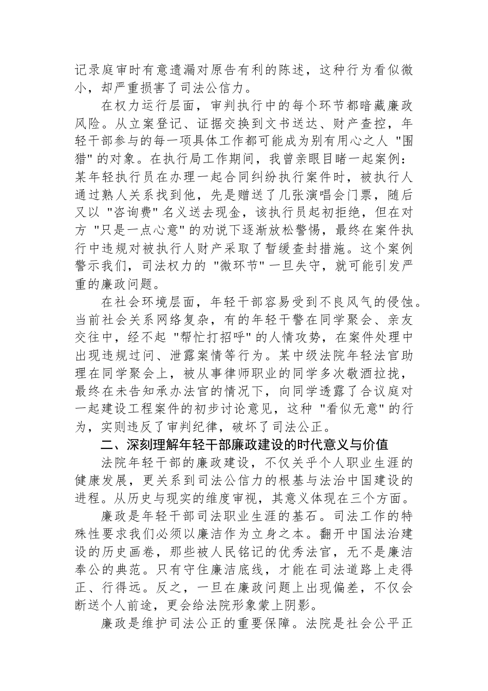 在法院系统年轻干部廉政教育座谈会上的发言材料各位领导、同志们:今天,我们齐聚一堂参加法院系统年轻干部廉政教育座谈会,这既是一次思想上的洗礼,更是一次行动上的鞭策。作为法院队伍的新鲜血液,我们肩负着维护社会公平正义的神圣使命,也面临着形形色色的诱惑与挑战。如何在司法实践中始终保持清正廉洁的政治本色,既是对我们政治品格的考验,也是对职业操守的锤炼。下面,我想结合自身工作体会与思考,从年轻干部面临的廉政风险、廉政建设的重要意义以及筑牢廉政防线的具体路径三个方面与大家交流几点认识。一、清醒认识年轻干部面临的廉政风险与挑战法院工作处于社会矛盾纠纷的集中交汇点,年轻干部虽然大多处于审判执行辅助岗位,但依然身处司法权力运行的关键环节,廉政风险不容忽视。从近年来曝光的一些年轻干部违纪违法案例来看,我们面临的风险挑战主要体现在三个维度。在思想认知层面,部分年轻干部容易陷入"温水煮青蛙"的认知误区。初入法院时,大家往往对腐败行为保持高度警惕,但随着工作年限增长,面对当事人的小恩小惠、律师的"正常"交往,容易产生"小节无害"的麻痹思想。记得刚参加工作时,一位老法官曾告诫我们:"当事人递来的一支烟、一杯茶,背后可能都附着着对裁判结果的期待。"但现实中,有的年轻干警在办理小额民事案件时,认为接受当事人一顿便饭无关紧要,却不知这种"微腐败"正是腐蚀廉洁防线的开端。某基层法院年轻书记员在协助办理民间借贷案件时,多次接受被告方安排的聚餐,最终在记录庭审时有意遗漏对原告有利的陈述,这种行为看似微小,却严重损害了司法公信力。在权力运行层面,审判执行中的每个环节都暗藏廉政风险。从立案登记、证据交换到文书送达、财产查控,年轻干部参与的每一项具体工作都可能成为别有用心之人"围猎"的对象。在执行局工作期间,我曾亲眼目睹一起案例:某年轻执行员在办理一起合同纠纷执行案件时,被执行人通过熟人关系找到他,先是赠送了几张演唱会门票,随后又以"咨询费"名义送去现金,该执行员起初拒绝,但在对方"只是一点心意"的劝说下逐渐放松警惕,最终在案件执行中违规对被执行人财产采取了暂缓查封措施。这个案例警示我们,司法权力的"微环节"一旦失守,就可能引发严重的廉政问题。在社会环境层面,年轻干部容易受到不良风气的侵蚀。当前社会关系网络复杂,有的年轻干警在同学聚会、亲友交往中,经不起"帮忙打招呼"的人情攻势,在案件处理中出现违规过问、泄露案情等行为。某中级法院年轻法官助理在同学聚会上,被从事律师职业的同学多次敬酒拉拢,最终在未告知承办法官的情况下,向同学透露了合议庭对一起建设工程案件的初步讨论意见,这种"看似无意"的行为,实则违反了审判纪律,破坏了司法公正。二、深刻理解年轻干部廉政建设的时代意义与价值法院年轻干部的廉政建设,不仅关乎个人职业生涯的健康发展,更关系到司法公信力的根基与法治中国建设的进程。从历史与现实的维度审视,其意义体现在三个方面。廉政是年轻干部司法职业生涯的基石。司法工作的特殊性要求我们必须以廉洁作为立身之本。翻开中国法治建设的历史画卷,那些被人民铭记的优秀法官,无不是廉洁奉公的典范。只有守住廉洁底线,才能在司法道路上走得正、行得远。反之,一旦在廉政问题上出现偏差,不仅会断送个人前途,更会给法院形象蒙上阴影。廉政是维护司法公正的重要保障。法院是社会公平正义的最后一道防线,而廉洁则是这道防线的基石。年轻干部虽然不是案件裁判的最终决策者,但在证据审查、事实认定等环节的工作直接影响着案件质量。如果在这些环节出现廉政问题,即使裁判结果最终正确,也会让当事人和社会公众对司法公正产生质疑。廉政是推进全面依法治国的基础工程。全面依法治国的关键在于建设一支德才兼备的高素质法治工作队伍。年轻干部作为法院队伍的未来和希望,其廉政素养直接影响着法治中国建设的进程。如果年轻一代在职业生涯初期就能筑牢廉政防线,形成廉洁司法的职业习惯,必将为法治中国建设奠定坚实基础。反之,如果年轻干部队伍中廉政问题频发,不仅会损害司法公信力,更会动摇人民群众对法治的信仰...