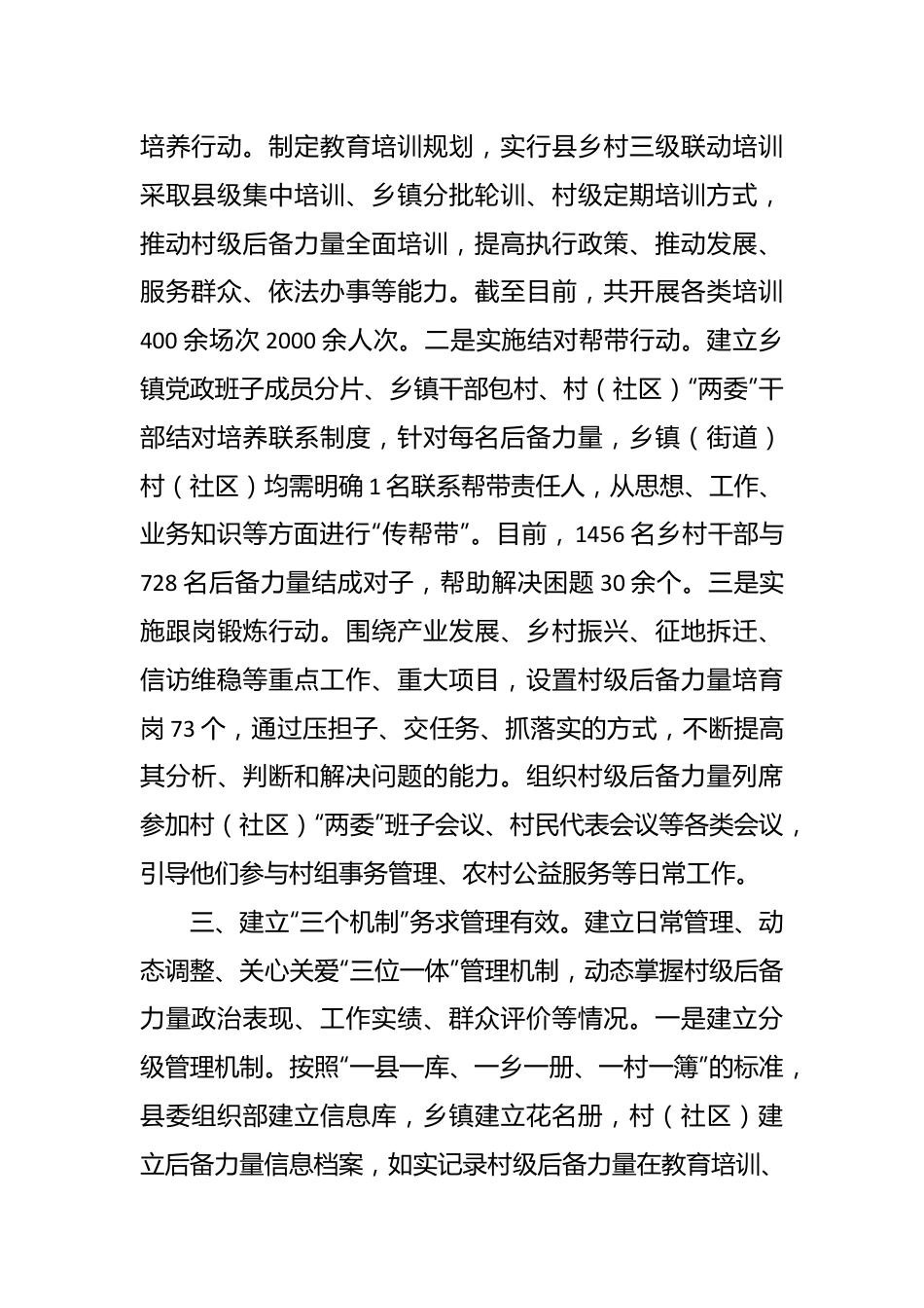经验做法:充实后备力量为乡村振兴提供人才保障今年来,县围绕基层基础“强双基”,深入实施“头雁”工程,着力在人员筛选、培训教育、动态调整、激励使用上下功夫,激活村党组织带头人队伍源头活水,为全面推进乡村振兴提供人才保障。一、把牢“三个关口”确保人选质量。县在后备力量储备上坚持标准条件,严格“推优”程序,注重“下深水”摸排人选,储备村党组织书记后备力量728名,平均每村2名以上。一是把牢人选标准关。坚持好干部标准和“重品行、重实干、重公认”用人导向,明确村党组织书记后备力量选拔资格条件,注重发展集体经济、处理复杂问题、推进改革攻坚能力。二是把牢推荐程序关。采取个人自荐谁愿“备”、群众推荐谁可“备”、党员群众测评谁能“备”的方式,择优确定后备力量,层层把关,注重公认。三是把牢组织审查关。参照村干部任职“八个不能”“六个不宜”负面清单,聚焦政治立场、德才素质、一贯表现、遵纪守法等情况,组织纪检、综治民政等部门开展审查,防止“带病备案”“带病培育”。二、实施“三项行动”提升能力素质。坚持实战实训,加强培养锻炼,帮助后备力量提升能力本领。一是实施联动培养行动。制定教育培训规划,实行县乡村三级联动培训采取县级集中培训、乡镇分批轮训、村级定期培训方式,推动村级后备力量全面培训,提高执行政策、推动发展、服务群众、依法办事等能力。截至目前,共开展各类培训400余场次2000余人次。二是实施结对帮带行动。建立乡镇党政班子成员分片、乡镇干部包村、村(社区)“两委”干部结对培养联系制度,针对每名后备力量,乡镇(街道)村(社区)均需明确1名联系帮带责任人,从思想、工作、业务知识等方面进行“传帮带”。目前,1456名乡村干部与728名后备力量结成对子,帮助解决困题30余个。三是实施跟岗锻炼行动。围绕产业发展、乡村振兴、征地拆迁、信访维稳等重点工作、重大项目,设置村级后备力量培育岗73个,通过压担子、交任务、抓落实的方式,不断提高其分析、判断和解决问题的能力。组织村级后备力量列席参加村(社区)“两委”班子会议、村民代表会议等各类会议,引导他们参与村组事务管理、农村公益服务等日常工作。三、建立“三个机制”务求管理有效。建立日常管理、动态调整、关心关爱“三位一体”管理机制,动态掌握村级后备力量政治表现、工作实绩、群众评价等情况。一是建立分级管理机制。按照“一县一库、一乡一册、一村一簿”的标准,县委组织部建立信息库,乡镇建立花名册,村(社区)建立后备力量信息档案,如实记录村级后备力量在教育培训、实践锻炼、培养使用等过程中的现实表现,定期更新完善后备力量台账。二是建立动态调整机制。每季度对村级后备力量现实表现情况进行评议,通过动态更新、缺一补一等方式,保证村级后备力量素质可靠、整体稳定、人员充足。截至目前,调整优化31名村级后备力量。三是建立关心关爱机制。坚持严管厚爱,整合村(居)民小组长、临聘人员、公益性岗位等,聘用表现优秀的村级后备力量到村工作,切实帮助他们解决困难。截至目前,103名村级后备力量获岗位补贴。四、坚持“三个优先”激励担当作为。按照“边培养、边使用”,对德才兼备、能力突出、群众基础好的村级后备力量优先推荐使用,激励他们干事创业、担当作为。一是优先培养入党。把村级后备力量队伍建设与农村党员队伍建设结合起来,对于政治思想、道德品行、作用发挥、执行纪律等方面优秀的,优先推荐发展成党员,把党员发展成致富能手。截至目前,47名后备力量推荐发展为党员。二是优先选入班子。针对村(社区)“两委”班子成员、村民小组、社会组织负责人出现空缺的,按照人岗相适、群众公认的原则,择优从村级后备力量中推荐选用。截至目前,16名村级后备力量进入“两委”班子,23名村级后备力量推荐为组长、社会组织负责人。三是优先评先选优。在评先选优、“两代表一委员”推选工作中,优先考虑后备力量作为评选推荐对象,发挥示范带动作用,激励认真履职尽责,着力将后备力量培育成为先进典型,将先进典型发展成为后备力量。截至目前,推选14名村级后备力量为“两代表一委员”。