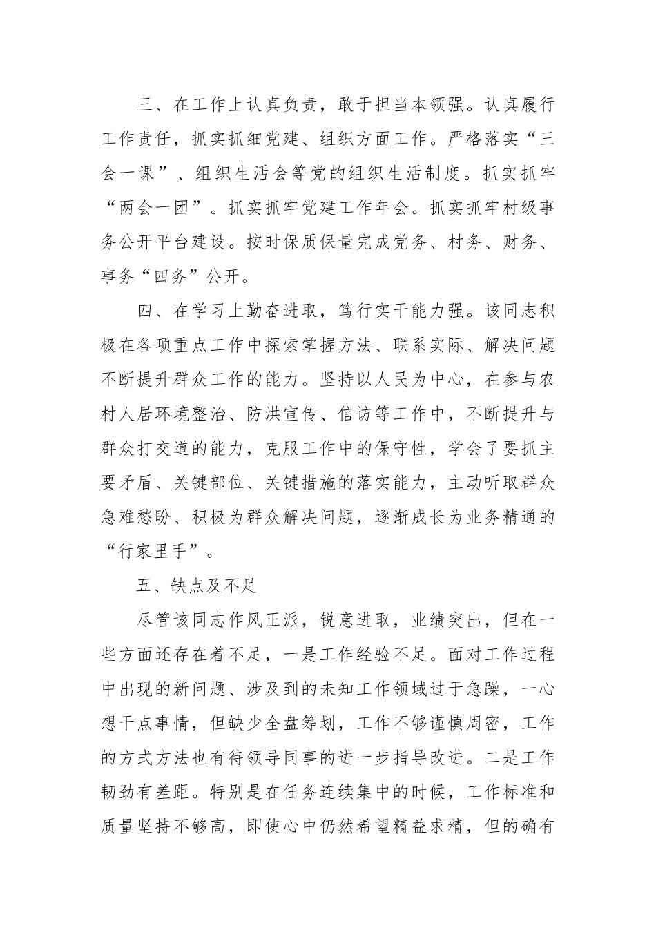 关于某党员同志现实表现材料*,女,汉族,1988年6月出生,*省*市*县人,大学学历,现在单位担任*。该同志认真负责、勤奋进取,较好的完成了各级组织、领导交办的工作任务,为人正派、团结同事,获得了领导、同事们的一致好评。该同志现实表现情况总结如下:一、在政治上绝对忠诚,严于律己党性强。该同志自我约束严格,品行端正,坚持不懈地学习党的基本理论,思想理论水平较高,知识面宽广。在政治上、思想上、行动上自觉同党中央保持高度一致,一丝不苟地落实上级决策部署。在原则问题和重大事件上立场坚定,旗帜鲜明,有较强的政治鉴别力和政治敏锐性。坚守为民服务的理想信念,在工作中以踏踏实实的工作作风面对工作,以实际行动维护干部形象,真正做到讲党性、重品行、作表率。二、在思想上紧跟核心,以学增智信念强。该同志坚持学思用贯通、知信行统一,认真学习贯彻党的二十大精神等重要会议精神及论述,在多次专题培训班、公文写作班中学深悟透提升新能力;在“走遍村镇”调研、“走遍基层党建示范点”观摩活动中学习亮点开拓新眼界;积极学习“千万工程”经验等先进做法经验,因地制宜得到解决问题新方法。不断以理论知识武装头脑,以实践经历锻炼自身。三、在工作上认真负责,敢于担当本领强。认真履行工作责任,抓实抓细党建、组织方面工作。严格落实“三会一课”、组织生活会等党的组织生活制度。抓实抓牢“两会一团”。抓实抓牢党建工作年会。抓实抓牢村级事务公开平台建设。按时保质保量完成党务、村务、财务、事务“四务”公开。四、在学习上勤奋进取,笃行实干能力强。该同志积极在各项重点工作中探索掌握方法、联系实际、解决问题不断提升群众工作的能力。坚持以人民为中心,在参与农村人居环境整治、防洪宣传、信访等工作中,不断提升与群众打交道的能力,克服工作中的保守性,学会了要抓主要矛盾、关键部位、关键措施的落实能力,主动听取群众急难愁盼、积极为群众解决问题,逐渐成长为业务精通的“行家里手”。五、缺点及不足尽管该同志作风正派,锐意进取,业绩突出,但在一些方面还存在着不足,一是工作经验不足。面对工作过程中出现的新问题、涉及到的未知工作领域过于急躁,一心想干点事情,但缺少全盘筹划,工作不够谨慎周密,工作的方式方法也有待领导同事的进一步指导改进。二是工作韧劲有差距。特别是在任务连续集中的时候,工作标准和质量坚持不够高,即使心中仍然希望精益求精,但的确有时不够严谨细致,不能做到滴水不漏、万无一失,存在失误现象。