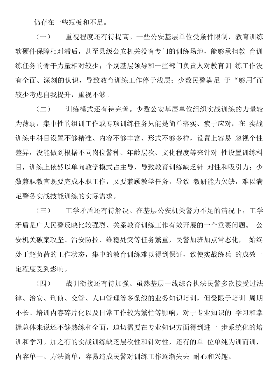 关于公安队伍能力素质建设队伍管理及的调研报告范文(三篇)关于公安队伍能力素质建设的调研报告篇一近年来,全市公安机关立足新形势新任务新挑战新考验,始终保持“本领恐慌"的忧患意识,不断提升公安机关政治能力、职业素养、专业水平和实战本领,着力锻造“四个铁一般”过硬XX公安铁军,为公安机关忠实履行新时代使命任务提供坚强保证。一、具体实践和经验成效全市公安机关着力加强政治建设,深入学习贯彻党的二十大精神,扎实开展学习贯彻习近平新时代中国特色社会主义思想主题教育,深化队伍教育整顿,持续强化“我为群众办实事''“我为基层解难题"等实践活动,纵深推进全警实战大练兵,宗旨意识进一步加强、政治生态进一步优化、能力素质进一步提升、纪律作风进一步严明、干事创业氛围进一步浓厚,打造了公安教育训练的新高地,形成了全警强素质、提能力的新风尚。(一)构建了实战练兵新思路。突出练兵先练“长",组织各级领导干部开展政治轮训、培训考核、比武竞赛,调查研究,切实形成大项任务冲在前、关键时刻站排头、日常工作干在先的实干担当氛围。突出基础训练、身体素质、心理健康“三维”发力,通过持续开展应知应会基本建论法规、适岗需求基本操作技能“双达标''和“健康警营"活动,大力建设心理服务团队,有效调动了广大民警辅警投身实战练兵的训练热情。突出“科学分类、精准施策、追赶超越"工作,科学制定量化考核标准,开展市、县两级公安机关教育训练画像评估,持续推进实战训练工作追赶超越高质量发展。(二)建设了警务专业新队伍。广大民警辅警履行岗位职责能力普遍提高,业务技能更加精湛,在各领域培养造就一大批适应新时代要求、发挥关键作用的专门人才和行家里手。从领导干部、先进典型、业务骨干、标兵能手中层层遴选,建成市、市、县三级教官库。目前,全市共有各级各类专兼职教官XXX人,经过培训认证的小教员达XXX余名,先后有X个集体和XX名个人被评为部级大练兵“标兵集体”“标兵个人(三)研发了实战实训新教程。通过开展优秀实战专题课程和“微课程”制作评比活动,研发编写执法规范、警务实战、心理建设等教案教程。组织部、市、市级培训教官制作拍摄重大安保勤务及实战技能、疫情防控系列视频、微课程,让一线民警利用工作间隙和业余时间,随时随地开展自主式学习训练。全市公安机关累计编撰训练教材XXX本、手册指引XXX册、案例汇编XXX套,制作微课慕课视频片XXX部,教学训练教材建设取得实质性突破。(四)取得了实战训练新成果。先后有X个集体和X名个人荣获全国公安机关教育训练工作成绩突出集体、先进个人;XX个集体、XX名个人受到全国公安系统英模模范立功集体表彰大会表彰;XXX个集体和XXX名个人在公安部举办的比武竞赛中斩获荣誉;首创的“健康警营”理念被公安部写入《公安政治工作“十四五"规划》,XXX个创新技战法被公安部收录推广,XXX个经验做法被市级以上媒体宣传报道。练兵工作有力助推了北京冬奥会、二十大安保维稳、中国-中亚峰会安保和疫情防控等一系列重大安保任务的圆满完成。二、存在的短板和不足近年来,全市公安机关始终将练兵的“准星”瞄准实战的“靶心”,坚持“干什么练什么、缺什么补什么'‘的要求,以最高标准、最强组织、最实举措、最佳状态,扎实有序深入推进全警实战练兵,取得了一定的成效,但仍存在一些短板和不足。(一)重视程度还有待提高。一些公安基层单位受条件限制,教育训练软硬件保障相对滞后,甚至县级公安机关没有专门的训练场地,能够承担教育训练任务的骨干力量相对较少;个别基层领导和一些部门负责人对教育训练工作没有全面、深刻的认识,导致教育训练工作停于浅层;少数民警满足于“够用"而较少考虑自我提升,重视不够。(二)训练模式还有待完善。少数公安基层单位组织实战训练的力量较为薄弱,集中性的组训工作或专项训练任务只能是简单落实、疲于应对;在实战训练中科目设置不够精准、内容不够丰富、形式不够多样,设置上容易忽视个性差异,没能做到根据不同岗位警种、年龄层次、文化程度等来针对性设置训练科目,训练上依然以单向教学模式占主导,导致教育训练缺乏针对性和吸引力;少数...