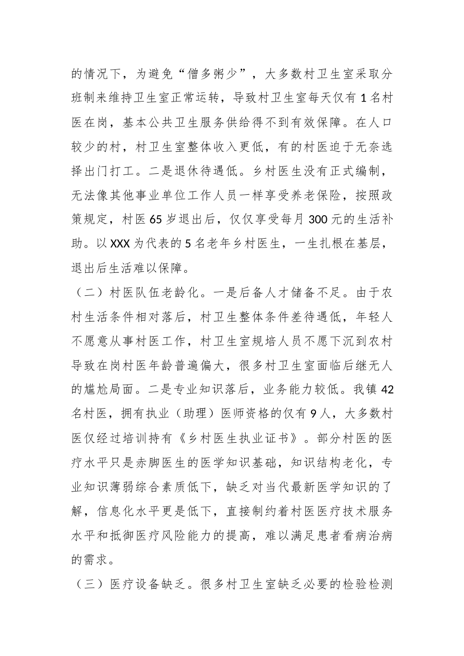 关于乡村医生医疗队伍建设情况的调研报告一、基本情况近年来,随着“健康中国”战略的提出和“人才强卫”战略的深入推进,基层卫生事业迎来了新的发展机遇,XX镇公共卫生事业也得到了较快发展,X个村(居)均各有一所村卫生室,共有在职村医42人,其中70岁以上5人,60岁以上3人,50岁以上23人。村卫生室和乡村医生成为了农村村民健康的“守门人”,是辖区留守儿童和老年人保持身体健康的希望,是辖区救死扶伤的关键性人物。农村老人、残障人员等出行困难群众生病,一个电话,乡村医生总能第一时间赶到病人家中进行诊治,为患者提供及时救治。二、存在问题与困难当前,XX镇农村医疗卫生服务能力基本满足农民群众看病需求,但随着医改的不断深入和人口老龄化加剧,村医队伍建设也存在着一些问题。(一)薪酬待遇问题。一是经济收入低。随着医改的深入基本药物目录内药品零差价销售,村医仅靠基本公共卫生服务费、基本医疗服务费,以及药品零差价补助难以维持生计。在人口较多的村,村卫生室配有多名村医,在整体收入有限的情况下,为避免“僧多粥少”,大多数村卫生室采取分班制来维持卫生室正常运转,导致村卫生室每天仅有1名村医在岗,基本公共卫生服务供给得不到有效保障。在人口较少的村,村卫生室整体收入更低,有的村医迫于无奈选择出门打工。二是退休待遇低。乡村医生没有正式编制,无法像其他事业单位工作人员一样享受养老保险,按照政策规定,村医65岁退出后,仅仅享受每月300元的生活补助。以XXX为代表的5名老年乡村医生,一生扎根在基层,退出后生活难以保障。(二)村医队伍老龄化。一是后备人才储备不足。由于农村生活条件相对落后,村卫生整体条件差待遇低,年轻人不愿意从事村医工作,村卫生室规培人员不愿下沉到农村导致在岗村医年龄普遍偏大,很多村卫生室面临后继无人的尴尬局面。二是专业知识落后,业务能力较低。我镇42名村医,拥有执业(助理)医师资格的仅有9人,大多数村医仅经过培训持有《乡村医生执业证书》。部分村医的医疗水平只是赤脚医生的医学知识基础,知识结构老化,专业知识薄弱综合素质低下,缺乏对当代最新医学知识的了解,信息化水平更是低下,直接制约着村医医疗技术服务水平和抵御医疗风险能力的提高,难以满足患者看病治病的需求。(三)医疗设备缺乏。很多村卫生室缺乏必要的检验检测设备,行医却仅靠“老三件”:听诊器、血压计、体温计农村医护人员对医疗设备专业知识知之甚少,很多不知如何使用设备来达到诊断和诊疗的目的。(四)农医报销问题。由于很多乡村医生所在的卫生站不能纳入新型农村合作医疗,老百姓宁愿跑个多小时的山路到大医院去看头疼感冒的小病,为了上大医院能够报销。即便有些能报销的村卫生站,也由于缺少电脑联网,报销的程序变得异常复杂,使村医望而却步。三、意见建议(一)针对乡村医生队伍年龄结构老化的问题,可参照大学生村官的做法,采取定向培养方式,每年确定一定数量的镇卫生院聘用编制,面向社会公开考录,作为镇卫生院驻村医生,与其签订长期合约,确保留住人才,有人可用为村医队伍注入新鲜血液,增添新的活力。(二)要切实提高乡村村医待遇。参照本地的收入水平,相应提高乡村医生福利待遇,确保留得住人。由政府财政承担村医的基本工资,建议为2000-3000元/月,同时为村医购买企业职工养老保险。(三)根据农村实际,适当配备适合农村的医疗设备,如心电图、全科诊疗仪、血尿常规及急救设备等,这样不但减少了安全隐患,同时也方便了百姓就医,真正实现分级诊疗的目的。(四)提高乡村医生的实用技能和水平,开展不同层面的岗位培训;积极开展乡村医生学历教育等工作,促进乡村医生向执业(助理)医师转化。同时,还要借助村卫生室信息化的平台,提高乡村医生服务的效率;推动开展综合改革,转变乡村医生服务模式,不断提高乡村医生为农民群众服务的实际本领和水平。