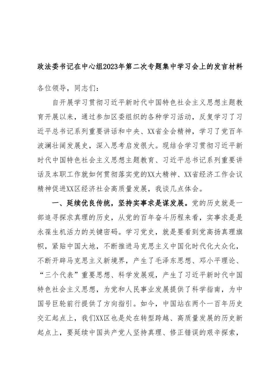 政法委书记在中心组2023年第二次专题集中学习会上的发言材料各位领导,同志们:自开展学习贯彻习近平新时代中国特色社会主义思想主题教育开展以来,通过参加区委组织的各种学习活动,反复学习了习近平总书记系列重要讲话和中央、XX省全会精神,学习了党百年波澜壮阔发展史,深入思考启发很大。现结合学习贯彻习近平新时代中国特色社会主义思想主题教育、习近平总书记系列重要讲话及本职工作就如何贯彻落实党的XX大精神、XX省经济工作会议精神促进XX区经济社会高质量发展,我谈几点体会。一、延续优良传统,坚持实事求是谋发展。党的历史就是一部追寻探求真理的历史,从党的百年奋斗历程来看,实事求是是永葆生机活力的关键密码。学习党史,就是要看到党高扬真理旗帜,紧贴中国大地,不断推进马克思主义中国化时代化大众化,不断开辟马克思主义新境界,产生了毛泽东思想、邓小平理论、“三个代表”重要思想、科学发展观,产生了习近平新时代中国特色社会主义思想,为党和人民事业发展提供了科学指南,为中国号巨轮前行提供了方向指引。如今,中国站在两个一百年历史交汇起点上,我们XX区也是处在转型跨越、高质量发展的历史新起点上,要延续中国共产党人坚持真理、修正错误的艰辛探索,是解放思想、实事求是的科学方法,深入思考如何立足全区实际提高科技创新实力,合理运用全区发展资源,融入全区、全市发展大盘子,推进“十四五”规划和二〇三五年远景目标逐个落地见效,确保将党史的思想伟力转化为XX区经济社会健康平稳发展的不竭动力。二、忠诚履职担当,坚持人民立场强党性。中国共产党根基在人民、血脉在人民、力量在人民。全心全意为人民服务是我们党的根本宗旨。习近平总书记谈到,“人民对美好生活的向往,就是我们的奋斗目标”,正是中国共产党人始终把人民放在心中最高位置,才取得了抗击新冠肺炎疫情的战略胜利,创造了消除绝对贫困的人间奇迹,赢得了人民群众的衷心拥护,汇聚了民族复兴的磅礴力量。学习党史,就要看到中国共产党的人民观,是真挚的人民观,是无私的人民观,是广泛的人民观,是彻底的人民观。当前,是全区巩固拓展脱贫攻坚成果同乡村振兴有效衔接的巩坚年,人民群众发展呼声高涨,我们在抗击新冠疫情、防汛减灾、防火灭火、安全维稳等工作上积累了宝贵经验,更要积极引导广大党员干部牢固树立为民意识,敢于担当、善于成事。要在工作一线识别锻炼发展党员,在基层一线磨炼党员干部党性修养,识别使用一批勇挑重担、敢闯敢干,顶着压力,担着风险全力推进XX区经济发展的干部。三、强化忧患意识,坚持与时俱进立潮头。在学习贯彻党的XX大精神开局之年,习近平总书记作重要讲话再次告诫全党,新的征程上,必须增强忧患意识、始终居安思危,强调要“深刻认识我国社会主要矛盾变化带来的新特征新要求,深刻认识错综复杂的国际环境带来的新矛盾新挑战”,学习党史,就要看到,我们党能在内忧外患中诞生,在磨难挫折中成长,在战胜风险挑战中壮大,正是因为保持深沉的忧患意识。学习党史也要看到,我们党能洞察时代大势、把握历史主动,在不同历史时期,均为革命、建设、改革找准方向。正是因为中国共产党顺应潮流与时俱进,在时代洪流中敢闯敢试、锐意创新。推动高质量发展必须强化忧患意识和与时俱进的时代观。一方面要认识到全区新型工业化、新型城镇化、信息化、农业现代化建设均还处于攻坚期,产业体系不优、链条不长、支撑不强,核心竞争力弱,发展不平衡、不充分仍然是XX区最实际、最突出的矛盾,教育医疗等民生社会事业发展还有较大短板,巩固特殊社会问题治理成果任务艰巨;另一方面也要看到,“一带一路”建设、XX经济带发展向海经济等XX省经济战略深入实施,为XX区加快资源优势向产业优势和经济优势转换带来了重大机遇,搭建了重要平台。在发展大流中,不进则退,要紧抓快上,把握机遇,对于城市经济发展要及时适应新常态,立足长远,从城市发展功能定位体现城市特色,从发展规划着手,协调好经济发展区和高品质生活区的关系推动一二三产业产业加快升级,互融发展。四、强调力到实处,坚持真抓实干“动起来”。主题教育的目的是统一思想、凝聚力量...