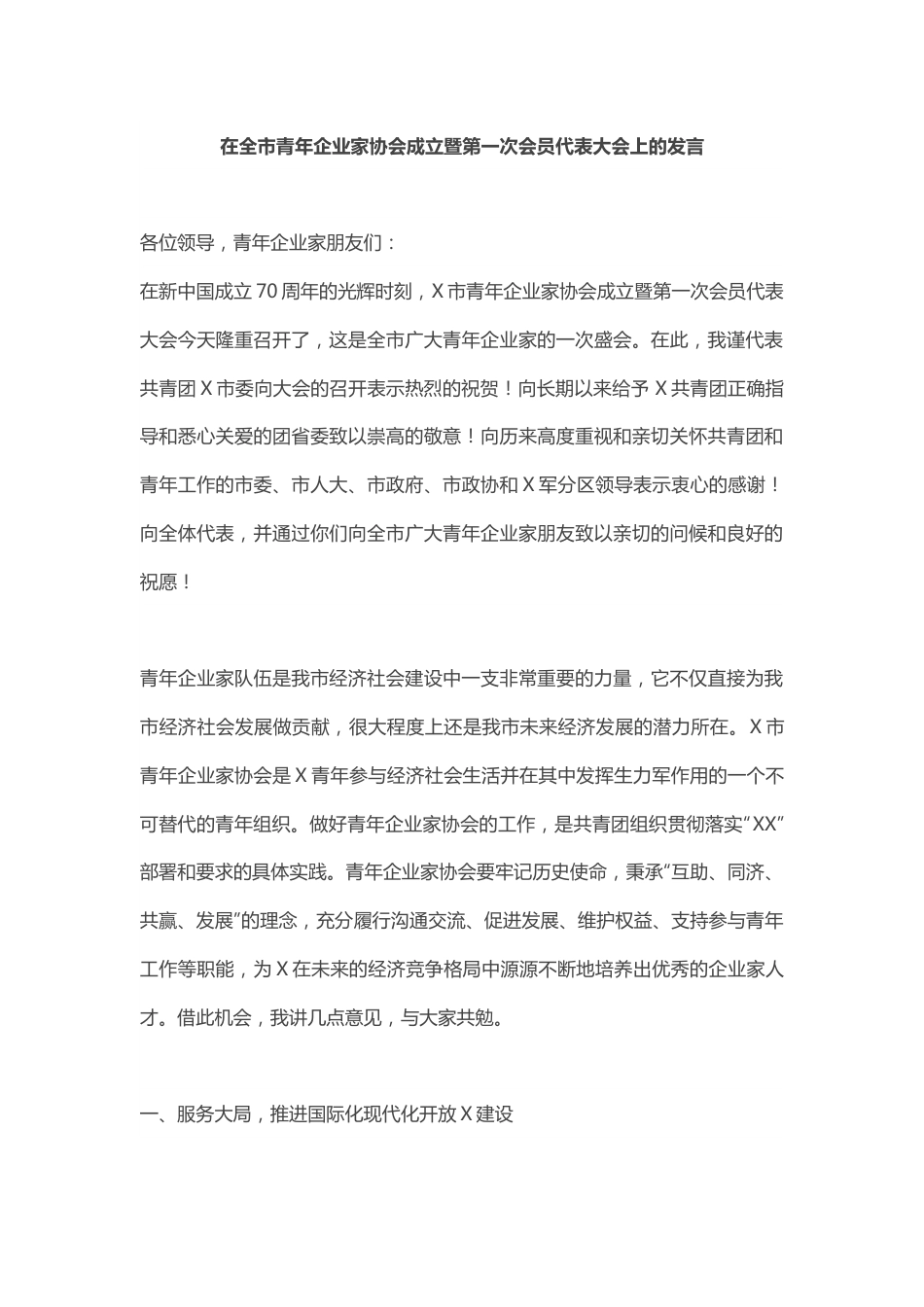 在全市青年企业家协会成立暨第一次会员代表大会上的发言各位领导,青年企业家朋友们:在新中国成立70周年的光辉时刻,X市青年企业家协会成立暨第一次会员代表大会今天隆重召开了,这是全市广大青年企业家的一次盛会。在此,我谨代表共青团X市委向大会的召开表示热烈的祝贺!向长期以来给予X共青团正确指导和悉心关爱的团省委致以崇高的敬意!向历来高度重视和亲切关怀共青团和青年工作的市委、市人大、市政府、市政协和X军分区领导表示衷心的感谢!向全体代表,并通过你们向全市广大青年企业家朋友致以亲切的问候和良好的祝愿!青年企业家队伍是我市经济社会建设中一支非常重要的力量,它不仅直接为我市经济社会发展做贡献,很大程度上还是我市未来经济发展的潜力所在。X市青年企业家协会是X青年参与经济社会生活并在其中发挥生力军作用的一个不可替代的青年组织。做好青年企业家协会的工作,是共青团组织贯彻落实“XX”部署和要求的具体实践。青年企业家协会要牢记历史使命,秉承“互助、同济、共赢、发展”的理念,充分履行沟通交流、促进发展、维护权益、支持参与青年工作等职能,为X在未来的经济竞争格局中源源不断地培养出优秀的企业家人才。借此机会,我讲几点意见,与大家共勉。一、服务大局,推进国际化现代化开放X建设青企协要紧紧围绕省委和市委的统一部署,积极引导广大青年企业家在“四化两型XX”和国际化现代化开放X建设的伟大实践中充分发挥好生力军作用。要积极促进经济建设。围绕青年创新创业,持续开展“青春创业加速度”活动,鼓励青年投身创业实践,为构建现代产业体系献智献力;通过开展“青年创新创效”和“青春建功新农村”等活动,为推动自主创新、调整产业结构、加快转变经济发展方式贡献力量;把握“一区一点一片”建设的机遇,钻研政策、用活政策,为XX承接产业转移示范区建设作贡献。要主动参与生态文明建设。引导广大青年企业家加大节能减排力度,降低企业发展的环境成本,建设资源节约型和环境友好型企业;组织青年企业家积极投身绿色环保事业,参与“国家森林城市”创建,营造X秀美山川;组织青年企业家参与垃圾分类等环保活动,践行绿色低碳理念。要大力推动和谐X建设。引导广大青年企业家增强社会责任感,牢固诚信意识,带头弘扬社会新风;树立志愿服务精神,把志愿文化根植于企业文化之中,打造有社会责任感的企业;积极参与促进就业尤其是促进青年就业的工作,参与保护母亲河、希望工程等青少年发展和扶贫济困等社会公益事业,为促进社会和谐做贡献。二、着眼长远,建设国际化现代化青年企业家人才队伍青企协要立足青年企业家的根本需求,积极为会员提供学习、创业、成才、发展、维权等服务,努力培养在省内外有影响力的优秀青年企业家。要服务青年企业家学习交流的需求,积极开展“引进来”、“走出去”双向交流活动,建立经常性的学习交流机制,密切青年企业家与其他地区特别是沿海发达地区企业家的联系;创新学习交流方式,通过举办经济形势报告会、经济政策研讨会和产业发展论坛等方式,促进青年企业家之间、青年企业家与各领域专家学者之间的学习交流,不断增强青年企业家自身成长与企业发展的能力。要服务青年企业家创新发展的需求,通过开展“青年科技创新行动”,举办“青年岗位能手”评选、“青工技能大比武”、“两争当、两提高”等活动,培育创新型人才,增强企业的自主创新能力,提高企业的核心竞争力;帮助青年企业家发展事业,探索有利于会员合作的途径和方式,解决青年企业家在事业发展中存在的困难和问题。要服务青年企业家有序参与政治生活的需求,积极为青年企业家政治参与搭平台、引路子,把青年企业家团结在党和政府的周围,引导他们在促进企业发展的过程当中有效支持和参与党的青年工作;要主动帮助青年企业家加大企业的党建和团建力度,充分利用党团组织建设提升企业的创造力、凝聚力和影响力;要大力倡树优秀青年企业家典型,做好优秀青年企业家的举荐工作,开展优秀青年企业家评选活动,在全社会营造关心、支持青年企业家成才发展的良好氛围。三、开拓创新,打造国际化现代化青年企业家组织青企协是青年企业家的群众组...